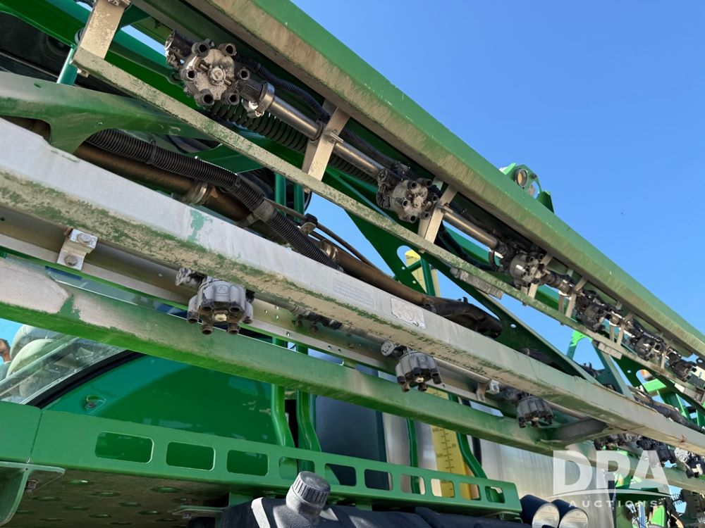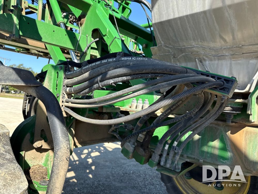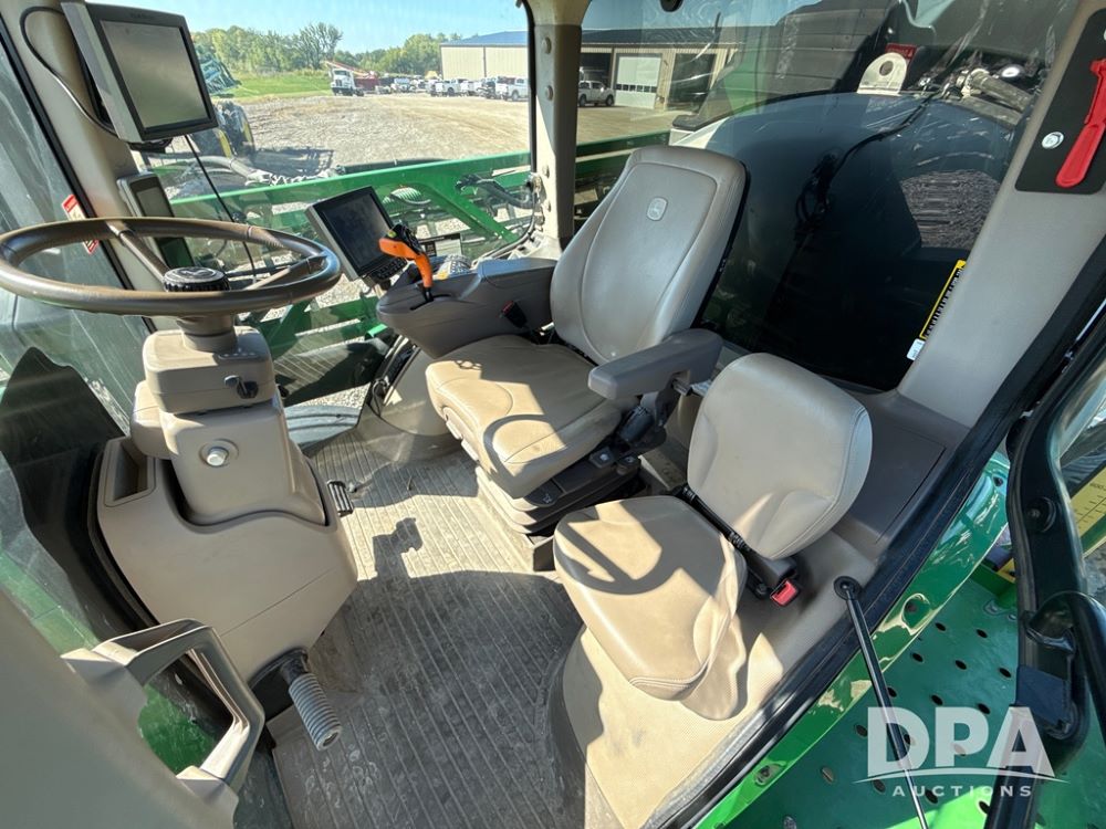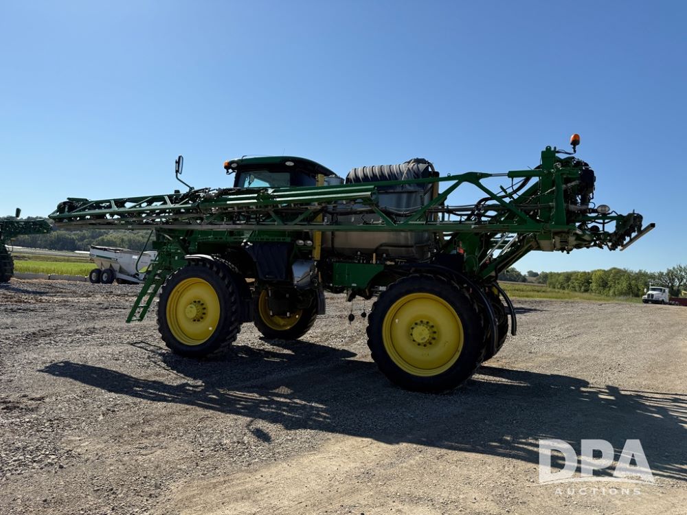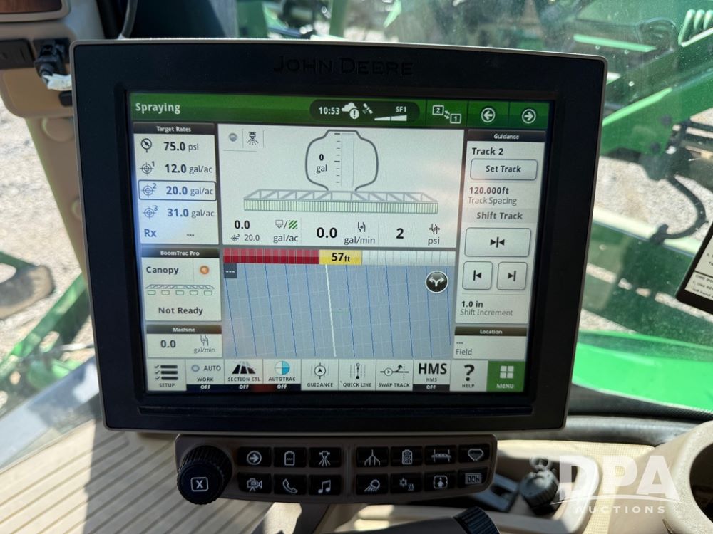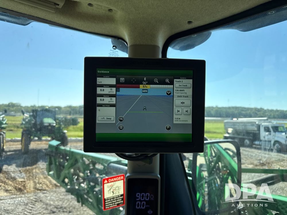 2021 John Deere R4044 Sprayer (NP6169), John Deere diesel engine, hydrostatic transmission, heat, air conditioning, Am/Fm radio, leather driver and buddy seat, 1,200 gallon stainless steel liquid system, 120' boom, ExactApply nozzles, top mount poly rinse tank, stainless steel chemical inductor, automatic solution control, 380/90R46 tires, fenders, front fill option, StarFire 6000 globe, John Deere monitor with additional extension monitor, shows 2,084 hours.