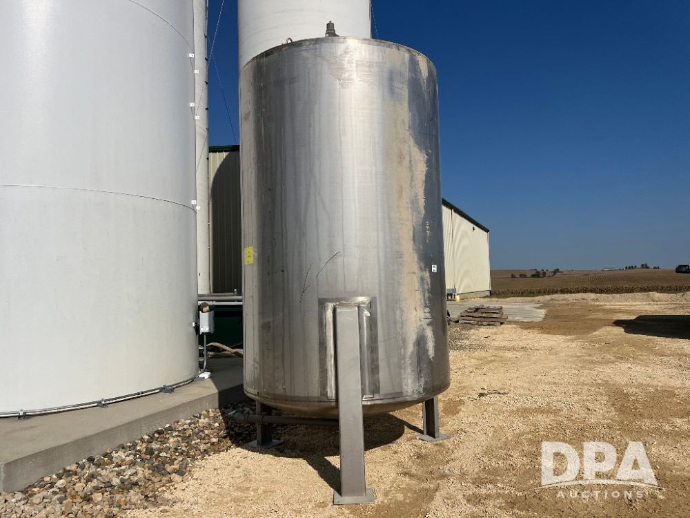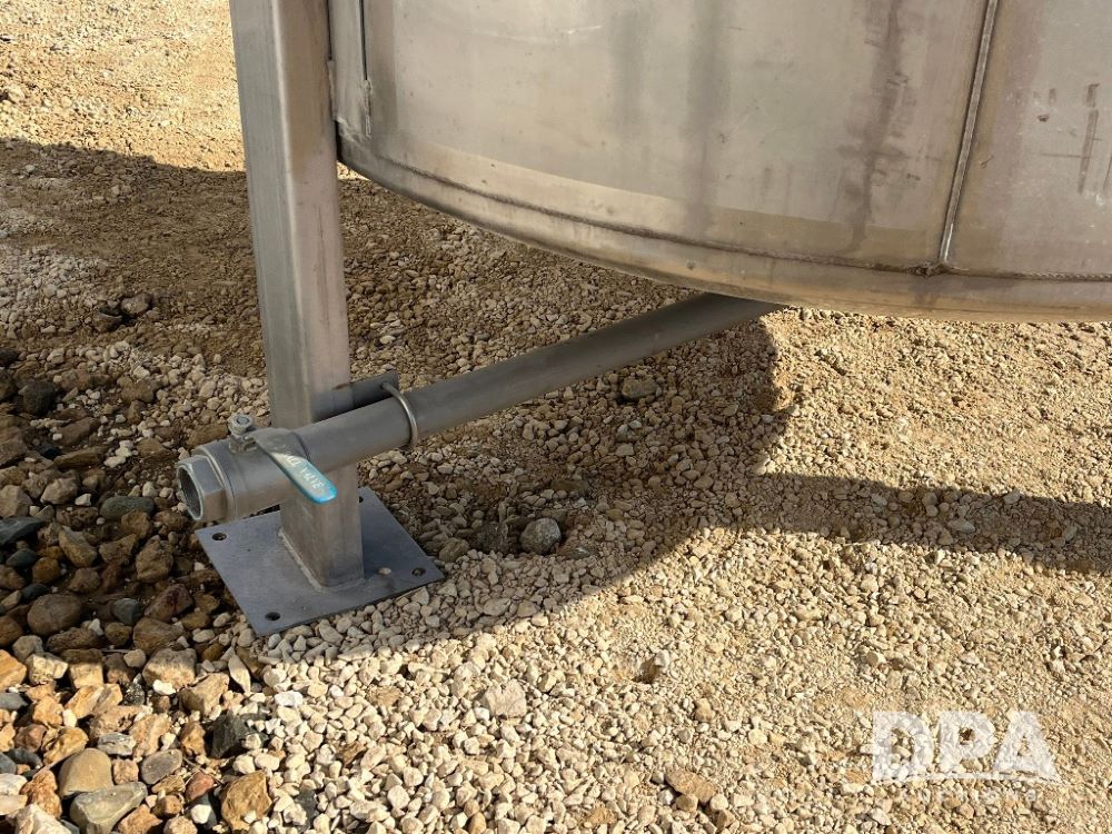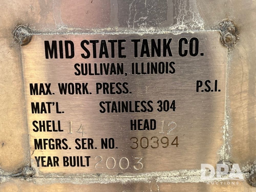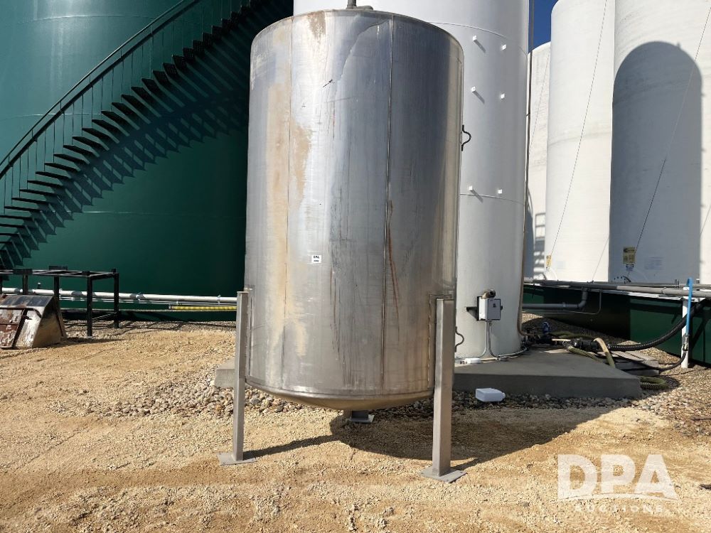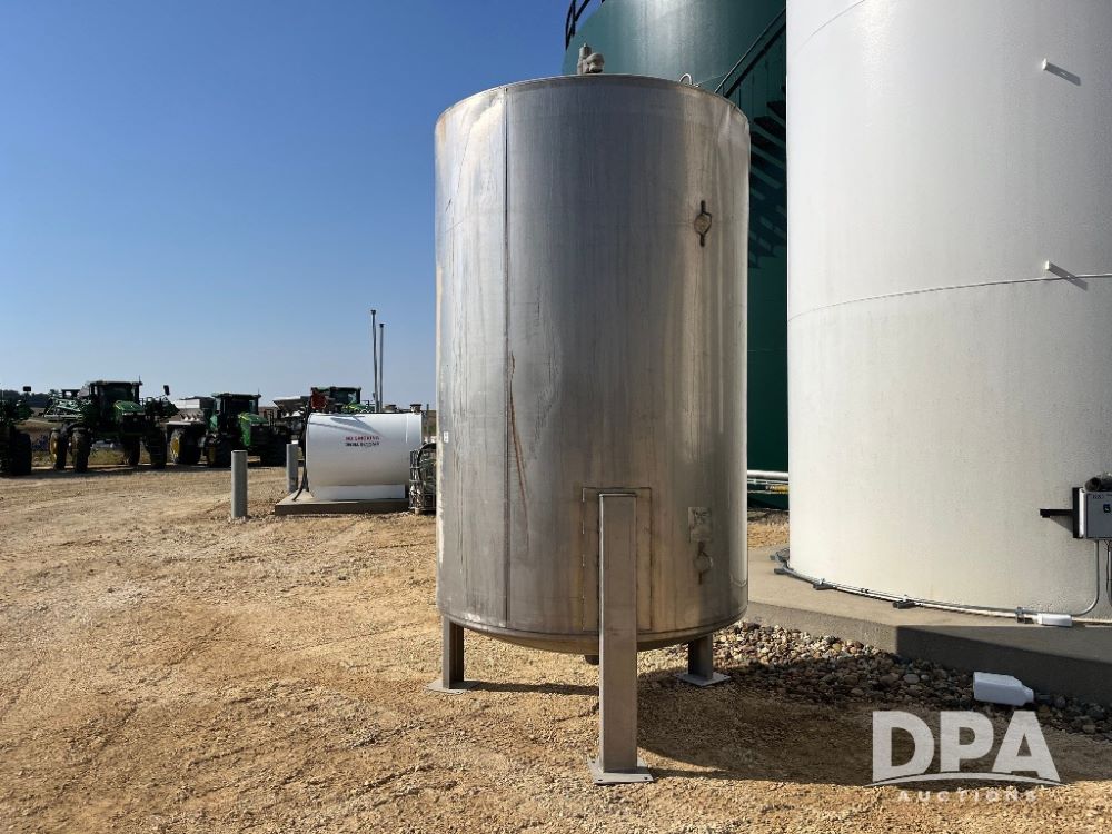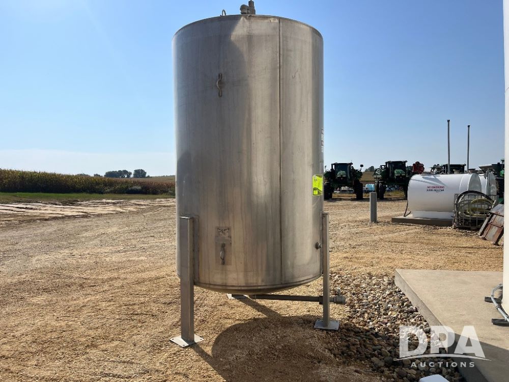 2003 Mid State Liquid Tank (JN3178), 2003 Mid State 1500 gallon stainless steel vertical dish bottom liquid tank, valve, stainless steel stands.