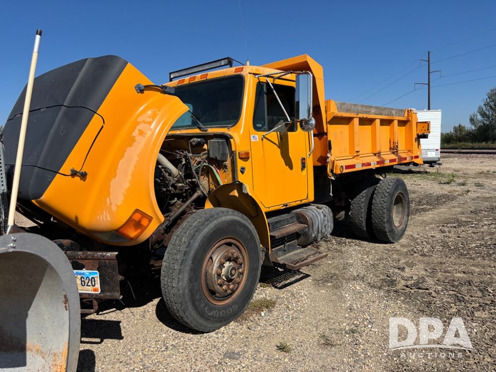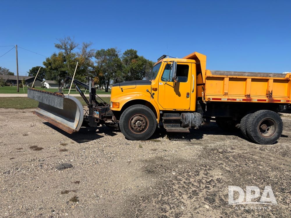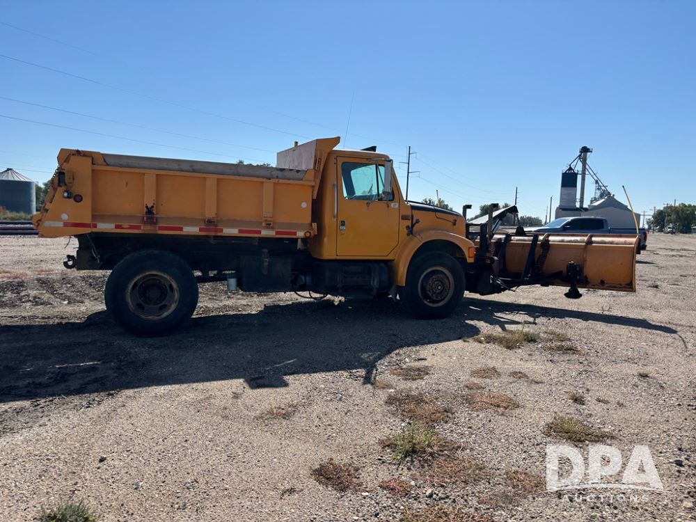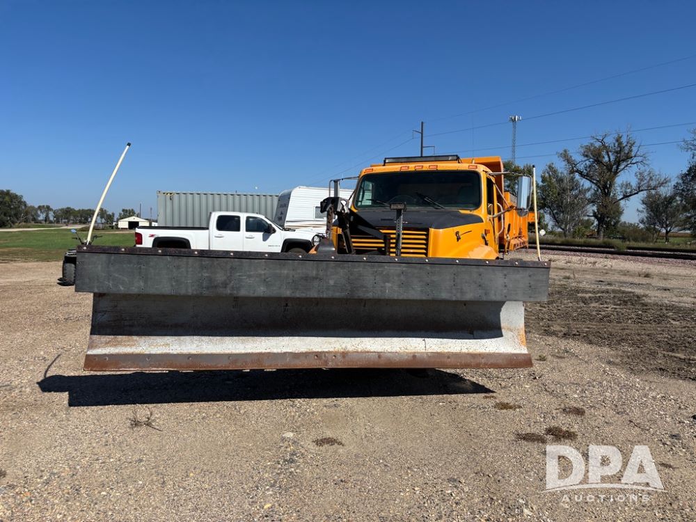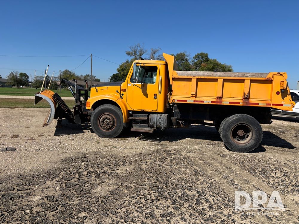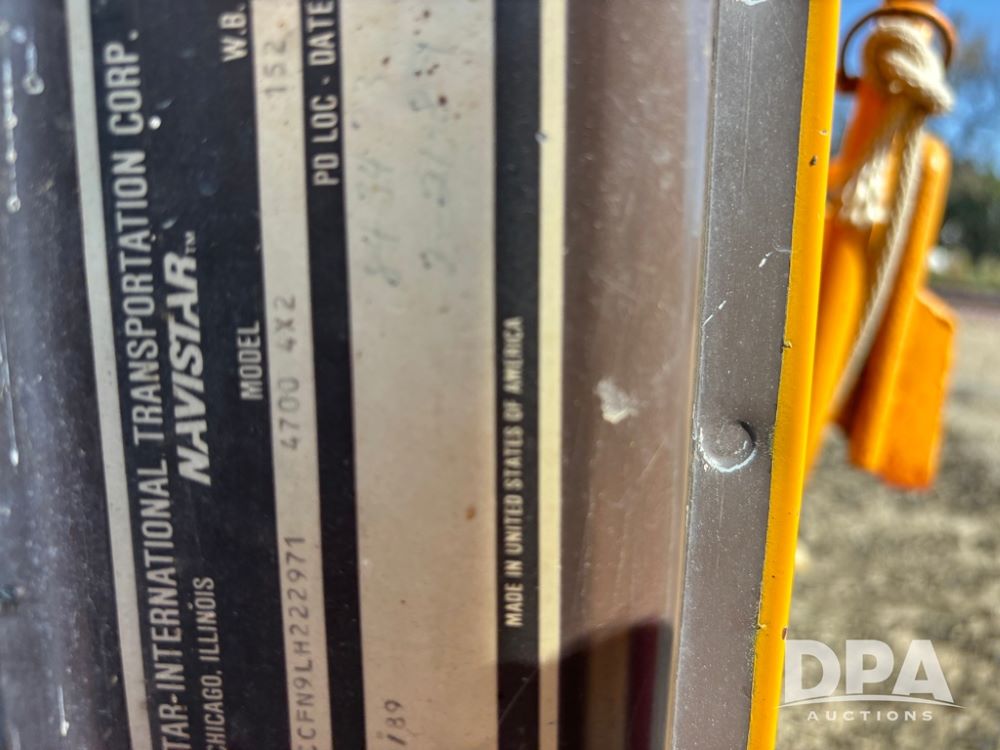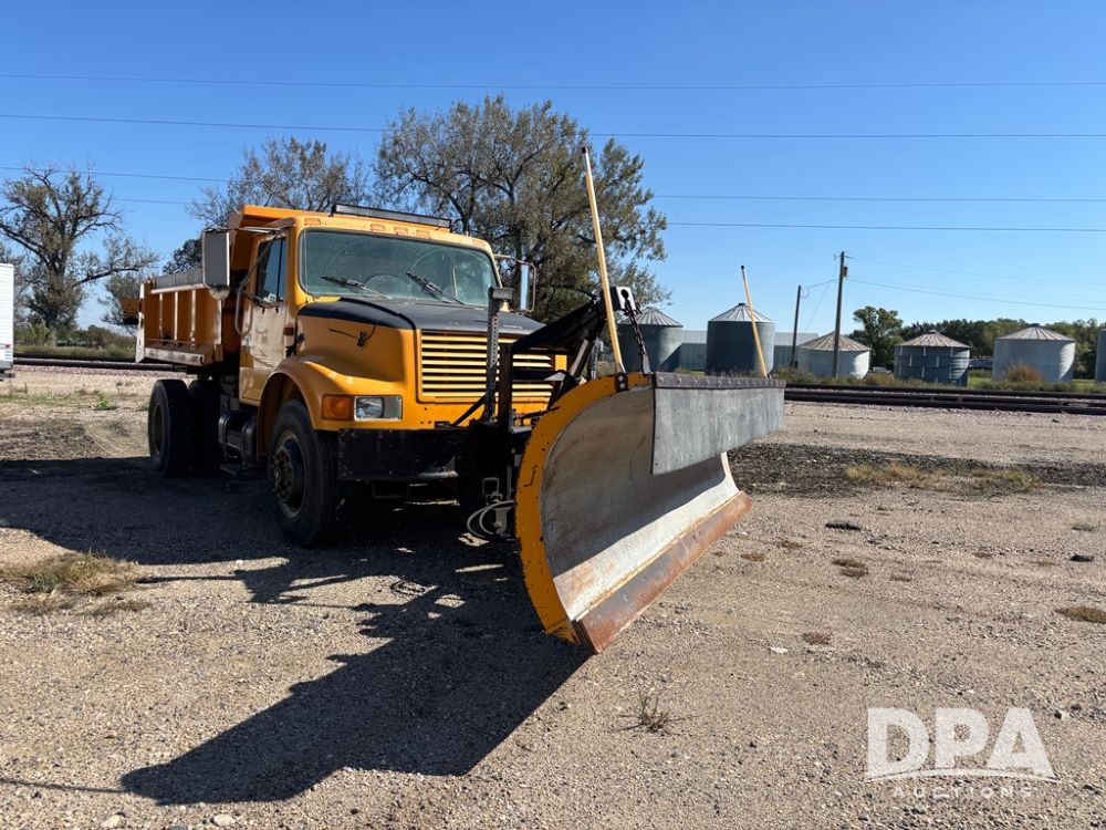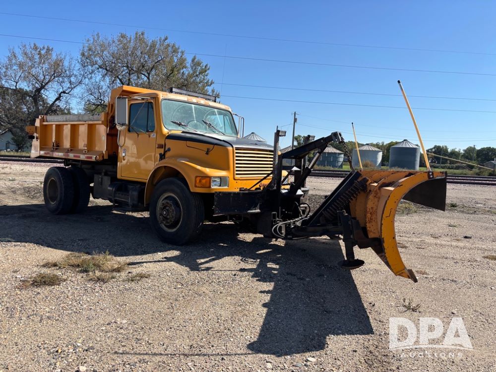 1990 International 4700 Plow Truck (DR12260), DT466 diesel engine, 5 speed 4 range transmission, single axle, air brakes, 12' front hydraulic blade, 10' steel dump box, rear pintle hitch, cab hat/air conditioning, 10.00R 20 tires, odometer reads 123,265 miles.