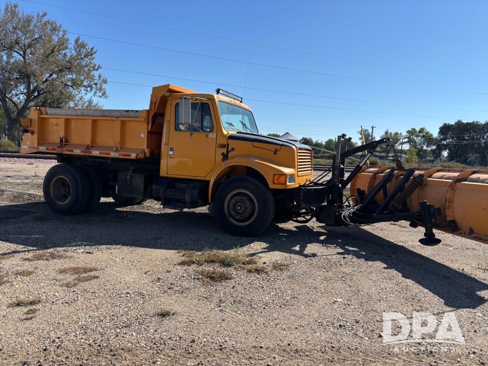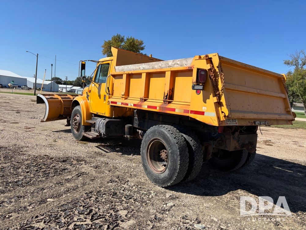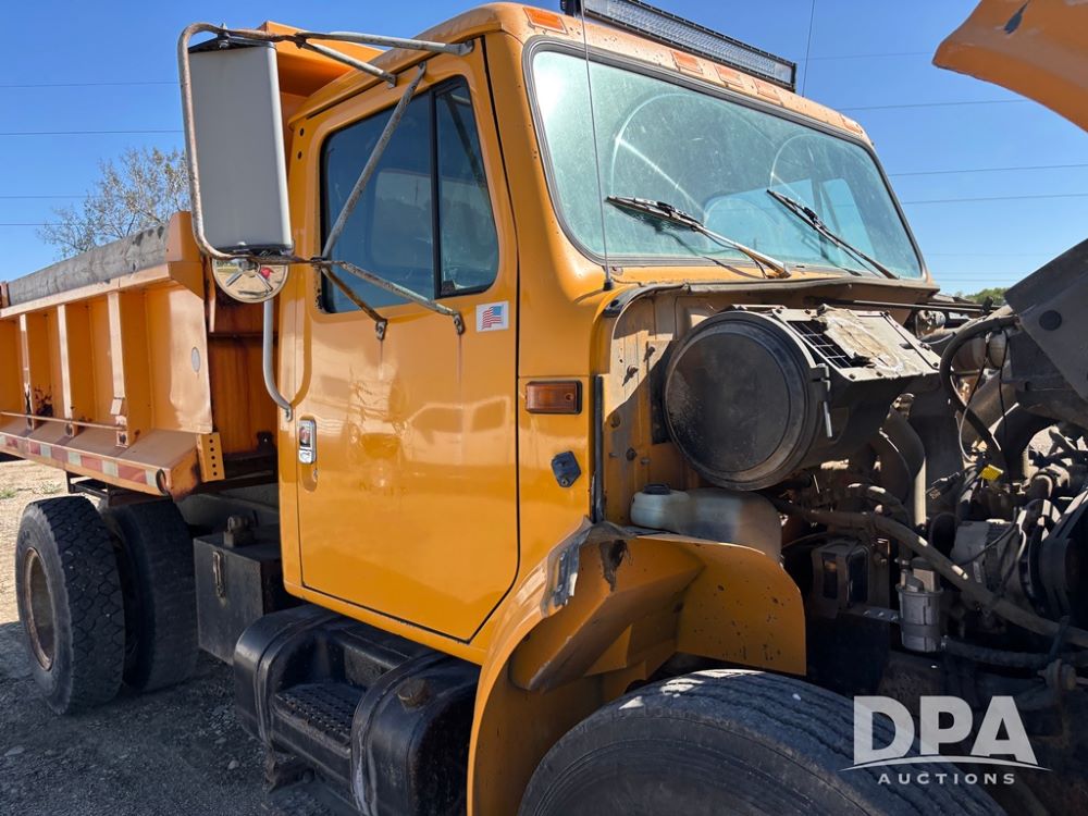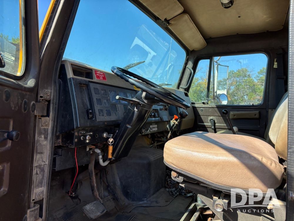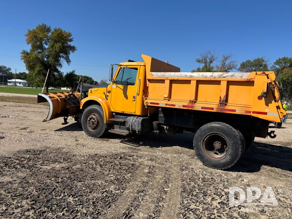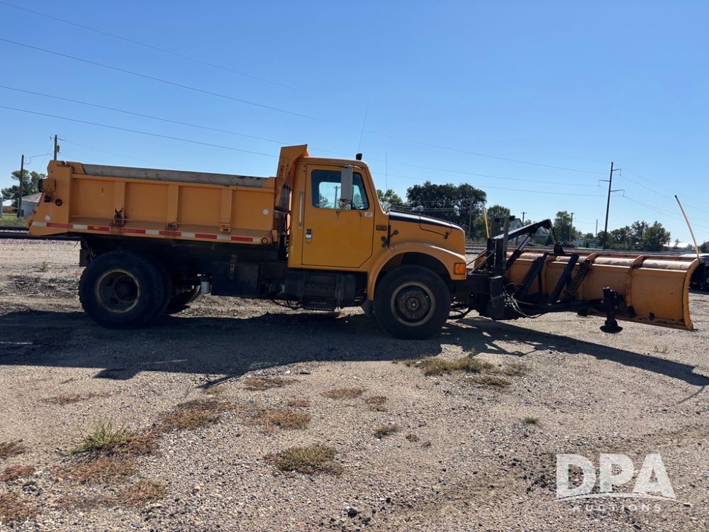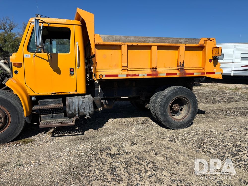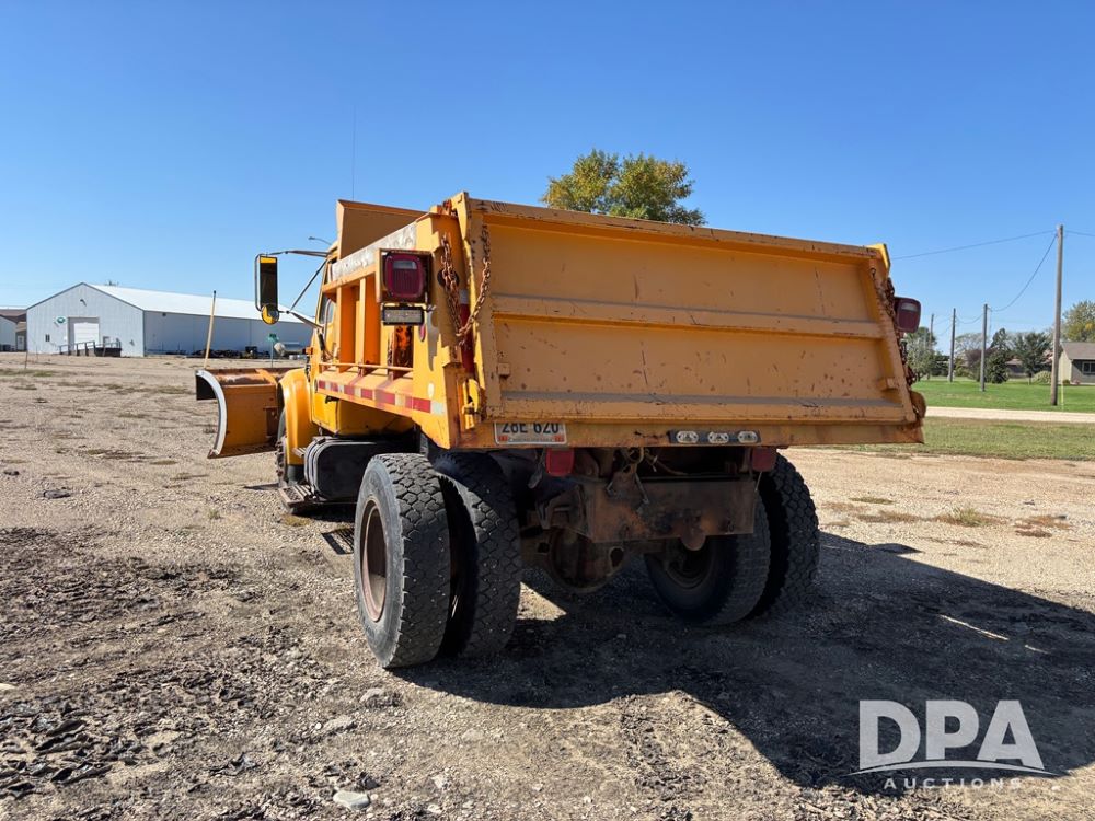 1990 International 4700 Plow Truck (DR12260), DT466 diesel engine, 5 speed 4 range transmission, single axle, air brakes, 12' front hydraulic blade, 10' steel dump box, rear pintle hitch, cab hat/air conditioning, 10.00R 20 tires, odometer reads 123,265 miles.
