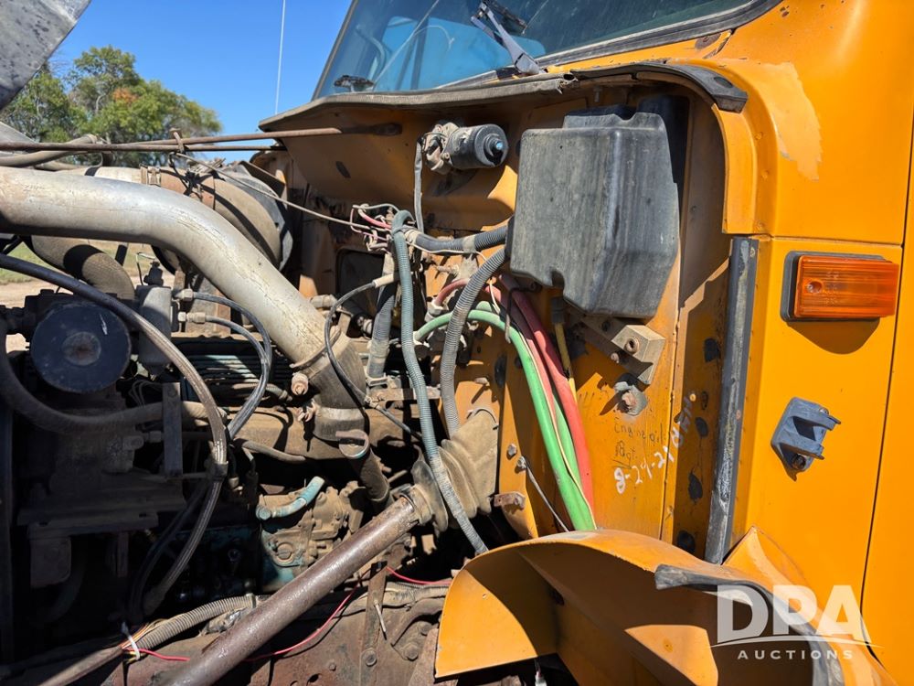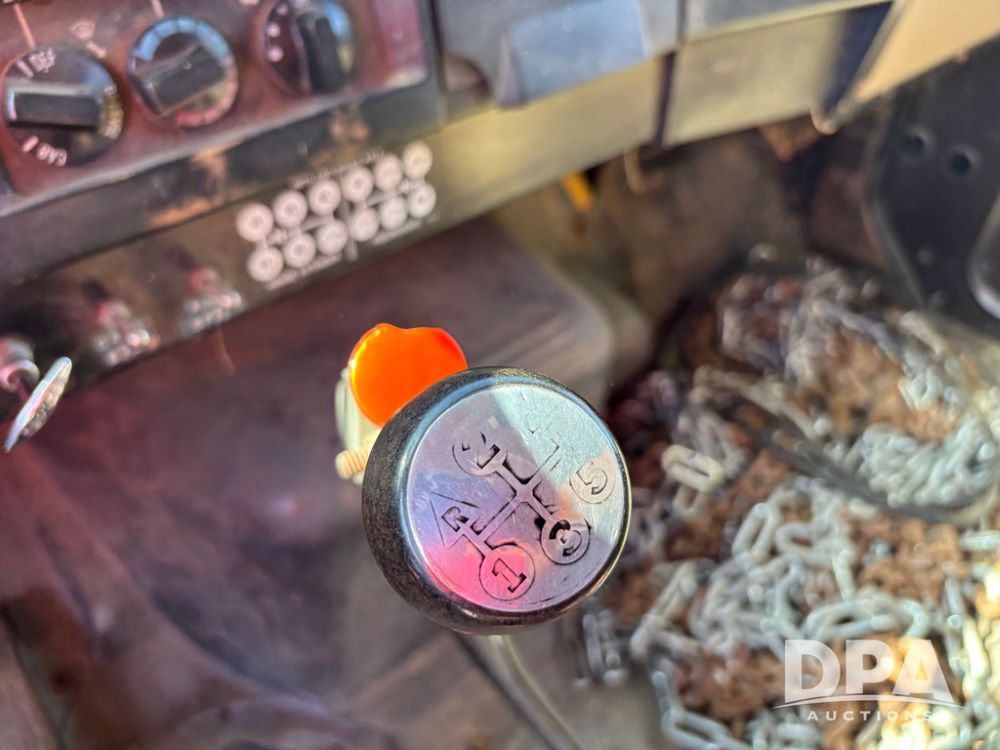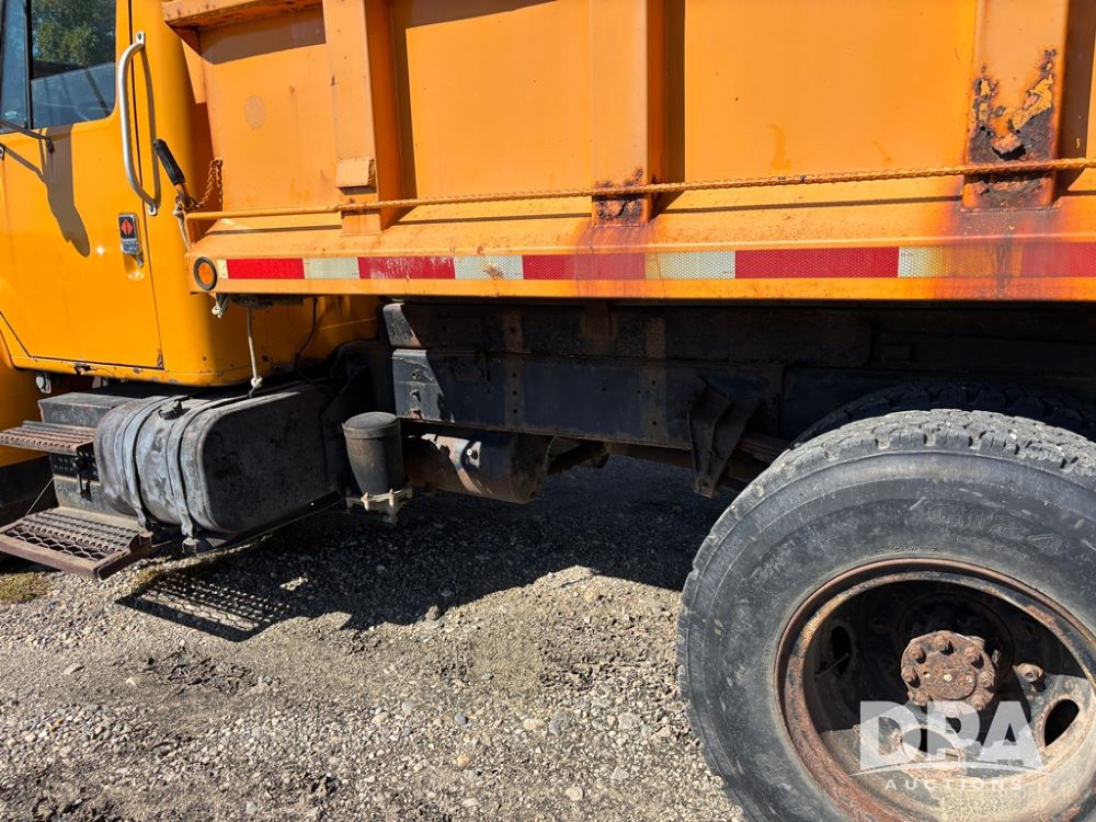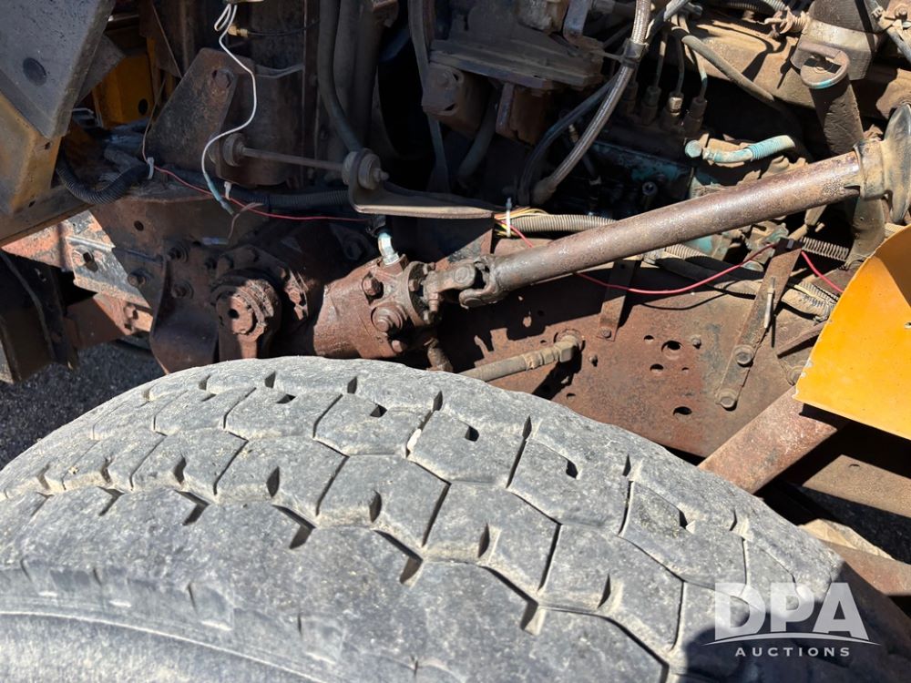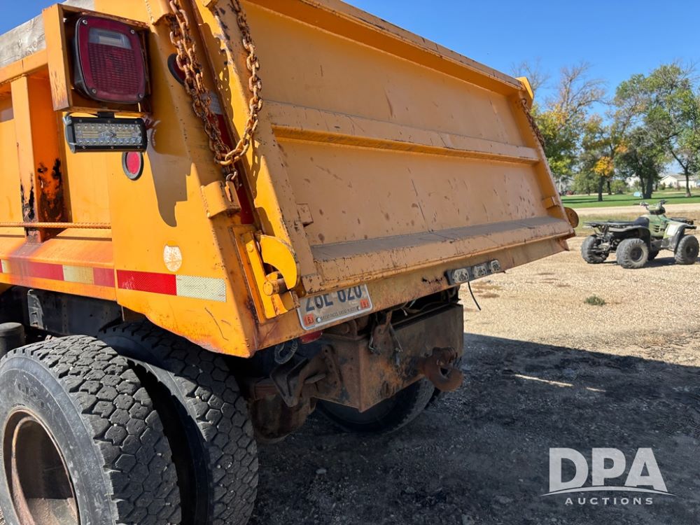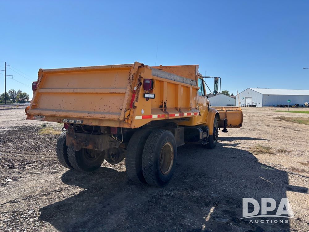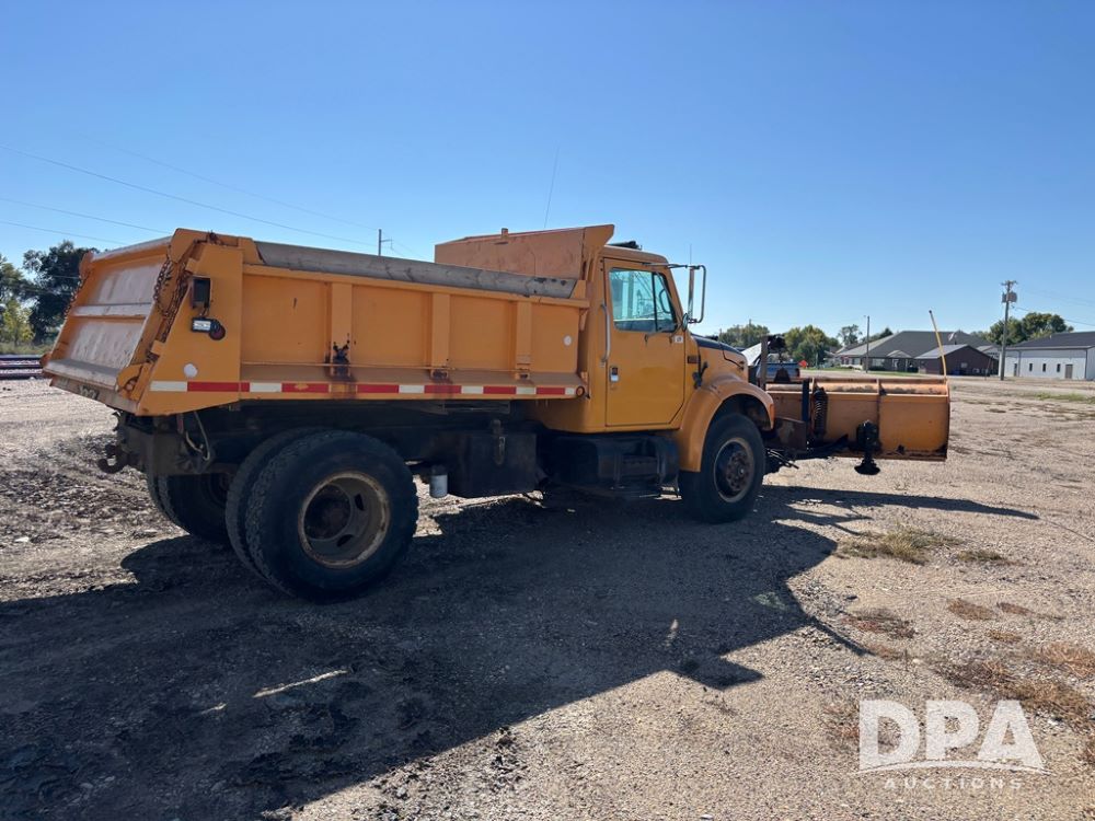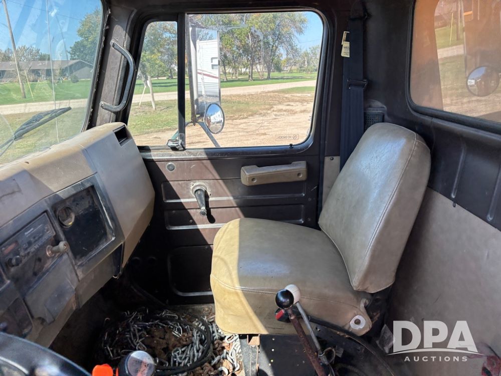 1990 International 4700 Plow Truck (DR12260), DT466 diesel engine, 5 speed 4 range transmission, single axle, air brakes, 12' front hydraulic blade, 10' steel dump box, rear pintle hitch, cab hat/air conditioning, 10.00R 20 tires, odometer reads 123,265 miles.