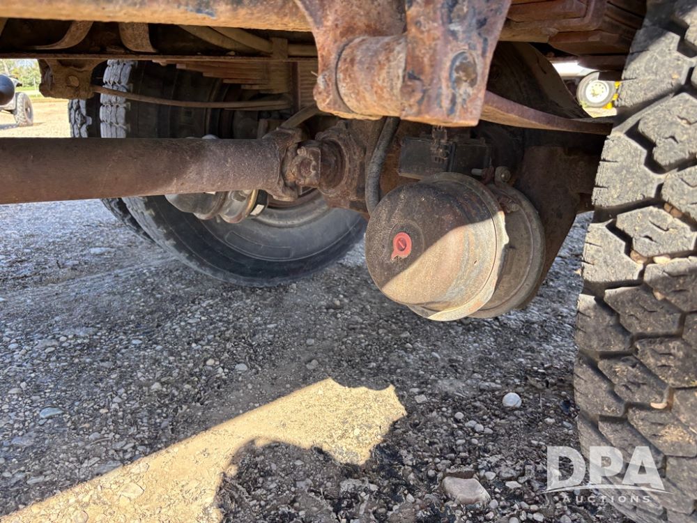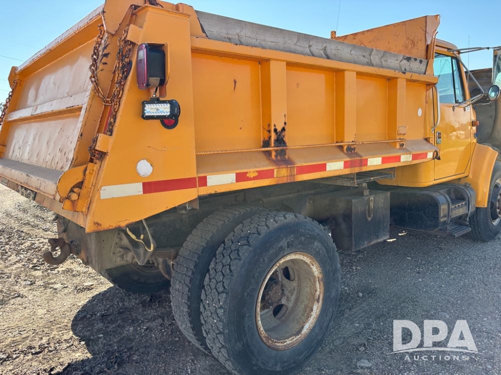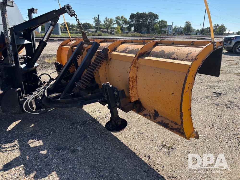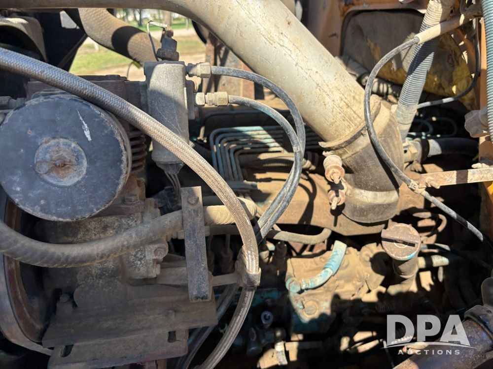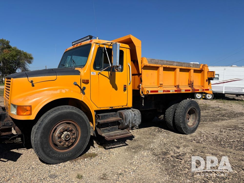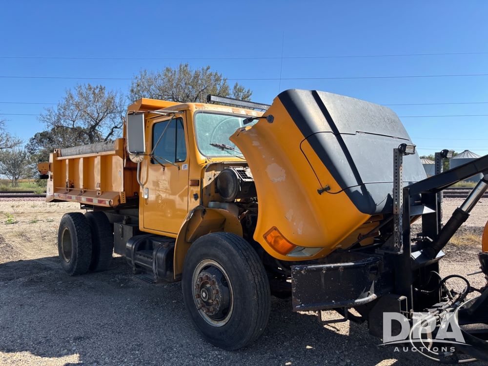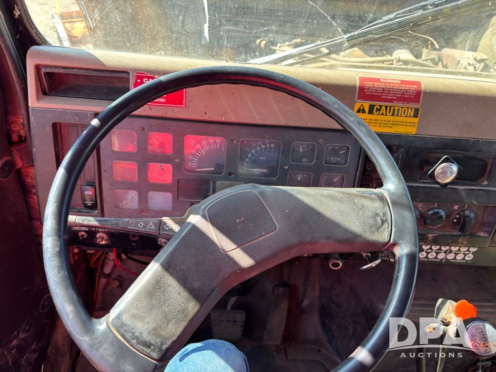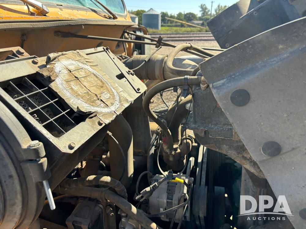 1990 International 4700 Plow Truck (DR12260), DT466 diesel engine, 5 speed 4 range transmission, single axle, air brakes, 12' front hydraulic blade, 10' steel dump box, rear pintle hitch, cab hat/air conditioning, 10.00R 20 tires, odometer reads 123,265 miles.