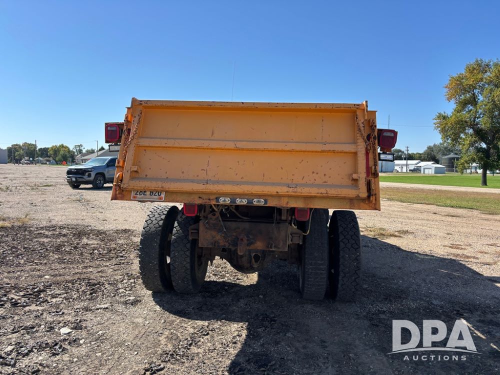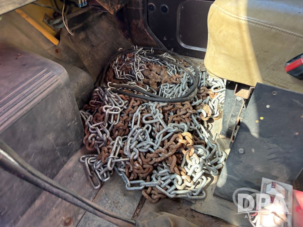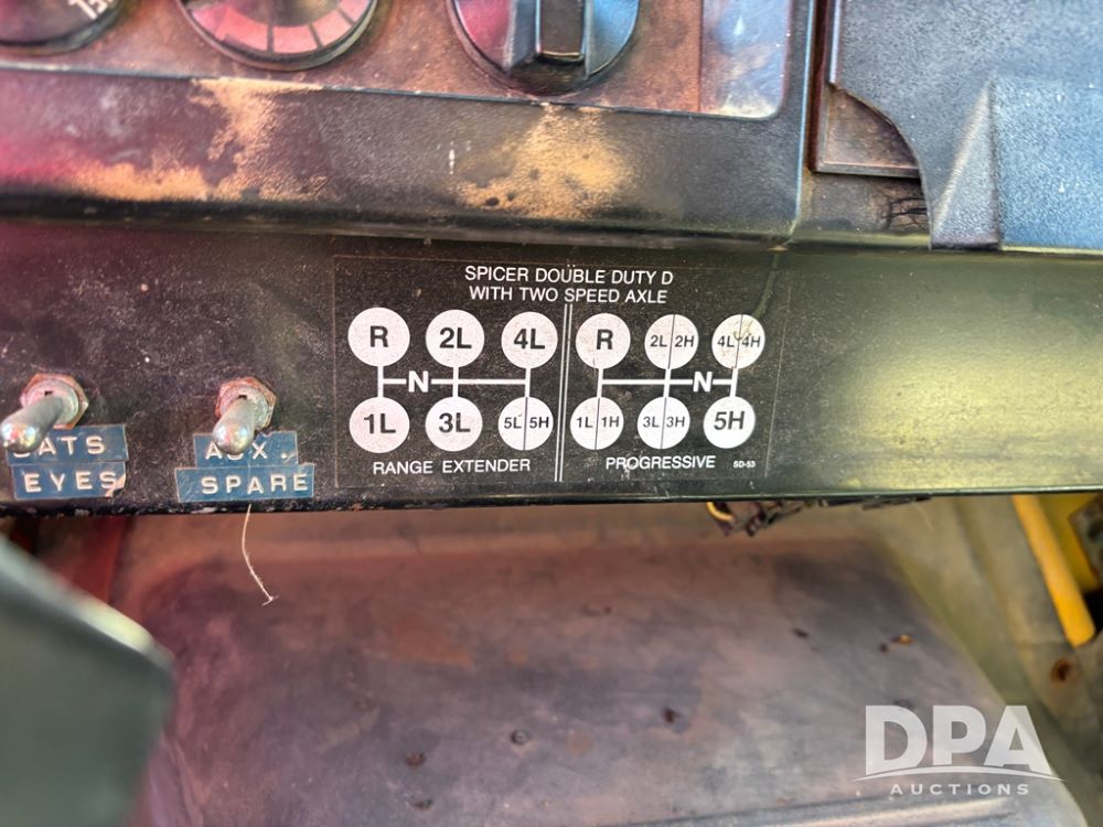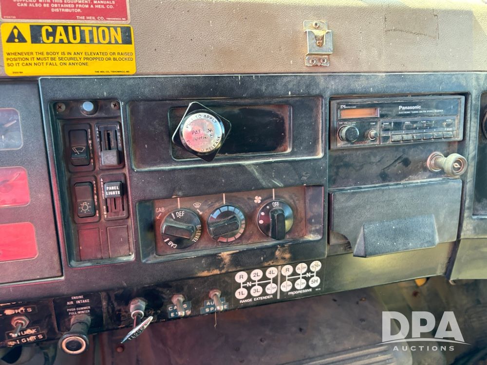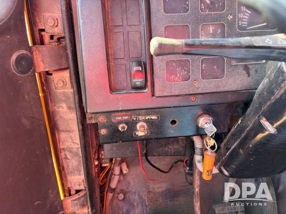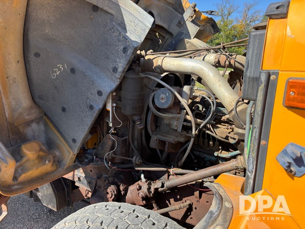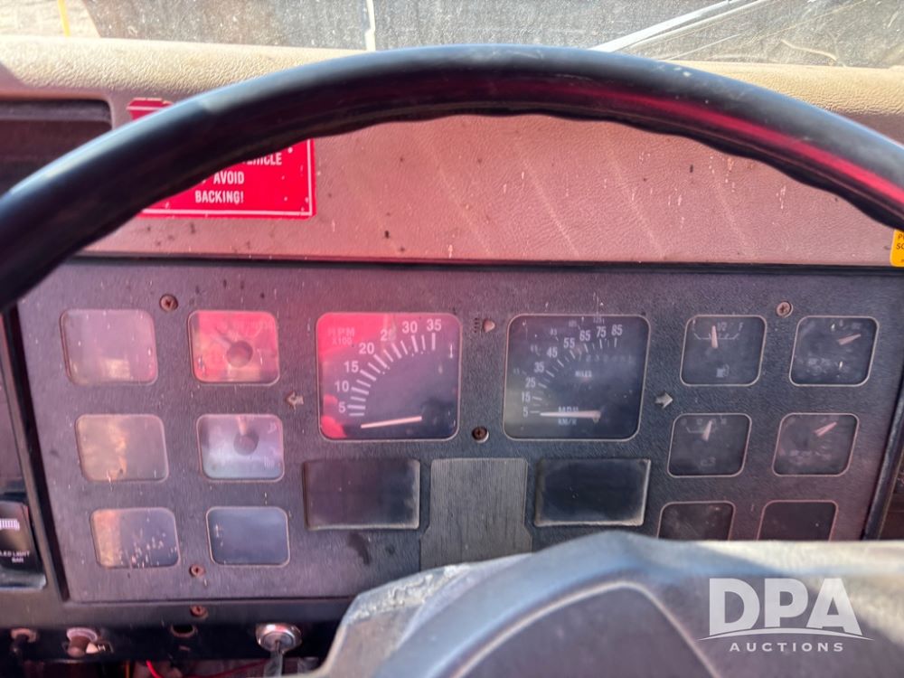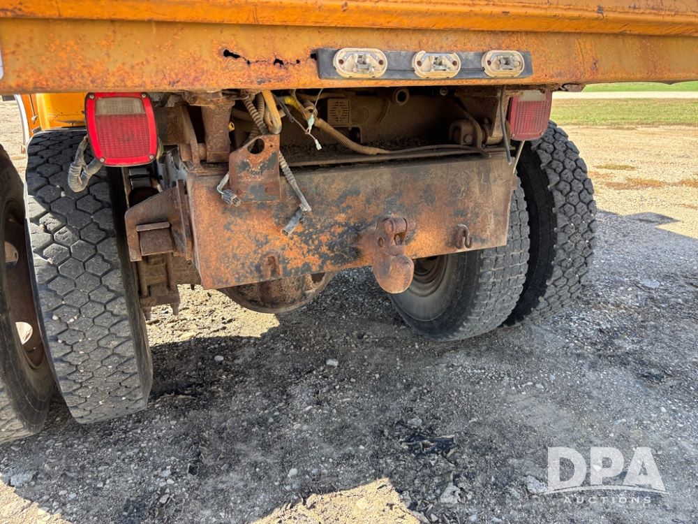 1990 International 4700 Plow Truck (DR12260), DT466 diesel engine, 5 speed 4 range transmission, single axle, air brakes, 12' front hydraulic blade, 10' steel dump box, rear pintle hitch, cab hat/air conditioning, 10.00R 20 tires, odometer reads 123,265 miles.