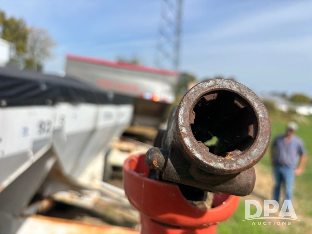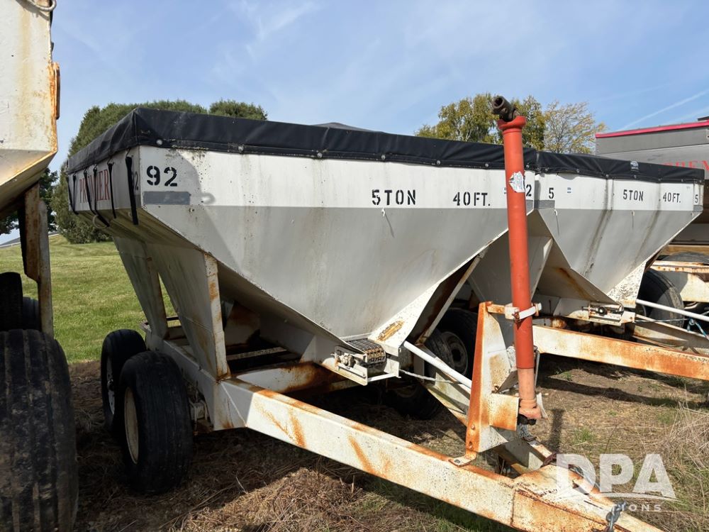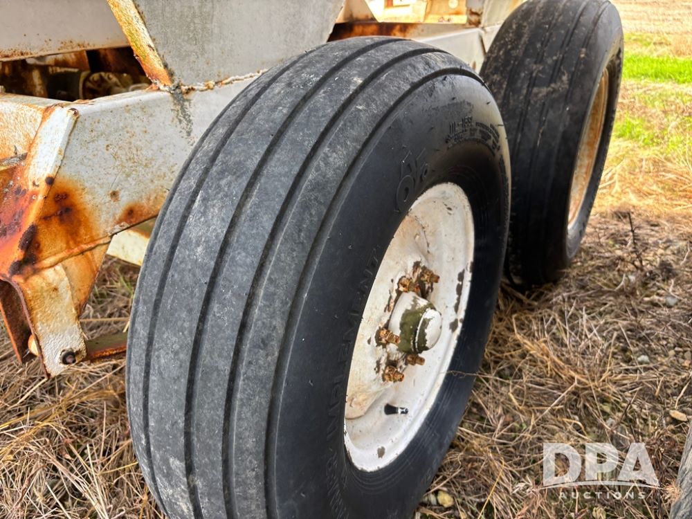 Dry Spreader Buggy (DR12300 Unit 92), 5 ton stainless steel pull spreader, 2 speed ground drive web chain, PTO drive dual rear spinner pans, 40' pattern, manual tarp, 11L-15 tires.