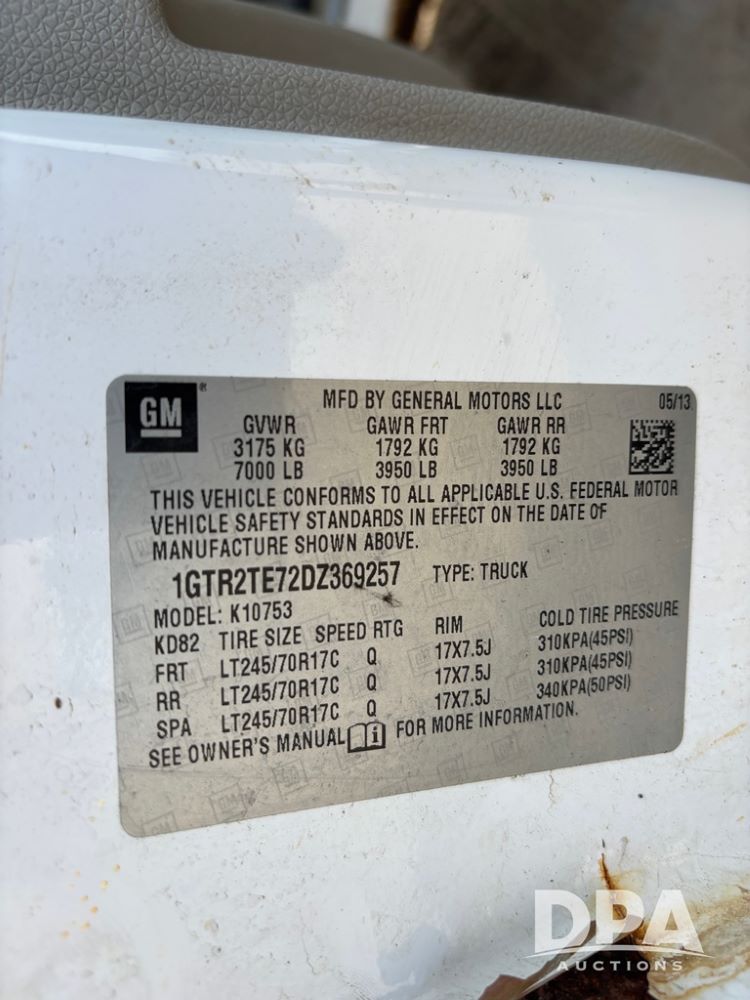2013 GMC Sierra Pickup (DR12344 Unit 9388), 5.3 liter gas engine, automatic transmission, quad door cab, 4X4, rear receiver hitch, heat/air conditioning, cruise control, power windows & locks, 245/70R17 tires, odometer reads 169,566 miles.