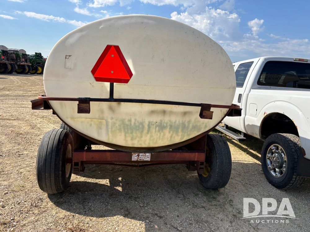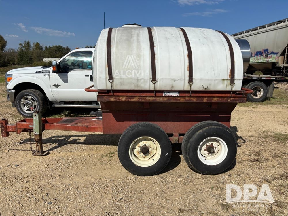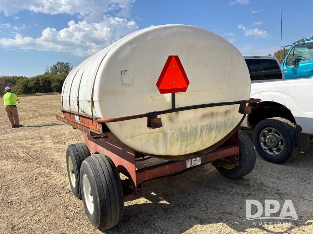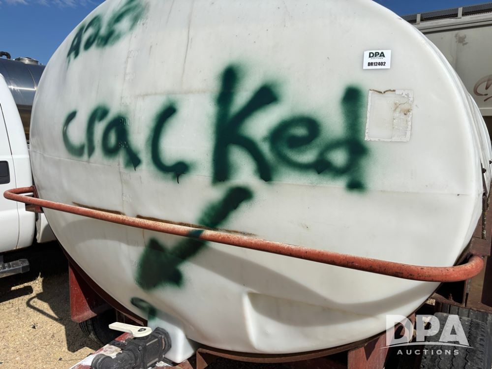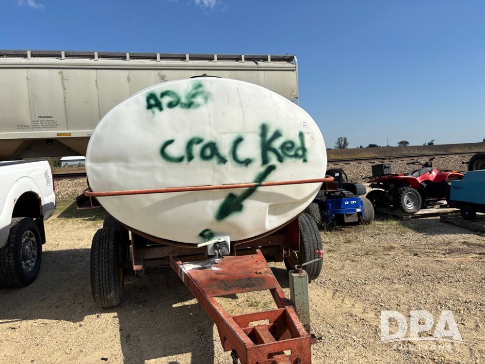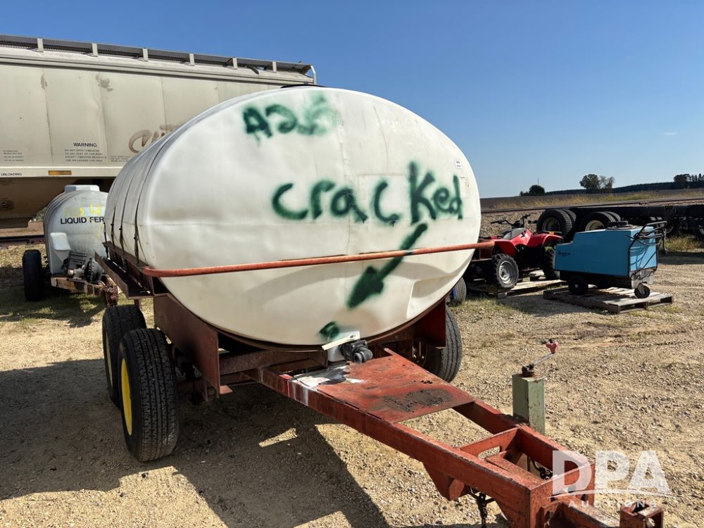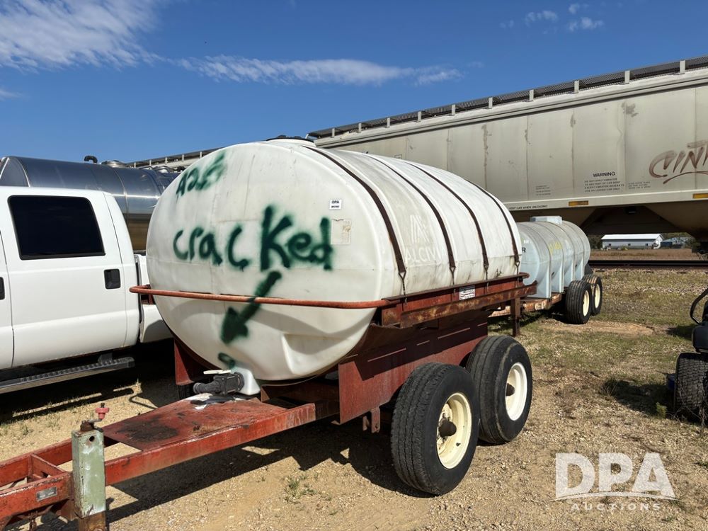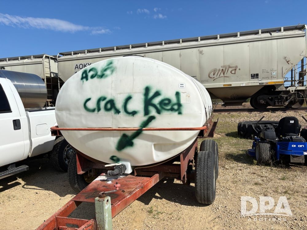 Liquid Nurse Trailer (DR12402 Unit T8), 1,300 gallon poly liquid tank, has a crack near front outlet as seen in pictures, tandem axle running gear.