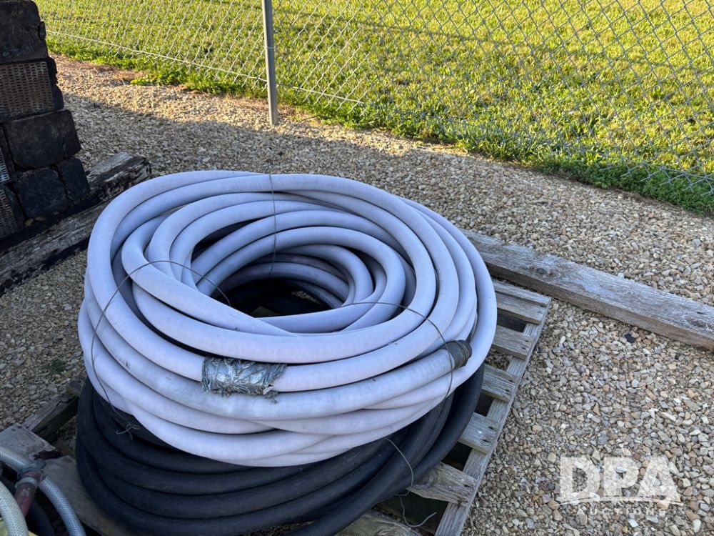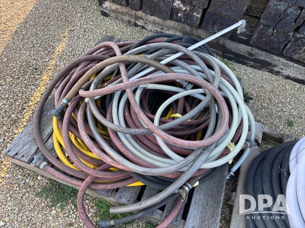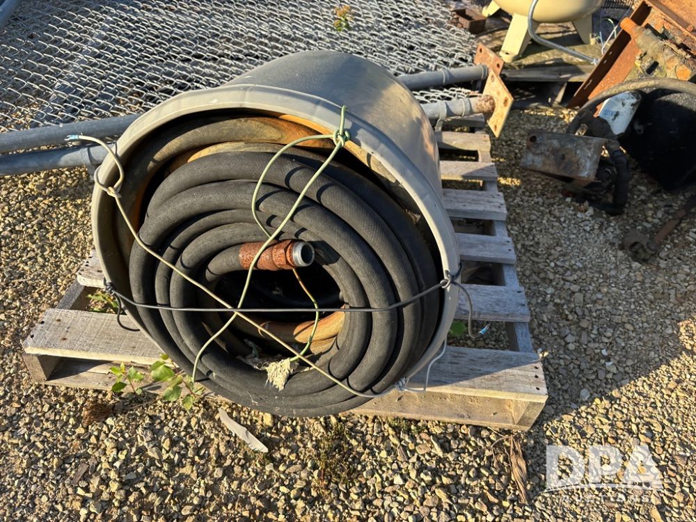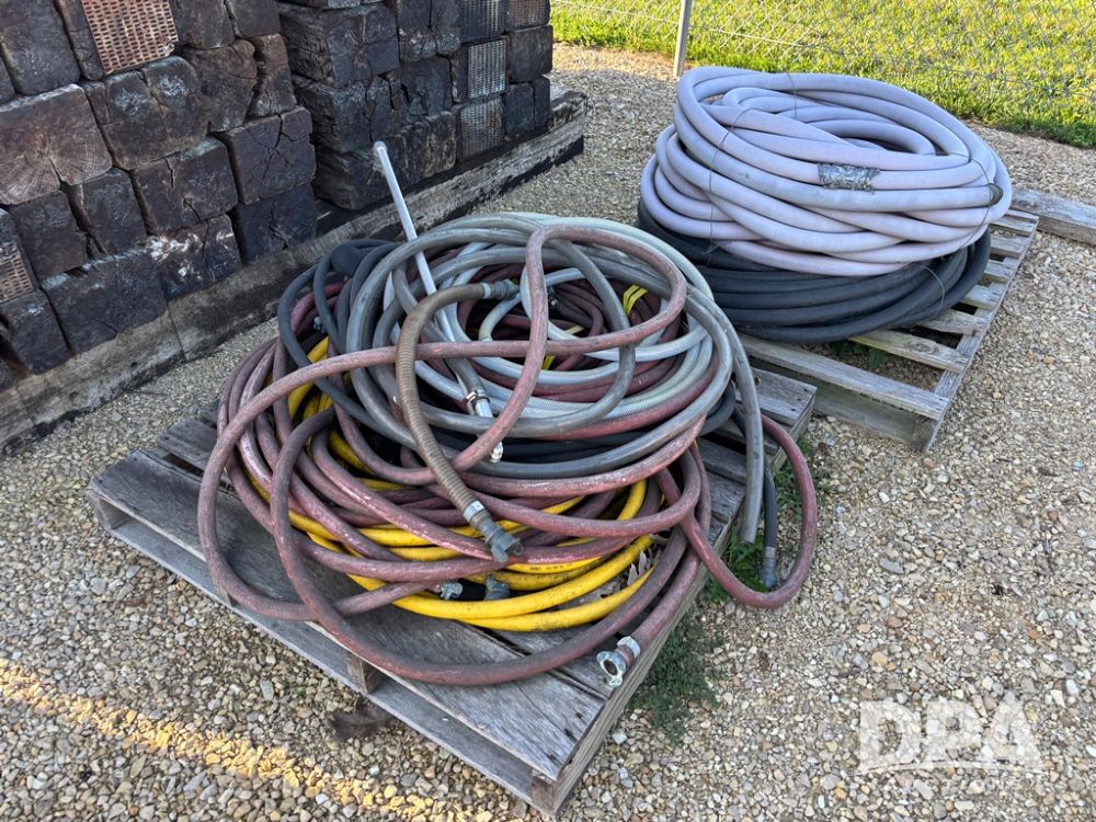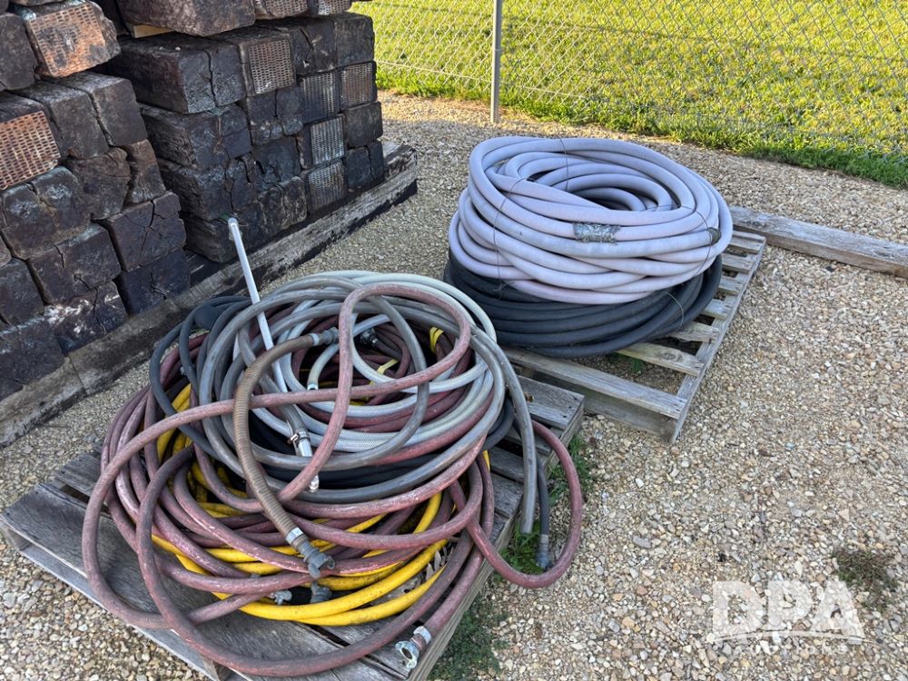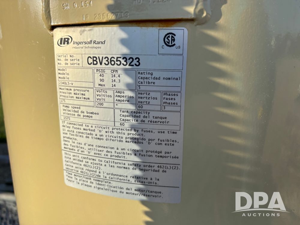 Ingersoll Compressor (DR7888), upright shop air compressor, model 2340 2 cylinder compressor, electric drive motor, 2 pallets fuel delivery hoses and 1'' air hoses.