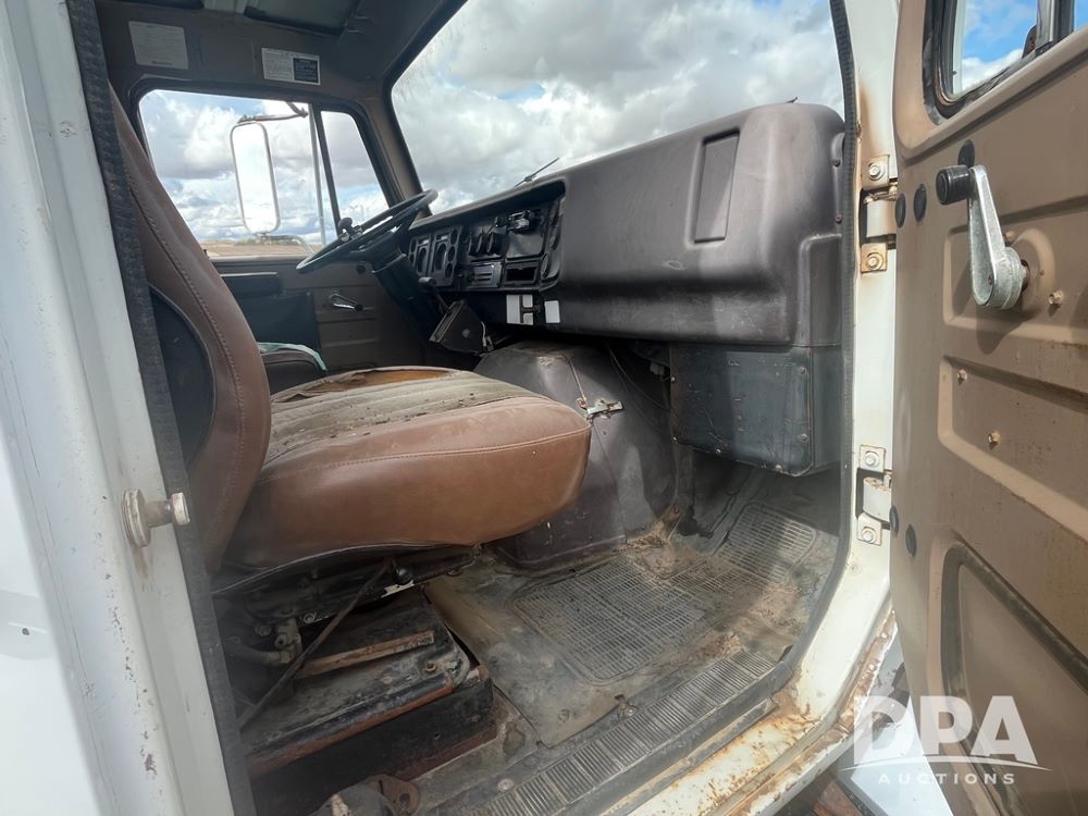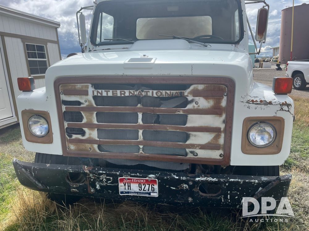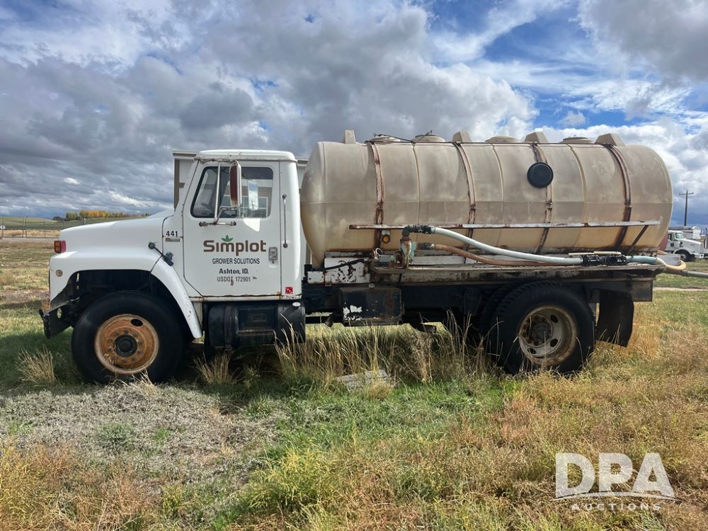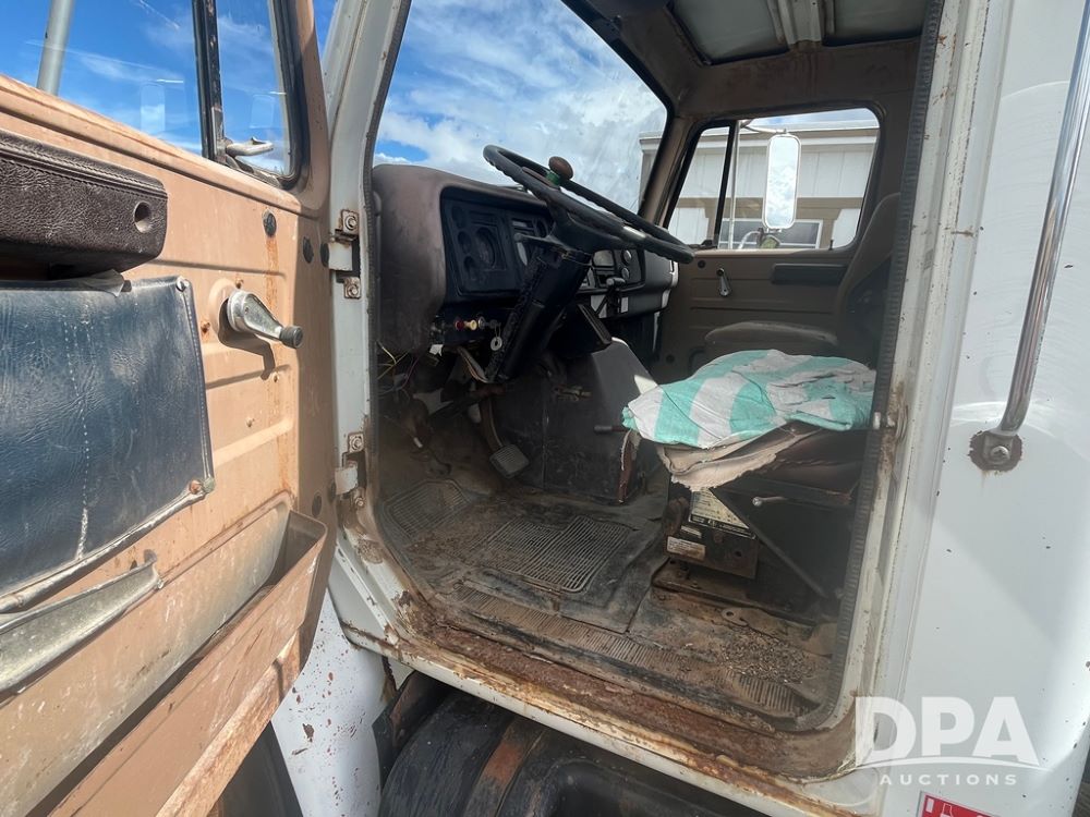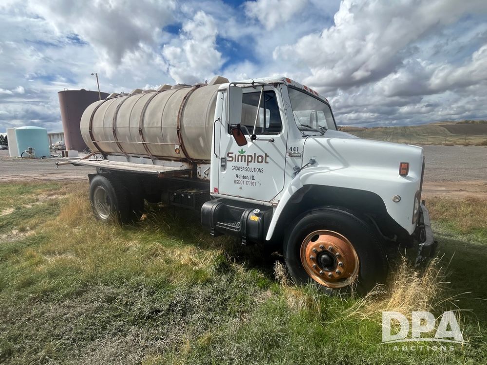 1982 International S1900 Truck (DR12435 Unit 181245), diesel engine, this truck will run with a battery, has NO BRAKES, 4 speed automatic transmission, single axle, 1600 gallon 4 compartment poly liquid tank, hydraulic PTO pump.
