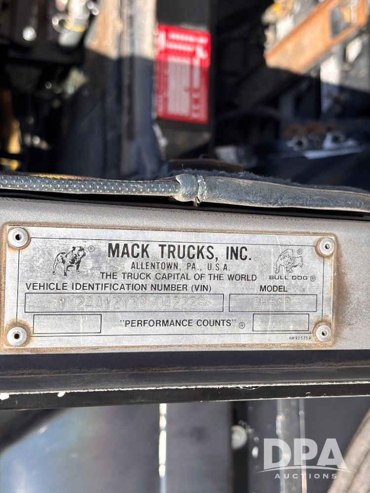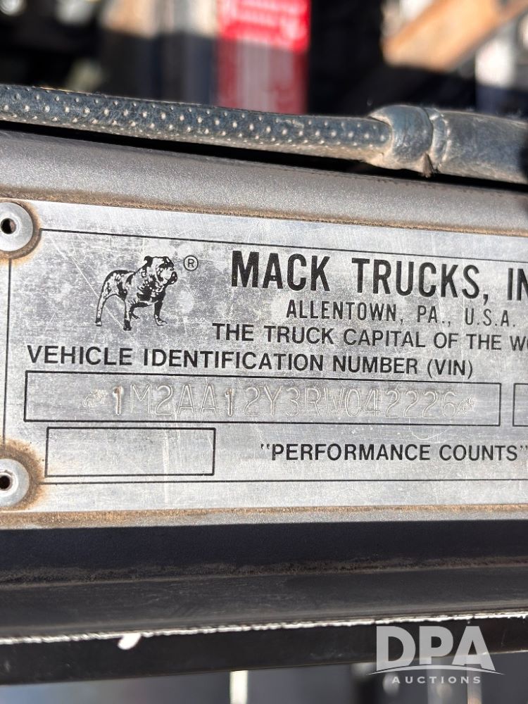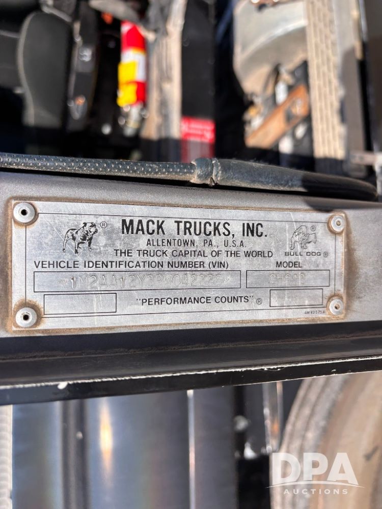 1994 Mack CH613 Truck (GP11361, Unit 43141), Mack diesel engine, Maxitorque T2090 9 speed transmission, air conditioning, heat, Am/Fm radio, cruise control, engine brake, power windows, tandem axle, full screw, spring suspension, 11R22.5 tires, aluminum rims.