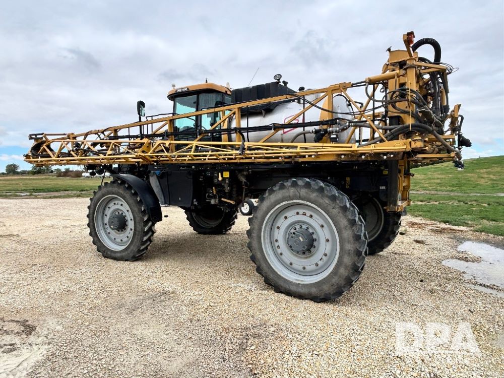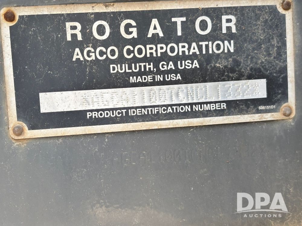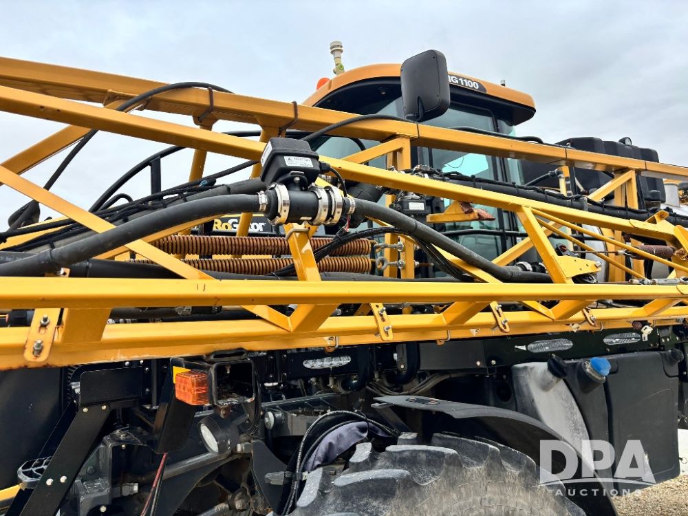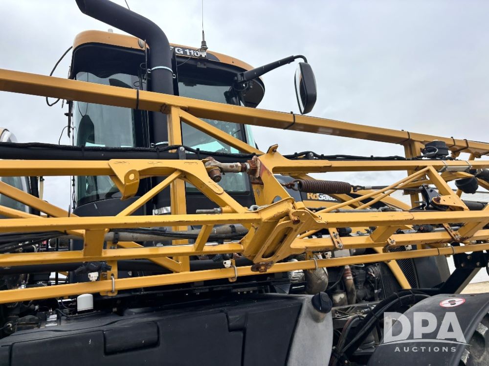 2012 RoGator 1100 Sprayer (GP11640, Unit 44-040), AGCO diesel engine, hydrostatic transmission, air conditioning, heat, Am/Fm CD radio, leather seat, buddy seat, beacon light, 1100 gallon stainless steel liquid system, 120' boom, top poly rinse tank, front fill, Firestone VF380/90R46 tires, fenders, Voyager cab camera, Raven Viper 4 monitor, shows 3,391 hours.