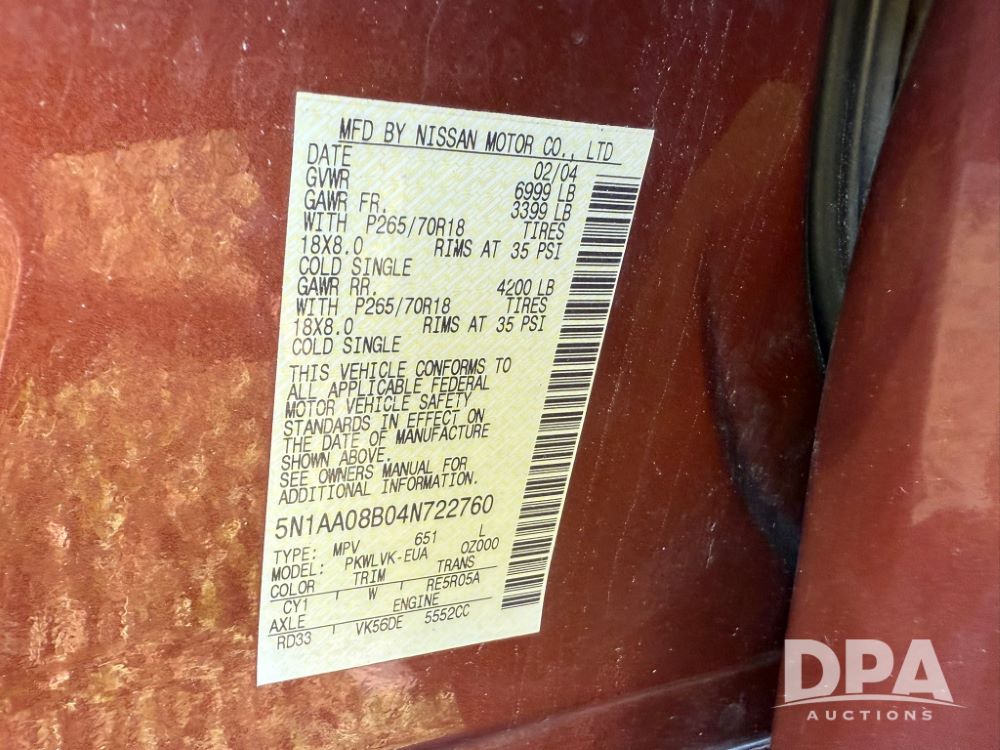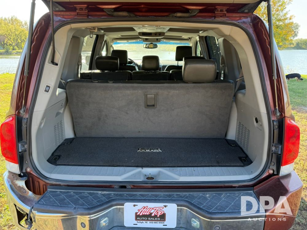 2004 Nissan Armada SE/LE SUV (LLD1441), gas engine, automatic transmission, auto liftgate, 3rd row, leather seats, heated front seats, electric windows and locks, sunroof, air conditioning, heat, CD player, radio, shows 227,298 miles.