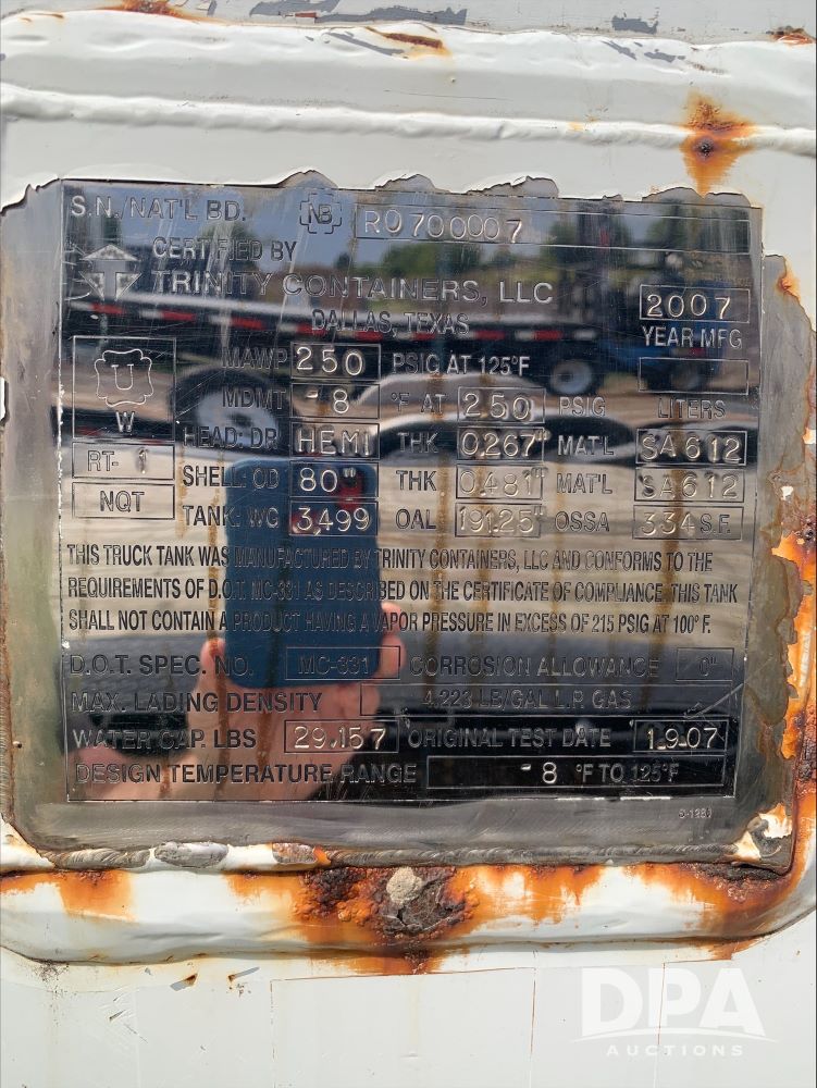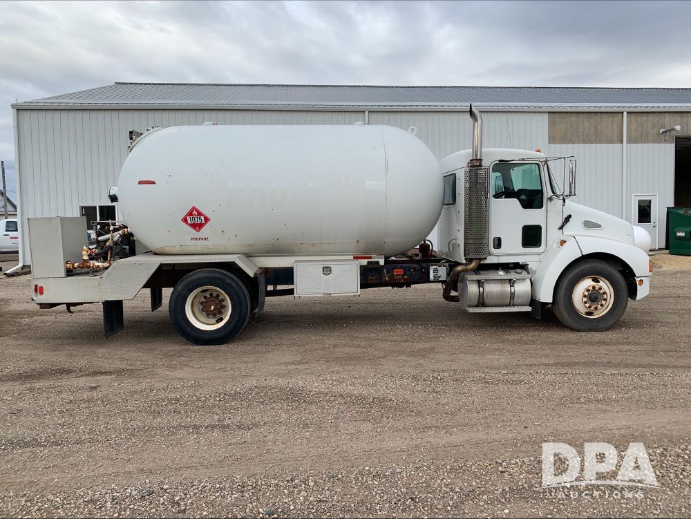 2007 Kenworth LP Truck (PZ13948, Unit 25), Cummins 8.3L diesel engine, Allison automatic transmission, air conditioning, heat, Am/Fm CD radio, single axle, air ride suspension, 2007 Trinity 3,499 gallon LP tank, National Board # & S/N R0700007, LectroCount LCR-II meter, electric hose reel with hose, 11R22.5 tires, shows 188,575 miles.