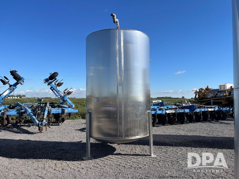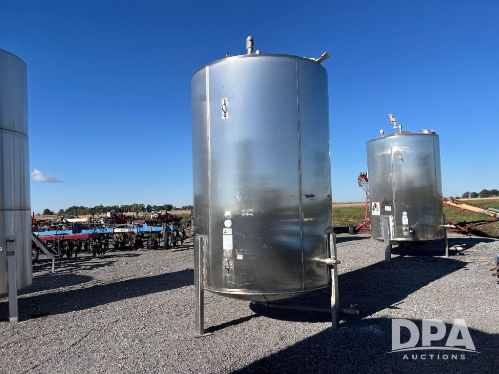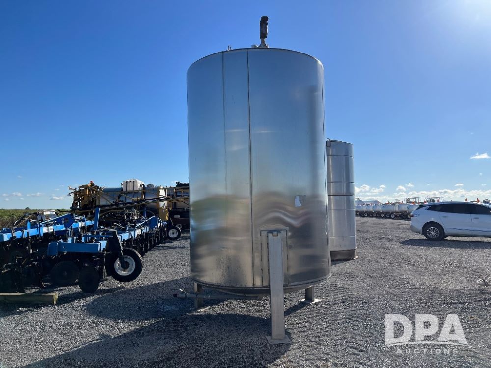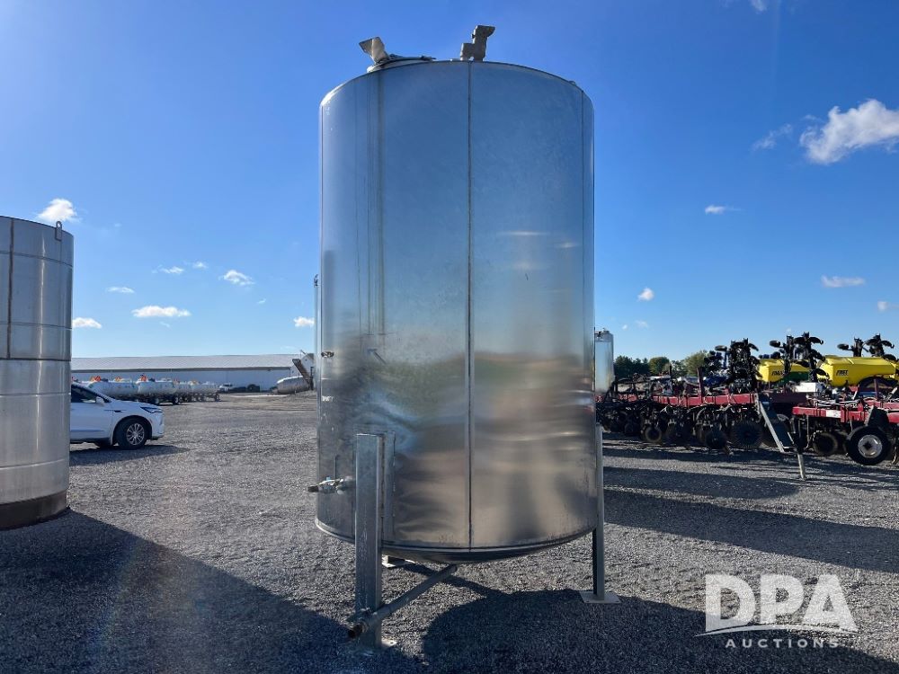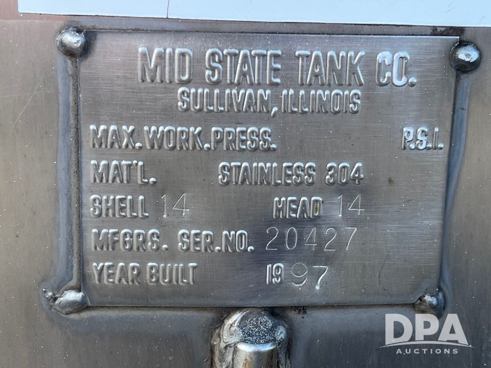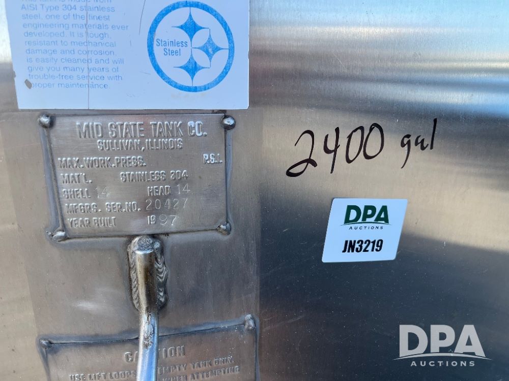 1997 Mid State Stainless Steel Liquid Tank (JN3219), 1997 Mid State 2,400 gallon vertical stainless steel liquid tank, stainless steel stands, valve.
