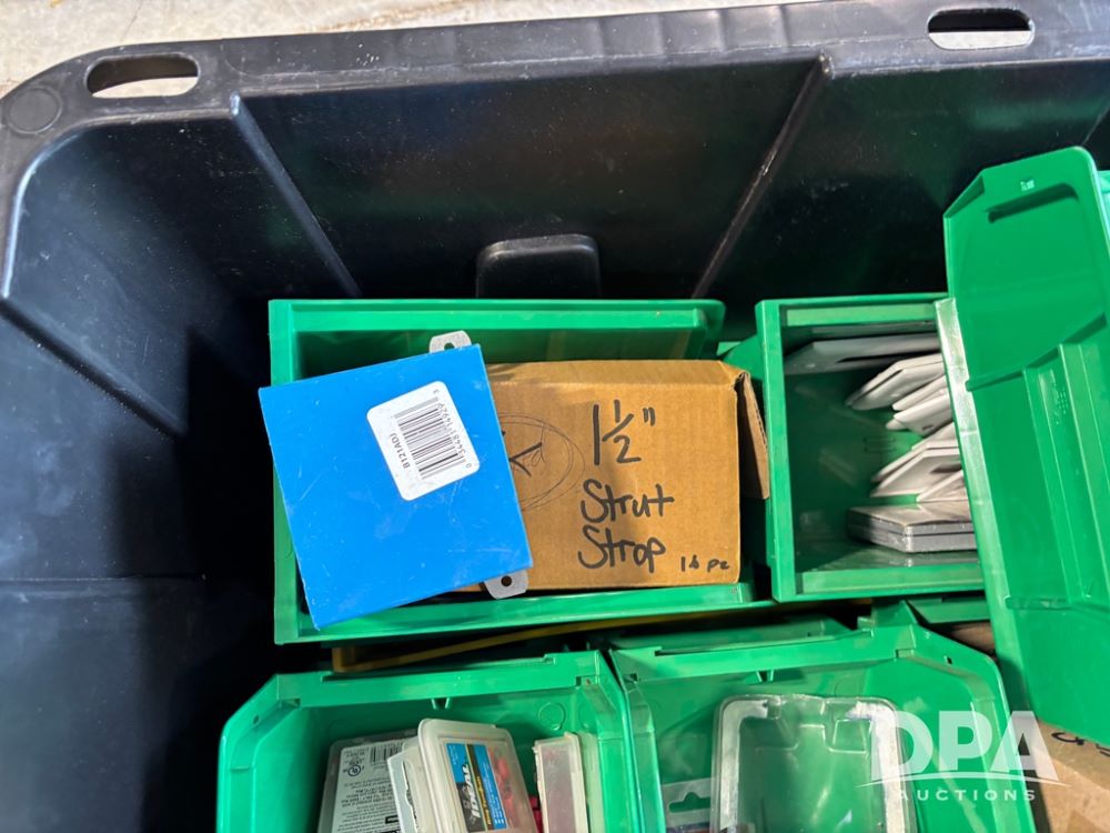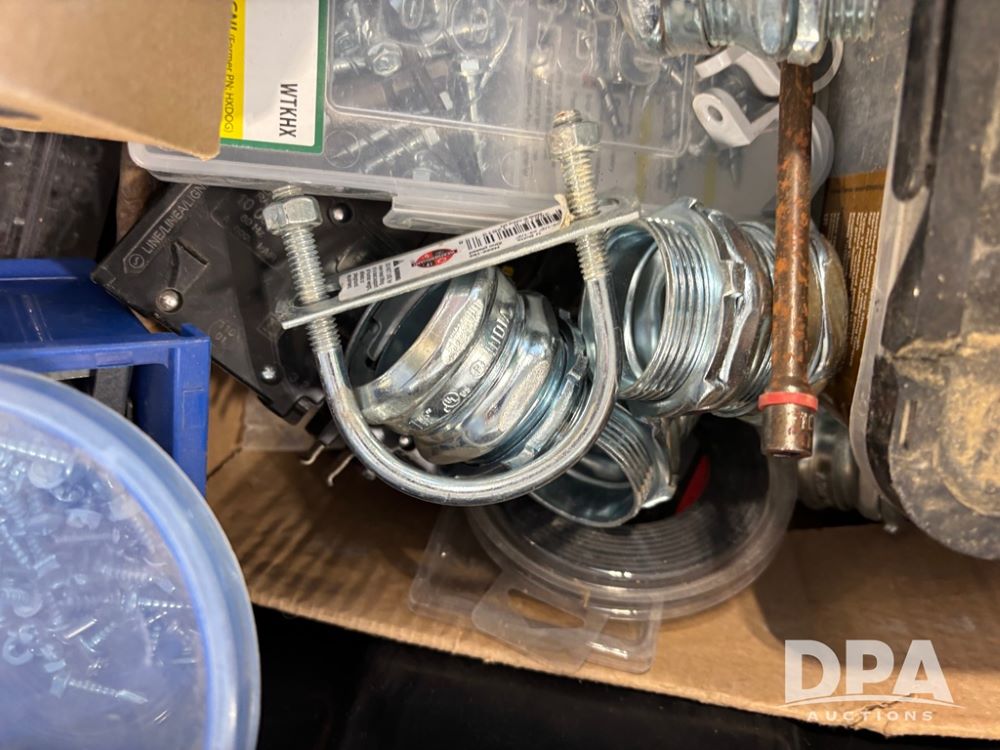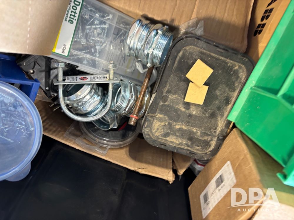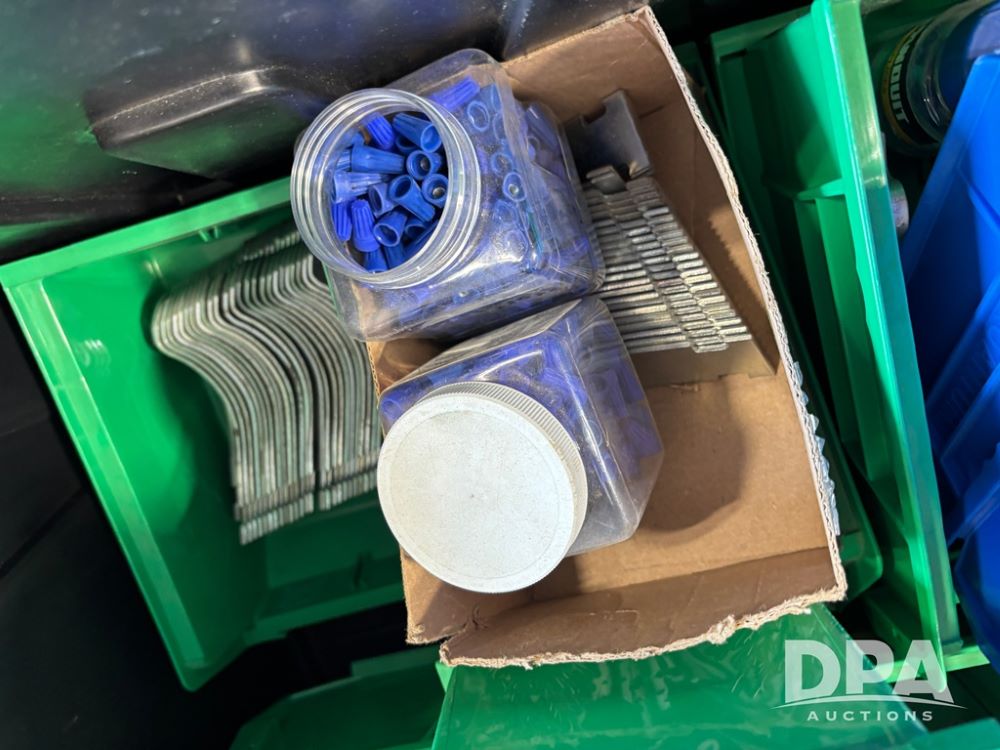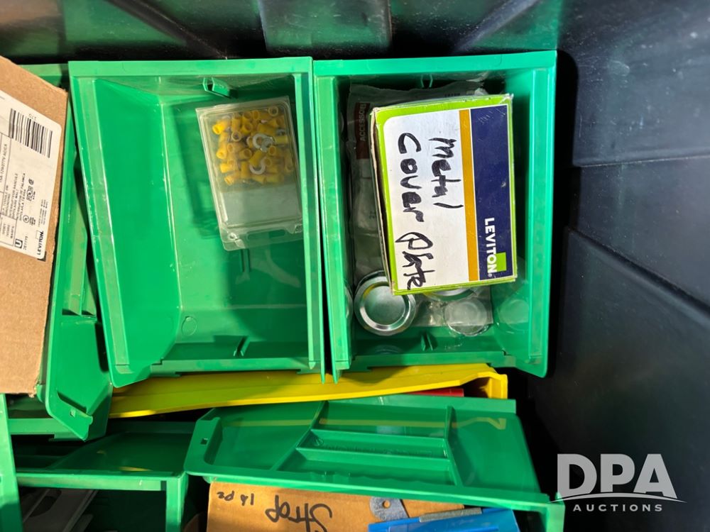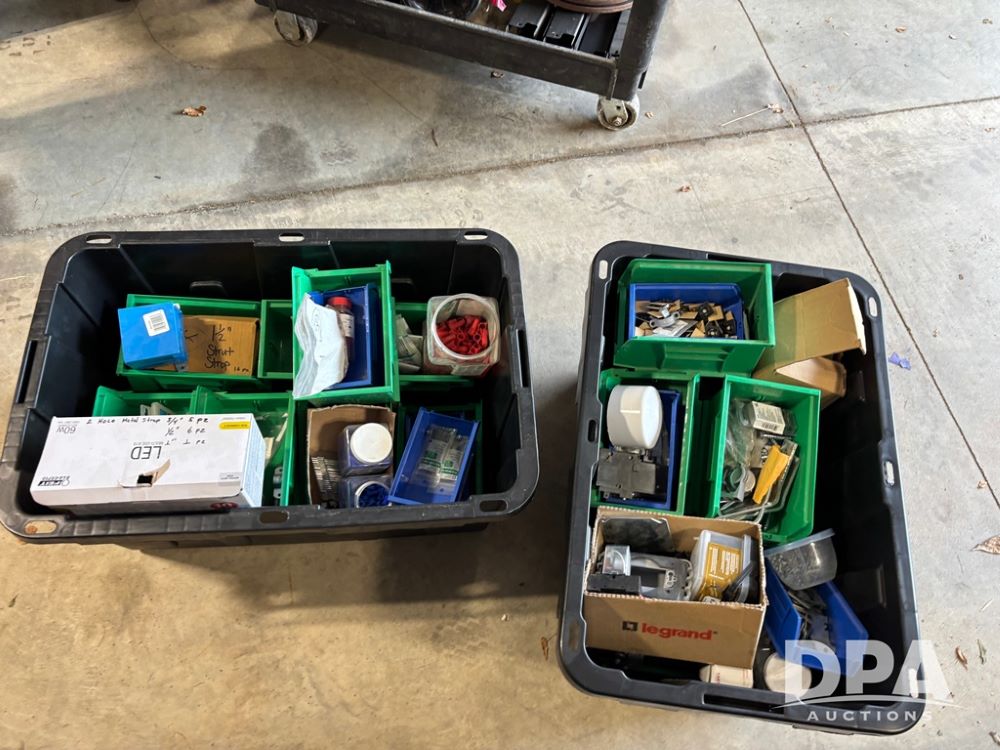 Electrical Hardware (DR12251), (2) totes of assorted electrical hardware, wire nuts, conduit brackets, wire terminals, and pallet covers.
