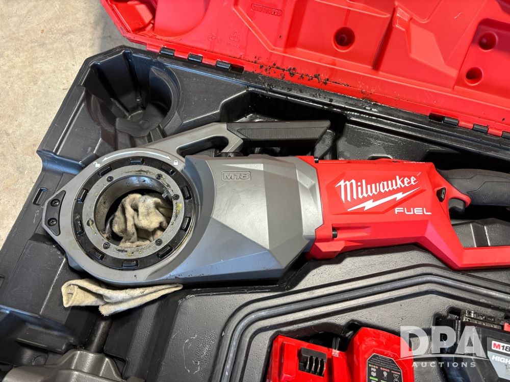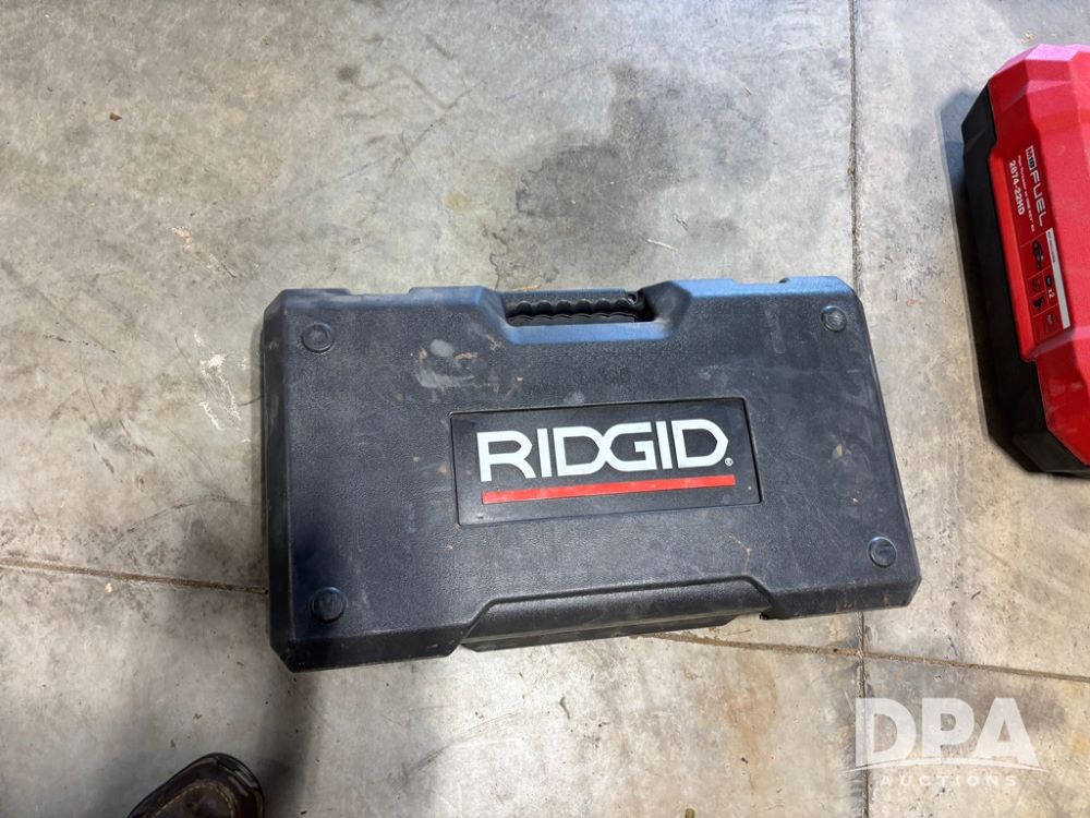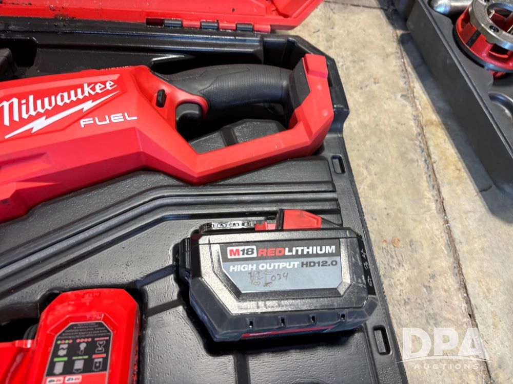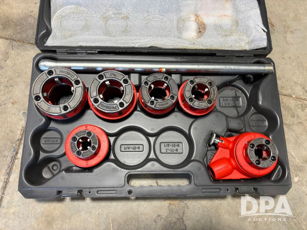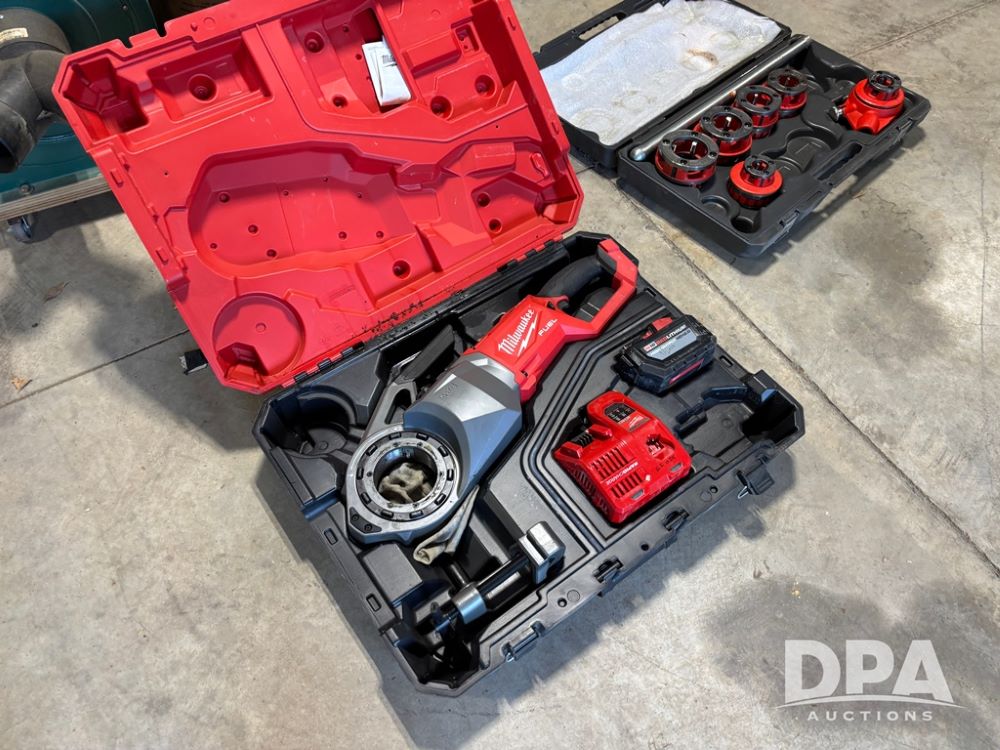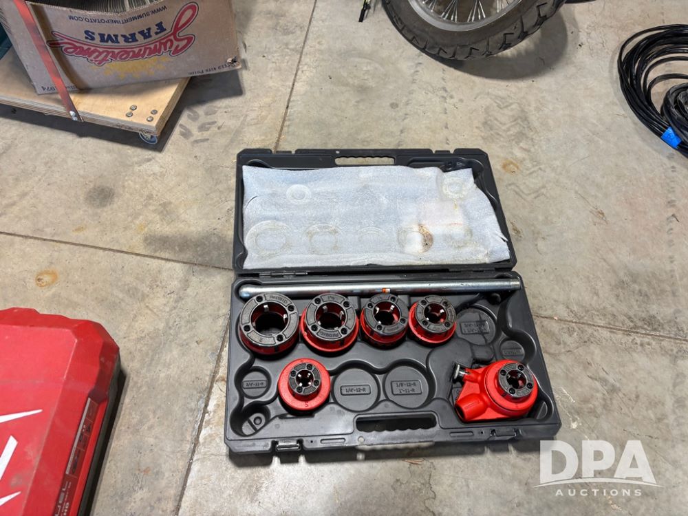 Milwaukee Electric Threader (DR12461), cordless hand held threader, and case of Rigid threaders.