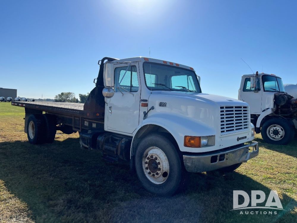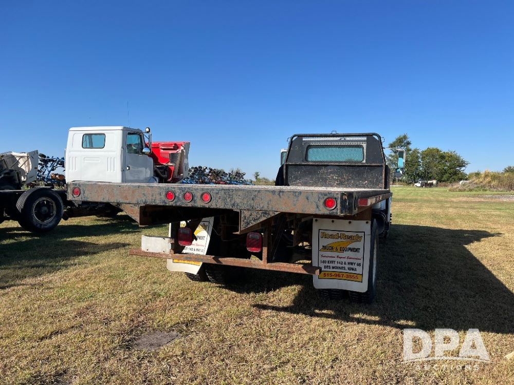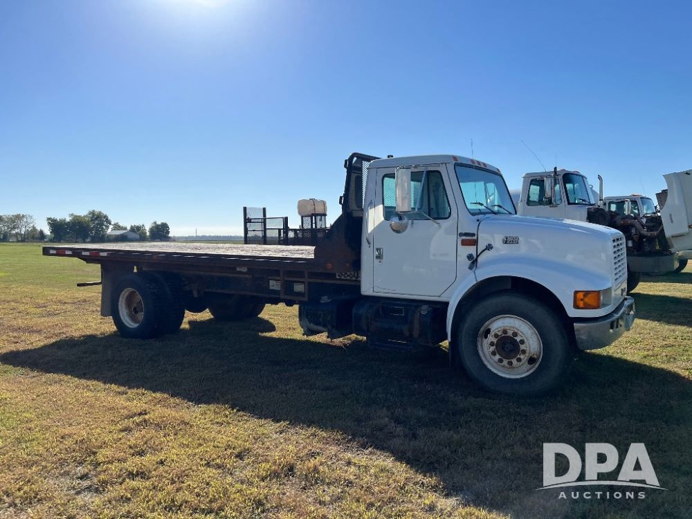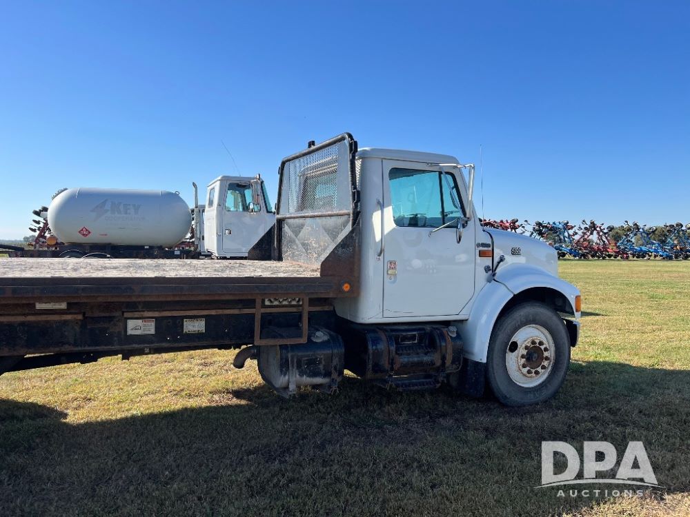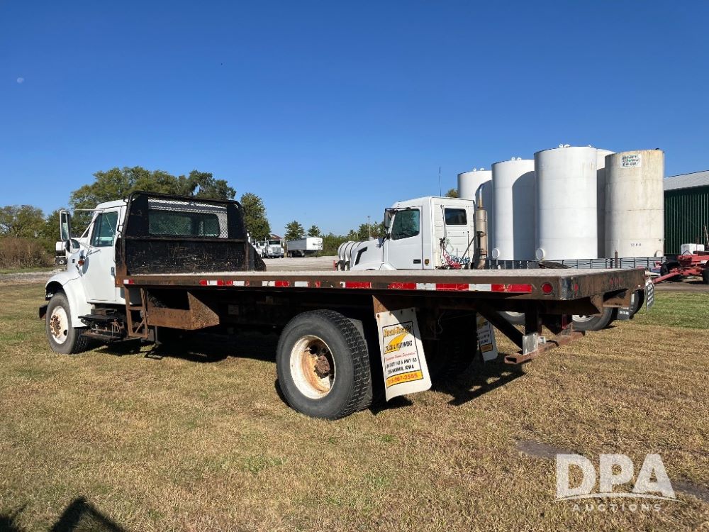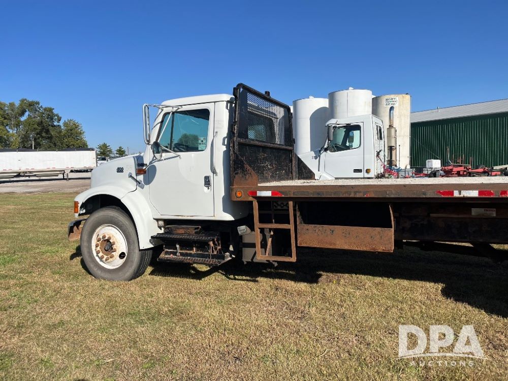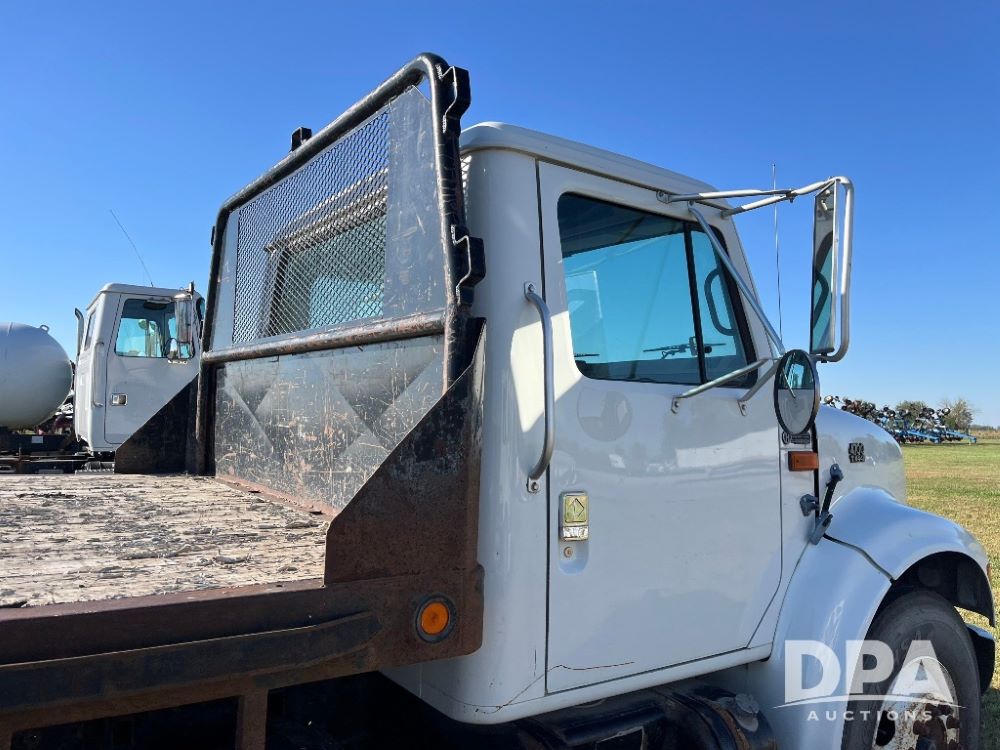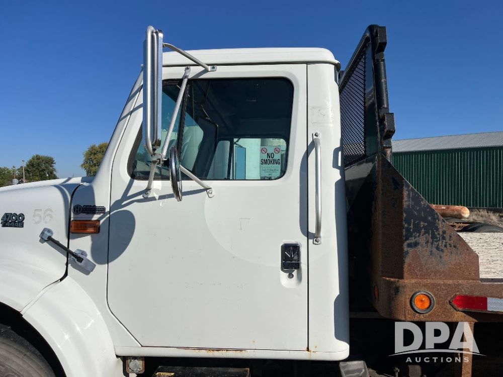 2000 IHC 4700 Flatbed Truck (JN3252, Unit 56), T444E diesel engine, 6 Plus speed transmission, air conditioning, heat, Am/Fm radio, cruise control, single axle, spring suspension, Steel flatbed, wood deck, headache rack, 11R22.5 tires.
