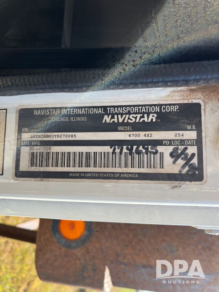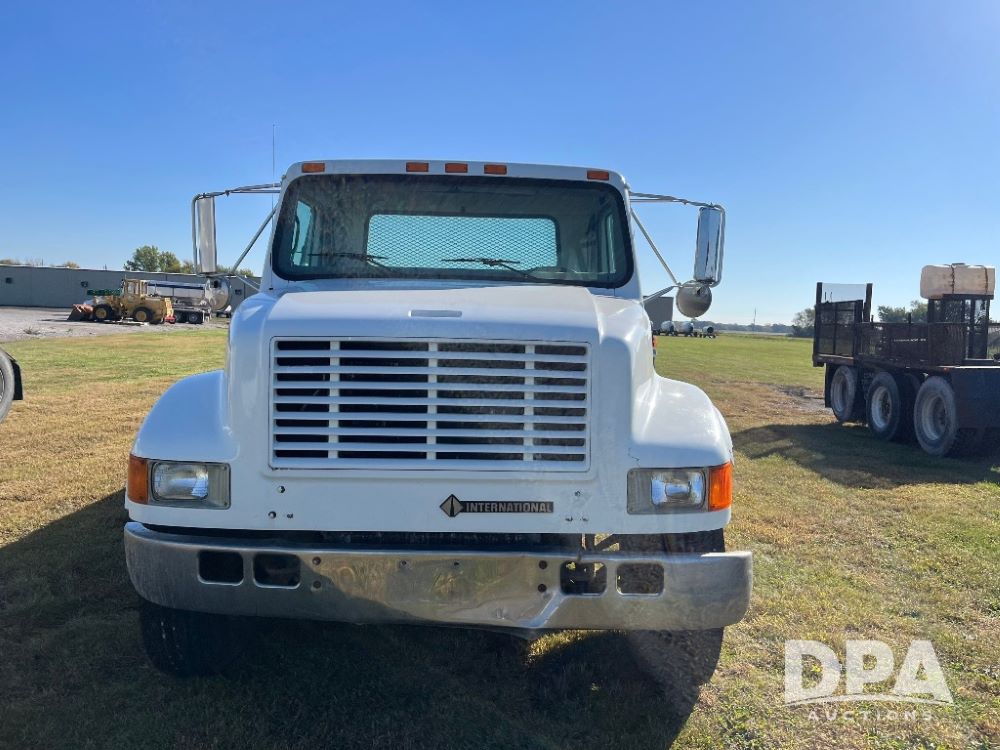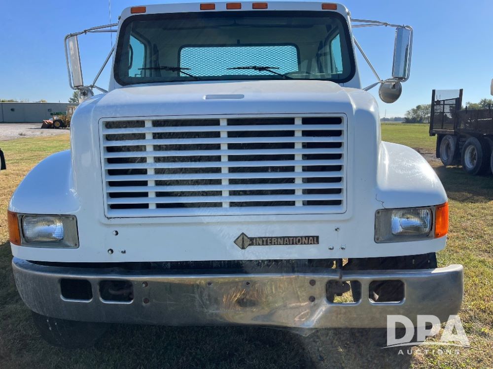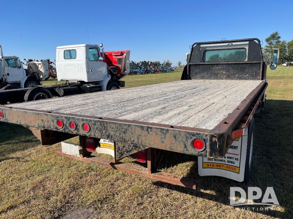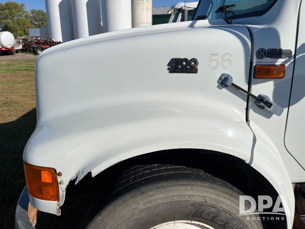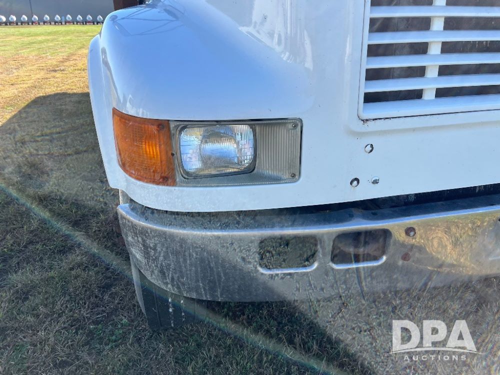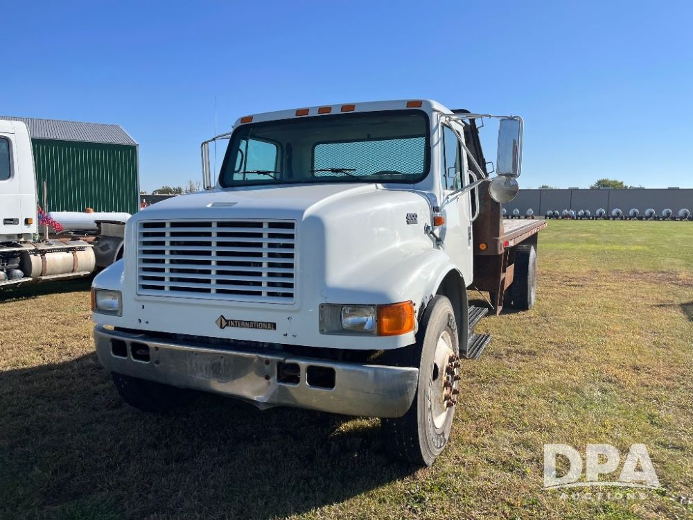 2000 IHC 4700 Flatbed Truck (JN3252, Unit 56), T444E diesel engine, 6 Plus speed transmission, air conditioning, heat, Am/Fm radio, cruise control, single axle, spring suspension, Steel flatbed, wood deck, headache rack, 11R22.5 tires.