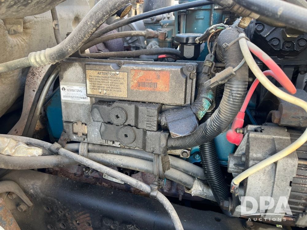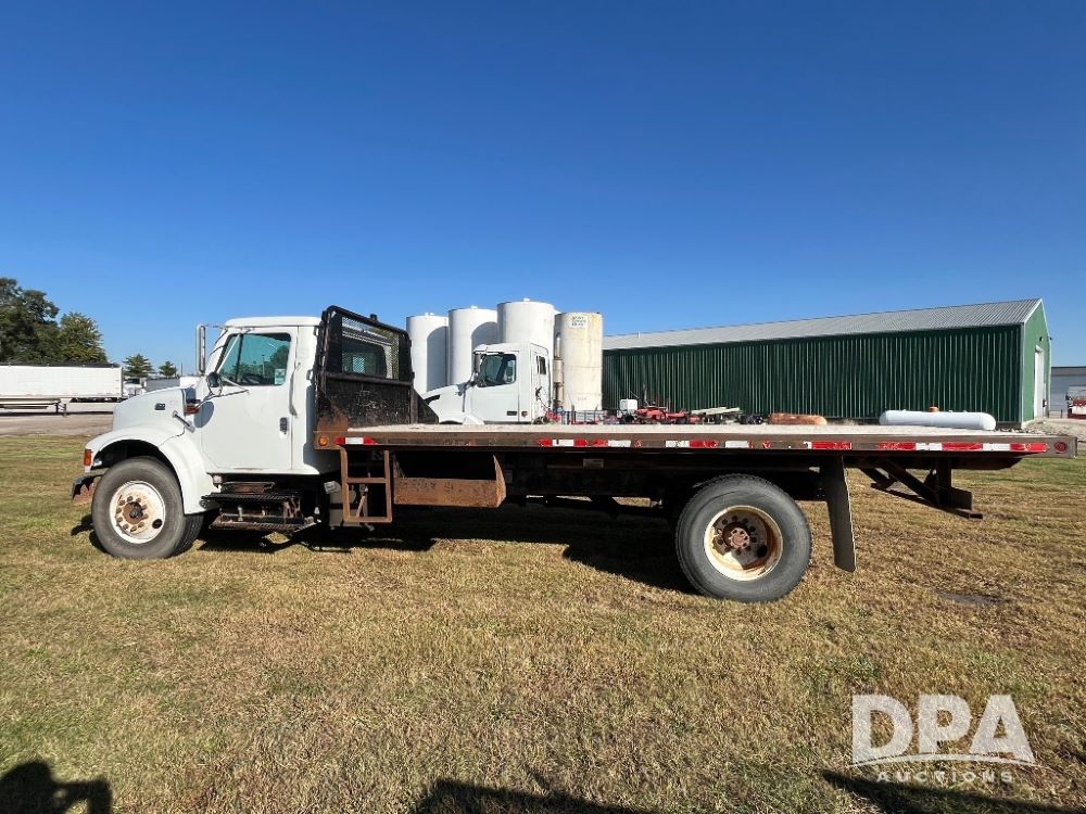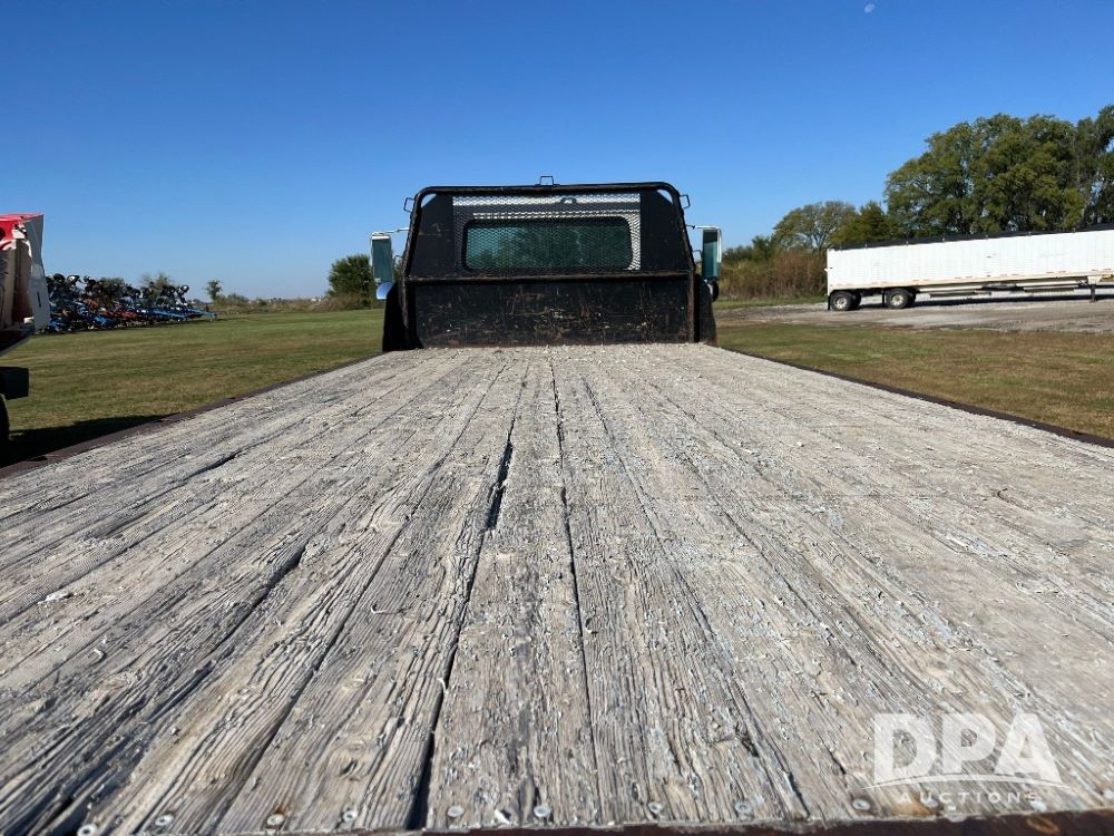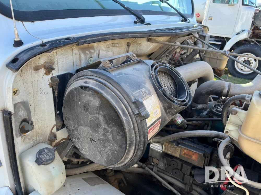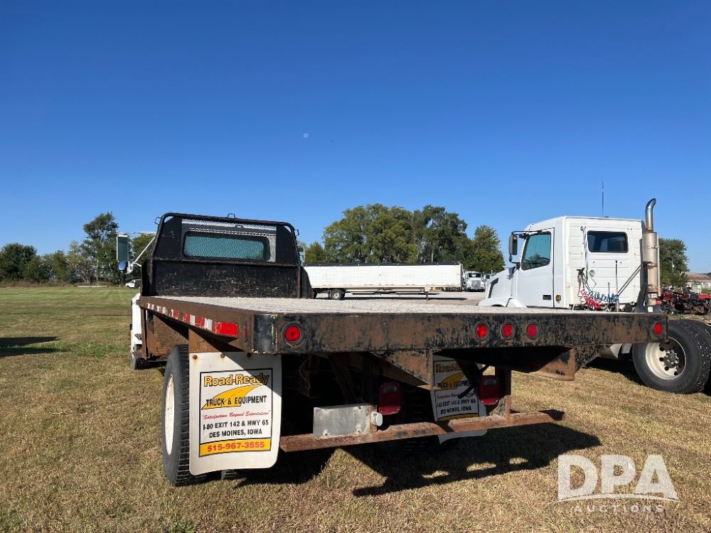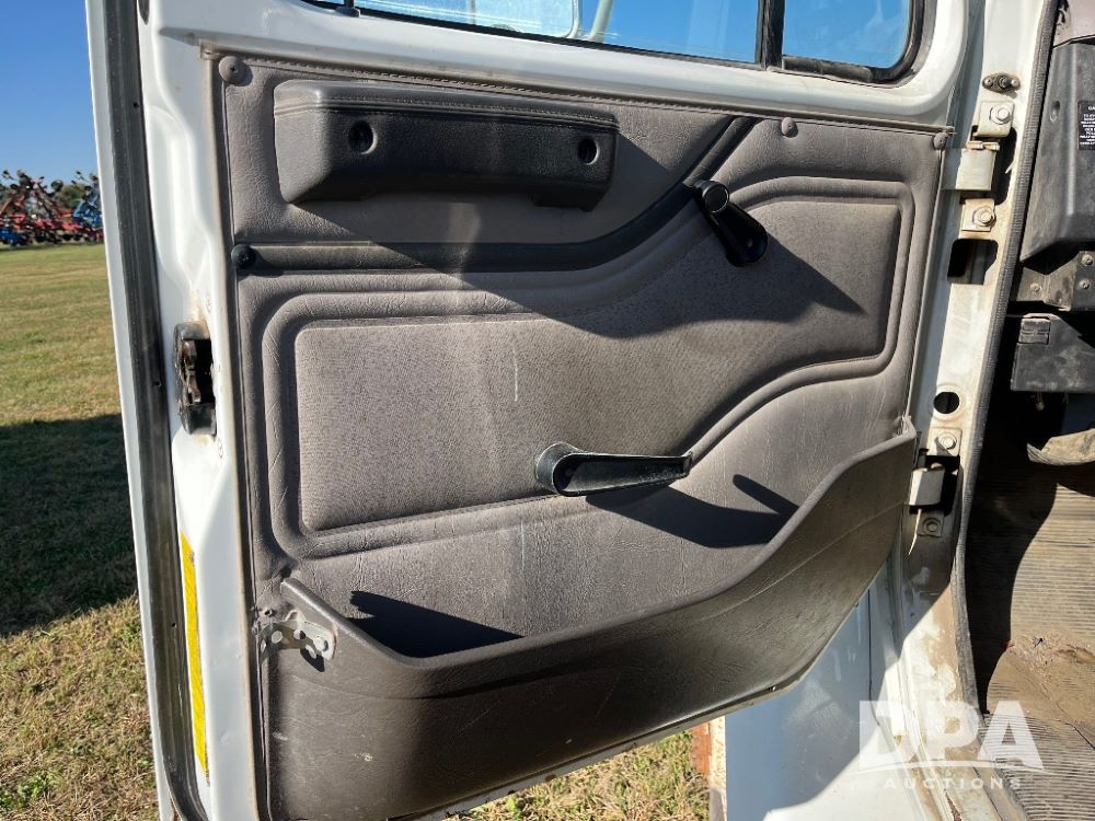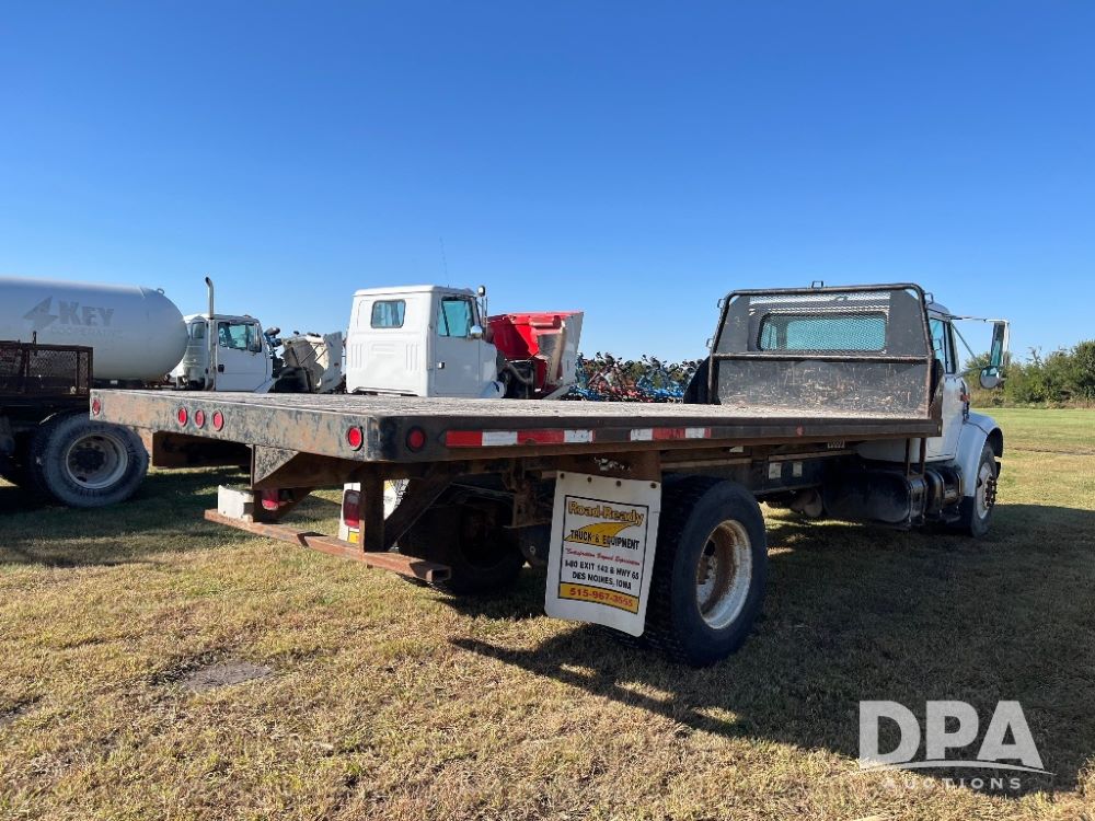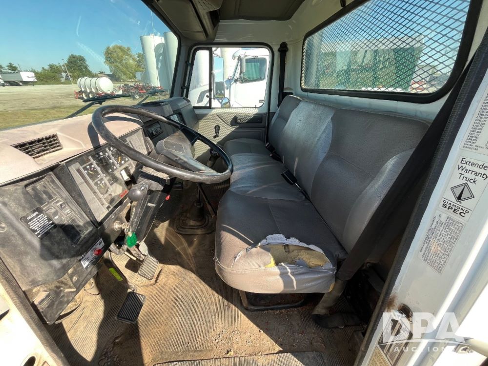 2000 IHC 4700 Flatbed Truck (JN3252, Unit 56), T444E diesel engine, 6 Plus speed transmission, air conditioning, heat, Am/Fm radio, cruise control, single axle, spring suspension, Steel flatbed, wood deck, headache rack, 11R22.5 tires.