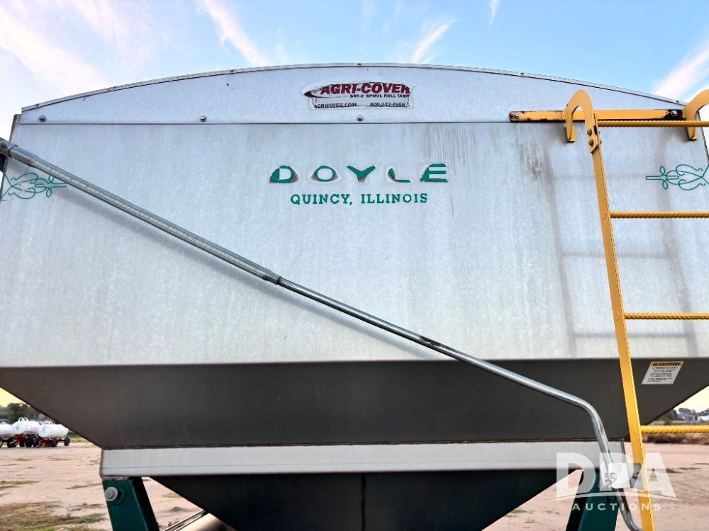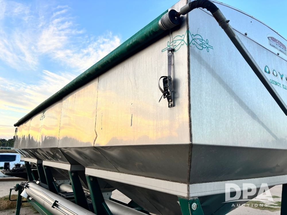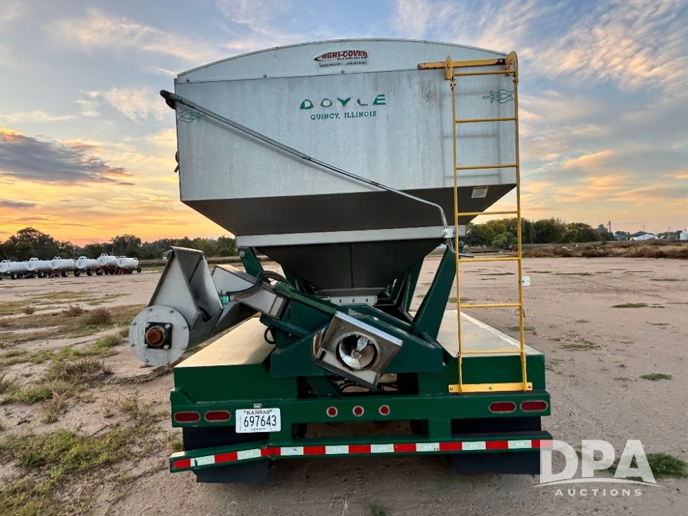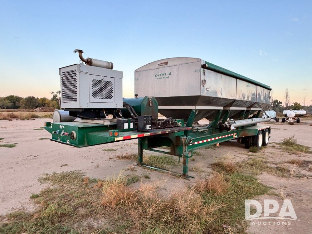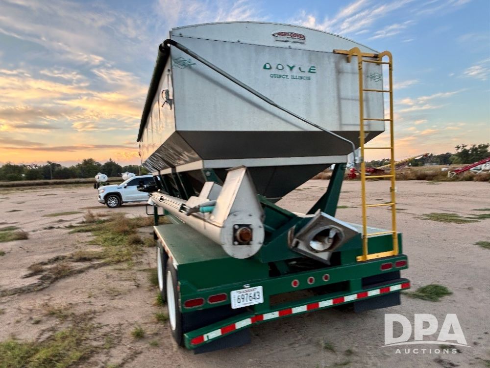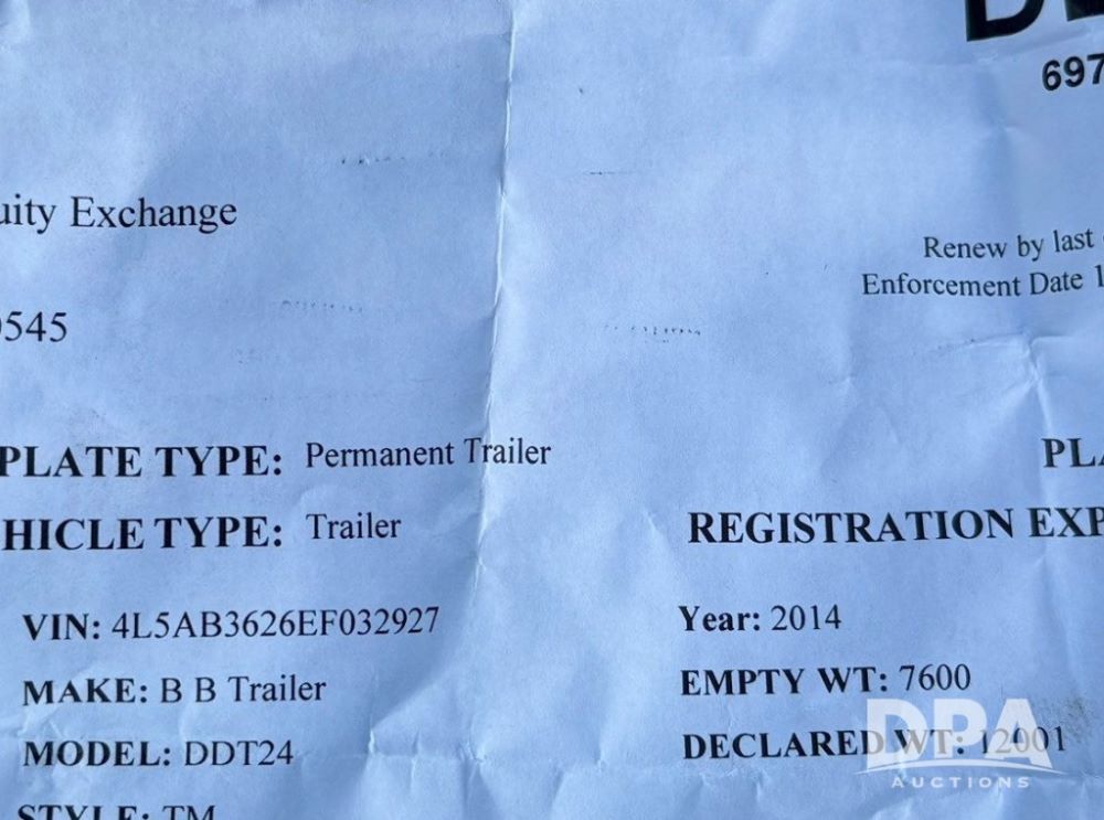 2014 B&B Dry Tender Trailer (GP11697, Unit 927), 2014 B&B Model DDT24 dry tender trailer, Doyle 24 ton stainless steel dry tender box, side discharge auger, hydraulic, roll tarp, rear ladder, self contained diesel engine (shows 282 hours), LOFA Industries electric start control panel, tandem axle, spring suspension, landing gear, 255/70R22.5 tires.