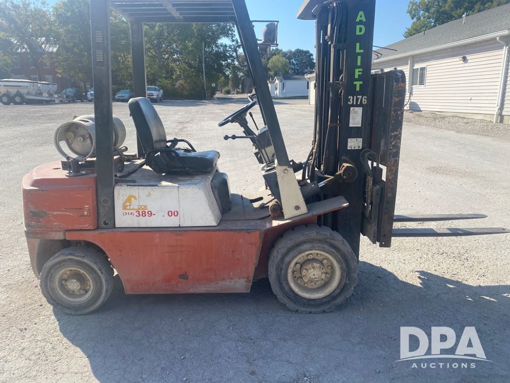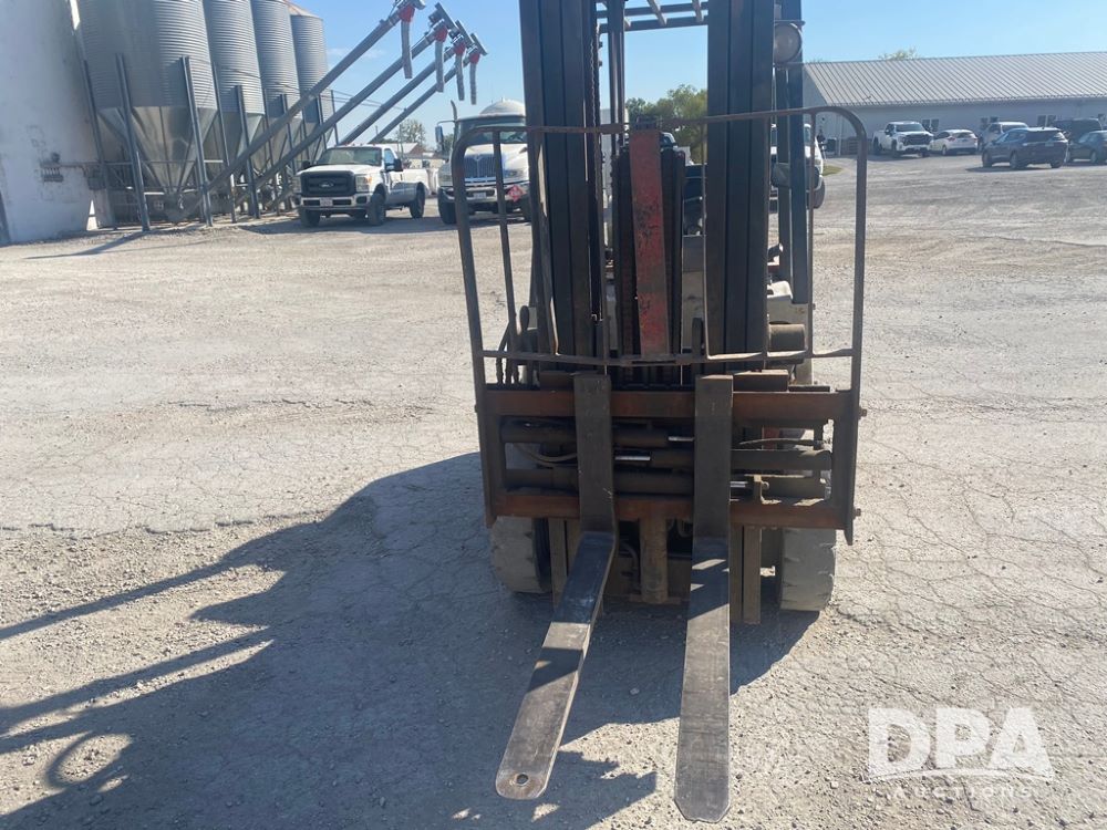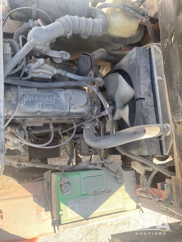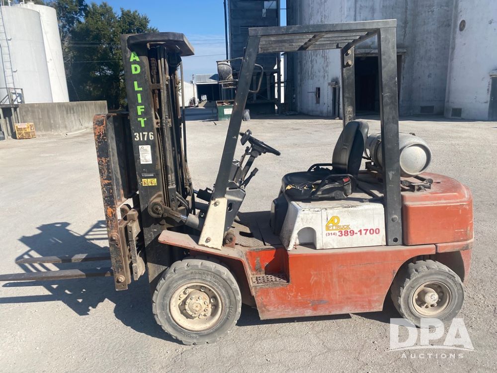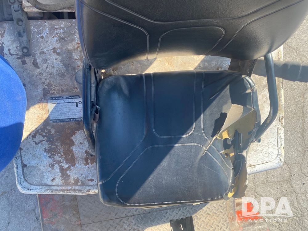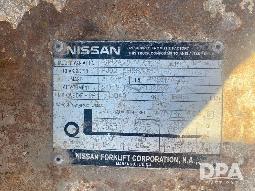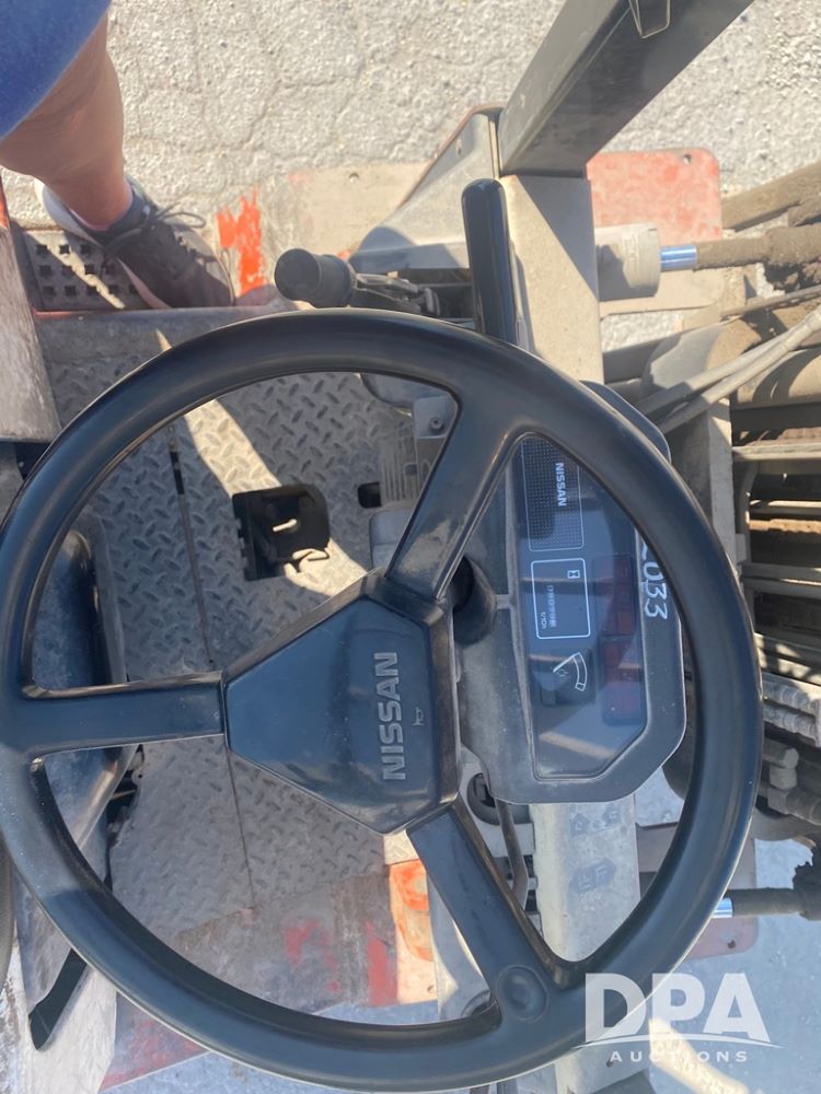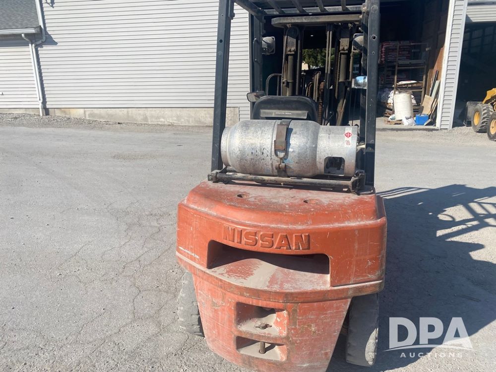 Nissan Forklift (PZ13960, Unit 3176), LP gas engine, shuttle shift transmission, canopy, lights, forks, side shift, 7.00-12 front tires, 6.00-9 rear tires, shows 8,079 hours.