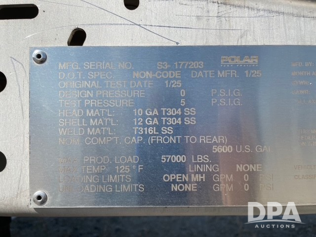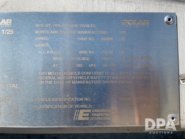 2025 Polar Liquid Transport Trailer (DR12441 Unit T-63), 2025 Polar 5,700 gallon conical stainless steel liquid transport trailer, NO PUMP or belly piping, tandem axle, aluminum rims.