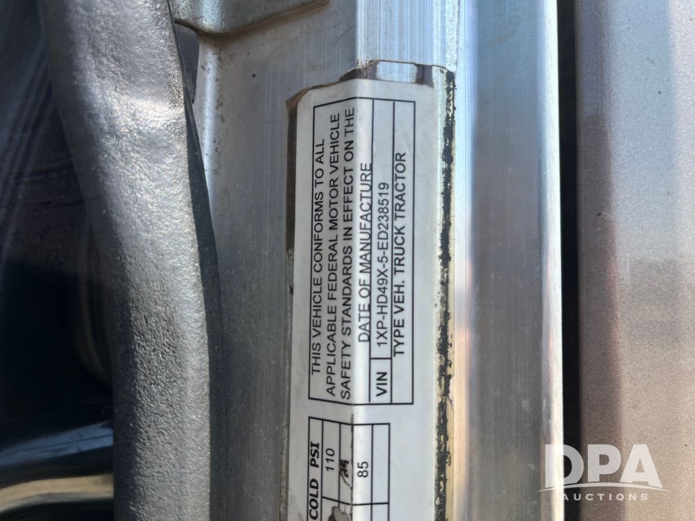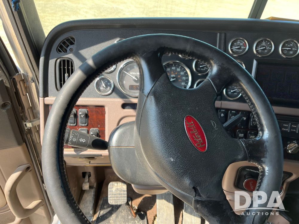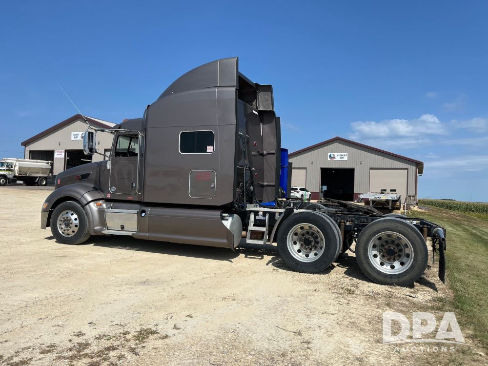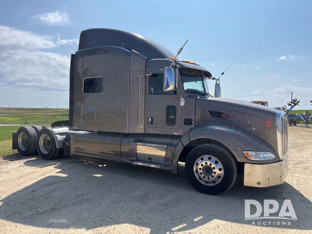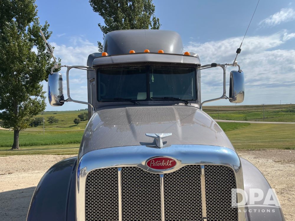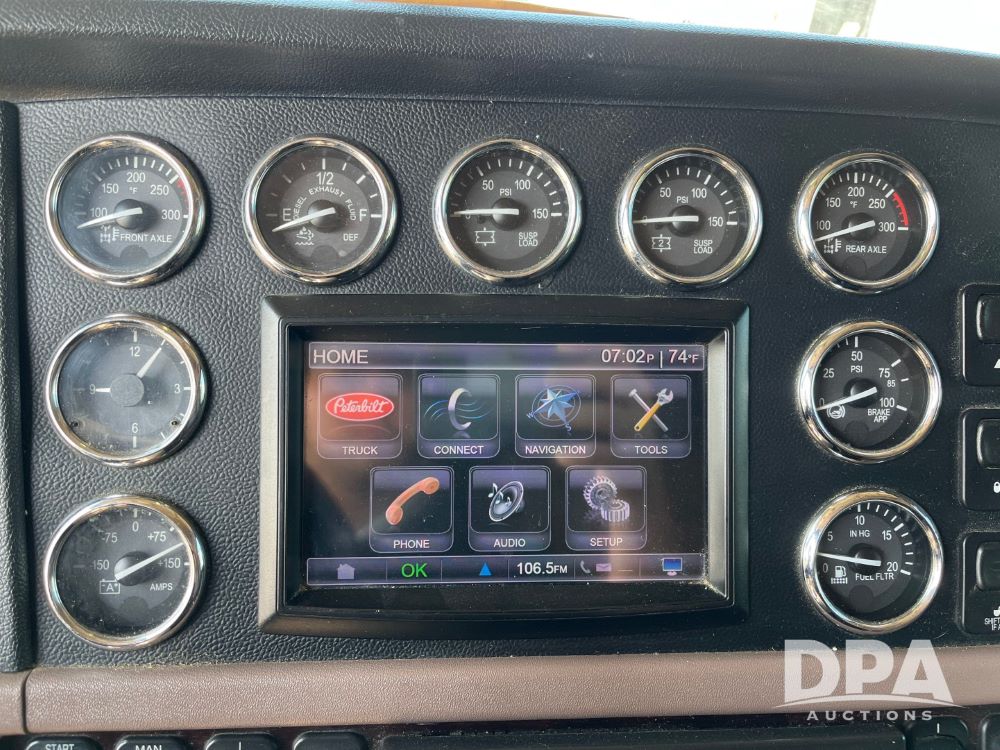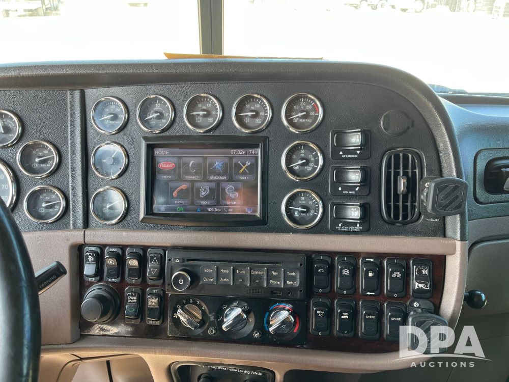 2014 Peterbilt 386 Sleeper Truck (JN3049), Cummins ISX15 450ST diesel engine, Eaton Fuller 18 speed transmission, heat, air conditioning, Am/Fm radio, sleeper, cruise control, touch screen, microwave, refrigerator, air ride cab, tandem axle, air ride suspension, sliding 5th wheel plate, 295/75R22.5 front tires, 285/75R24.5 rear tires, engine heater, dual fuel tanks, shows 1,335,542 miles.