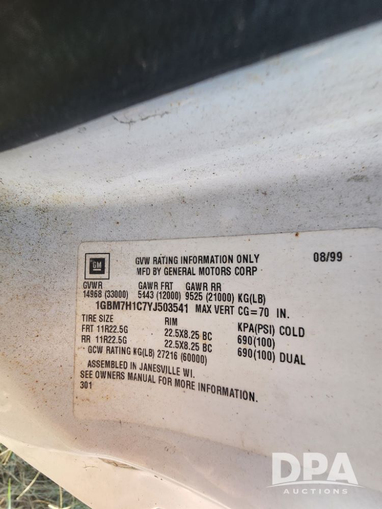 2000 Chevrolet 7500 Flatbed Truck (LT1444), Cat engine, 6 speed transmission, 22 ft flatbed, shows 260,079 miles.