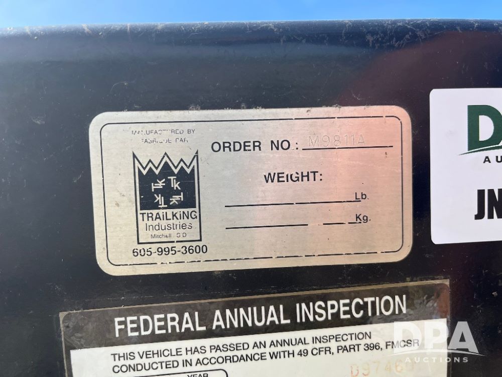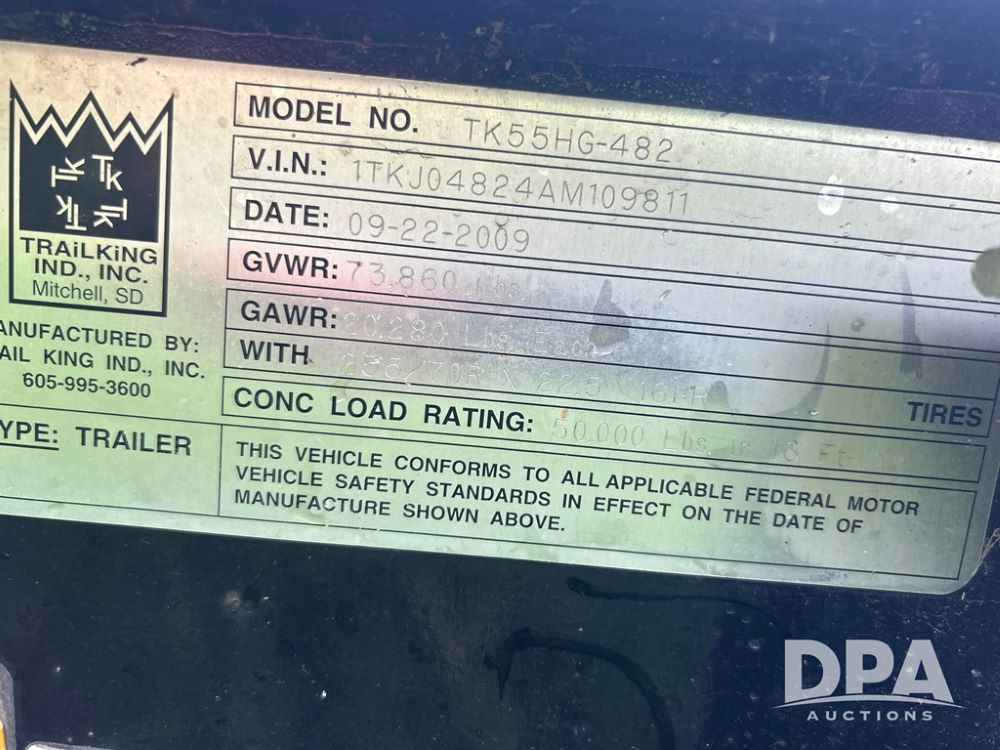 2010 Trail King HG Series Lowboy Trailer (JN2492), 2010 Trail King HG Series Lowboy trailer, Model TK55HG-482, tandem axle, air ride suspension, gas pony motor, 255/70R22.5 tires, CONC LOAD RATING: 50,000 pounds in 16 ft, GVWR 73,860 pounds.