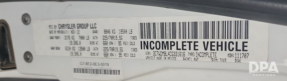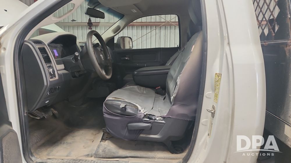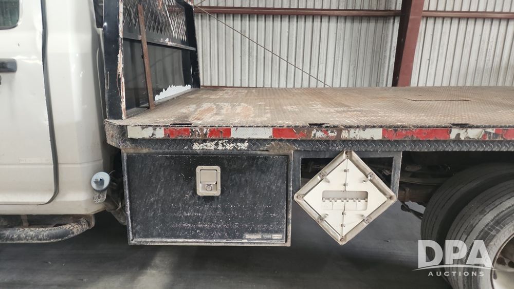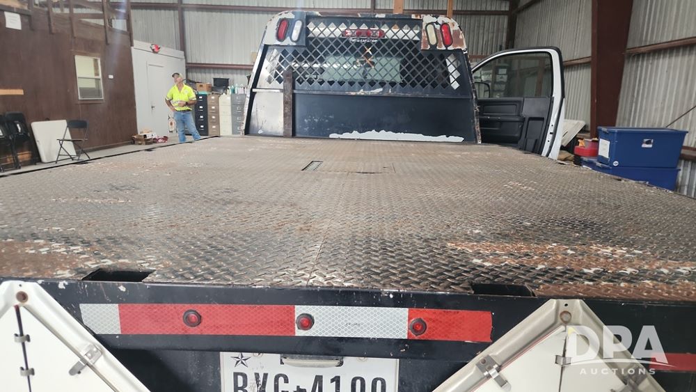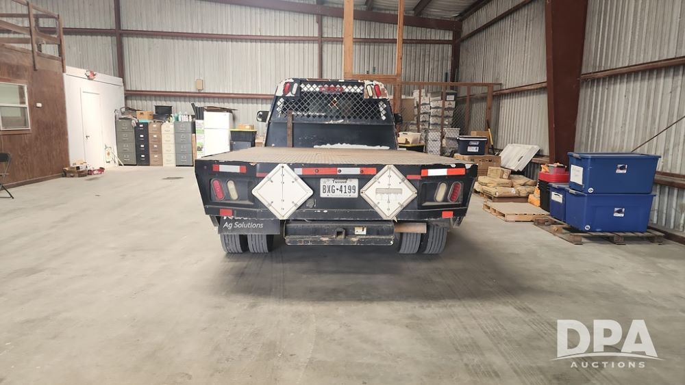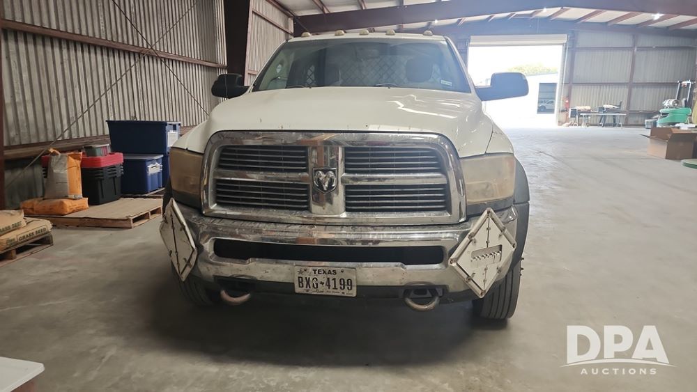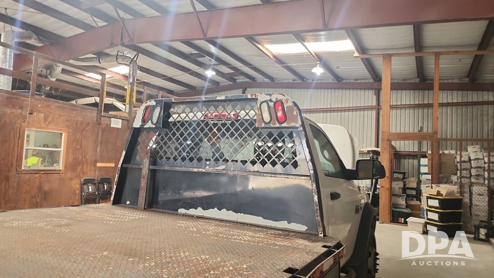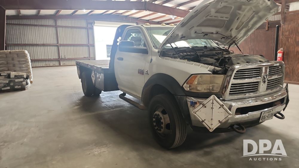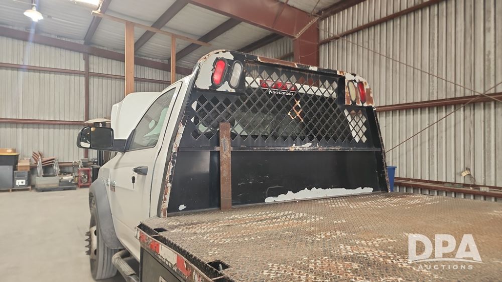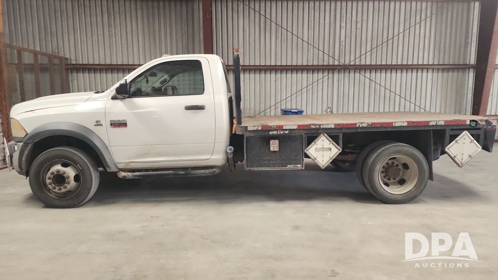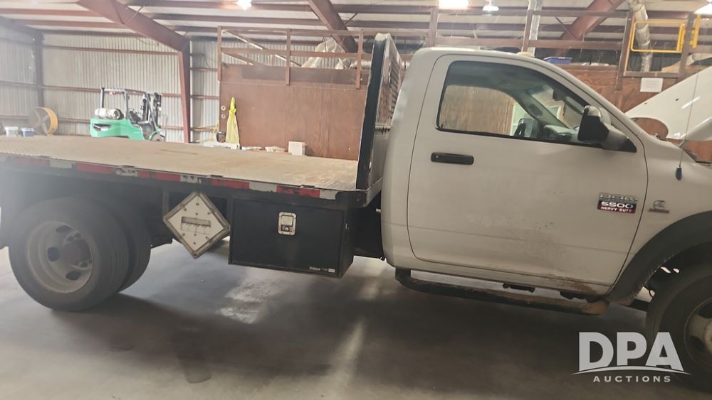 2012 Dodge Ram 5500 Flatbed Truck (PZ13977, Unit 00248), Cummins 6.7L Turbo diesel engine, automatic transmission, air conditioning, heat, Am/Fm CD radio, power windows & locks, dually, steel flatbed, headache rack, rear hitch, 225/70R19.5 tires, shows 341,632 miles.