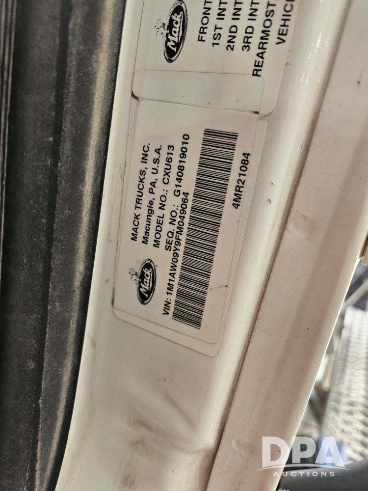 2015 Mack Pinnacle CXU600 Truck (JM647), diesel engine, Eaton Fuller manual transmission, air ride suspension, air brakes, air conditioning, heat, AM/FM/CD radio, sliding fifth wheel plate, 295/75R22.5 tires, 19,230 engine hours, 457,608 miles.