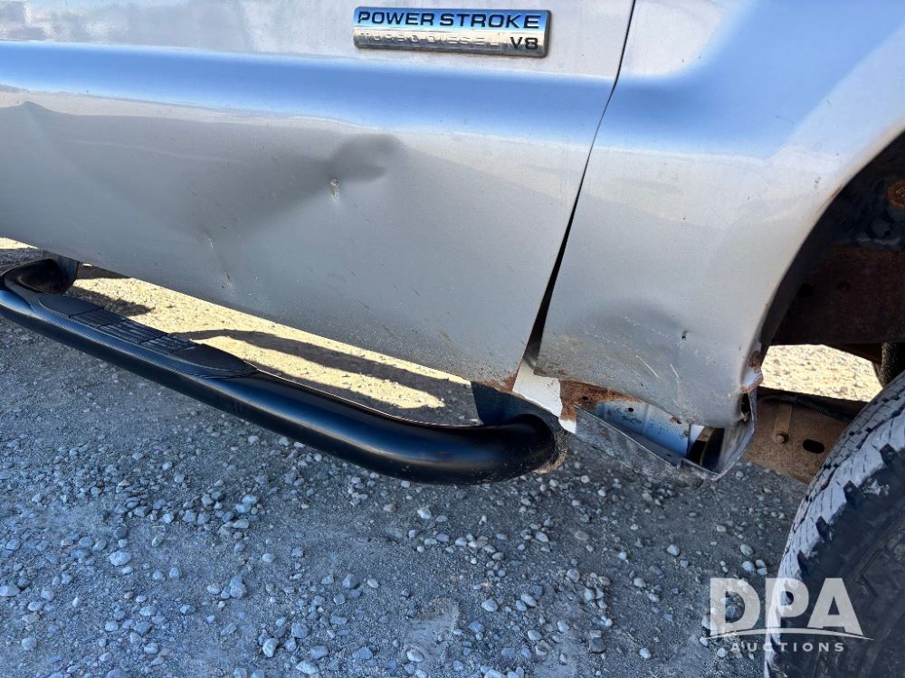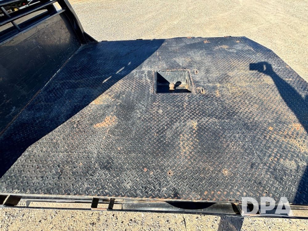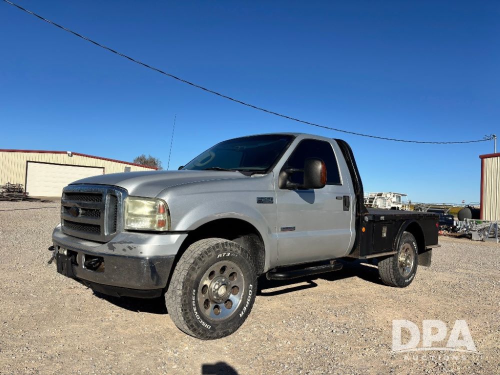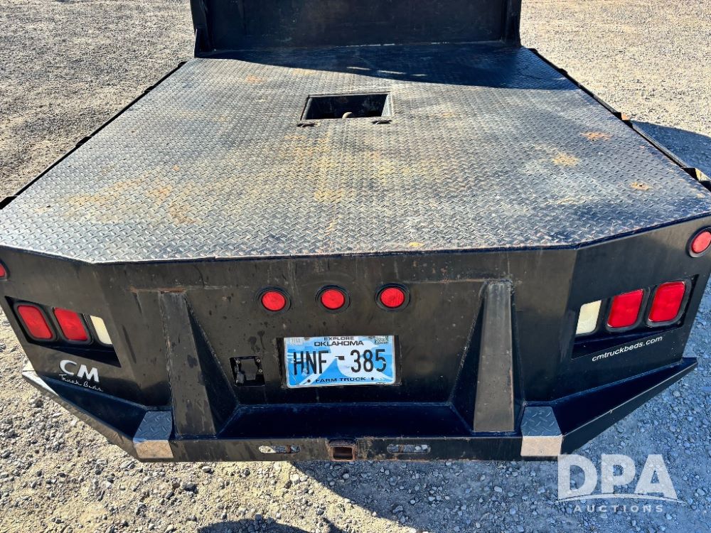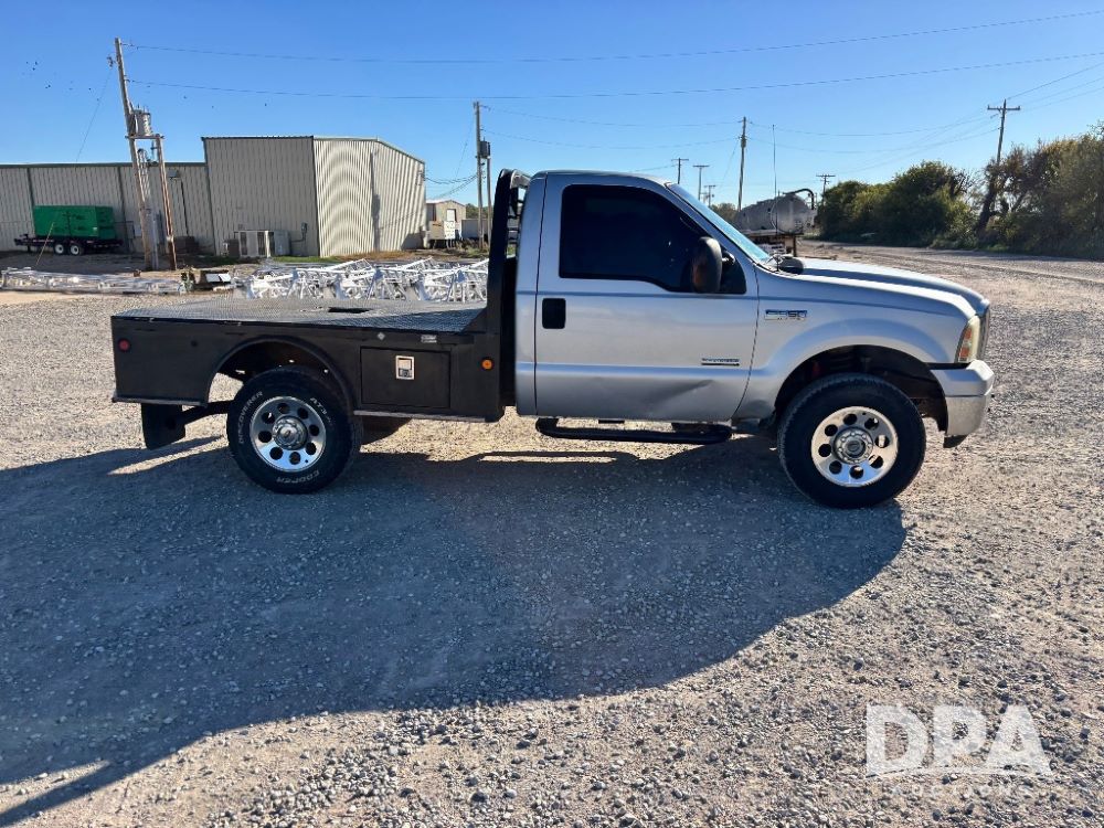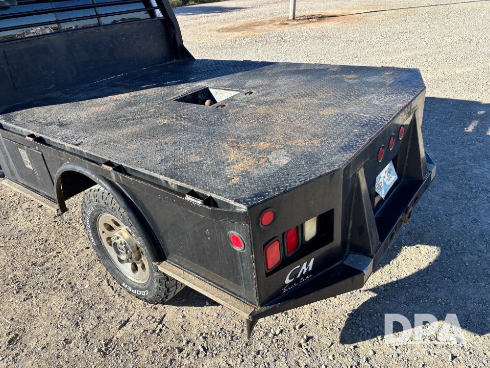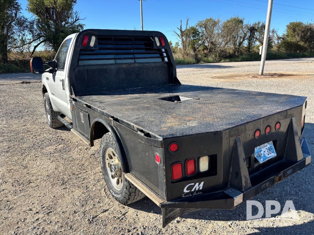 2006 Ford F-350 XLT Super Duty 4x4 Flatbed Pickup (GP11728), regular cab, Power Stroke V8 turbo diesel engine, automatic transmission, heat, Am/Fm radio, cloth interior, power windows, locks and mirrors, cruise control, CM Truck Beds rear flatbed, 5th wheel ball hitch, running boards, driver door keypad, LT275/70R18 tires, shows 206,572 miles.
