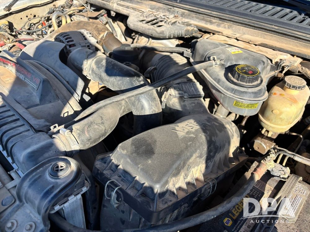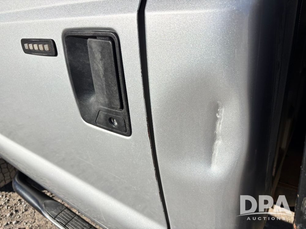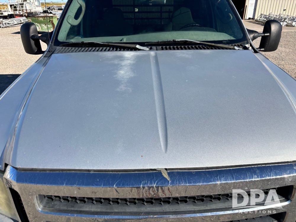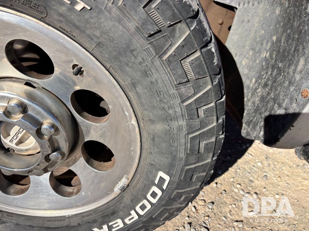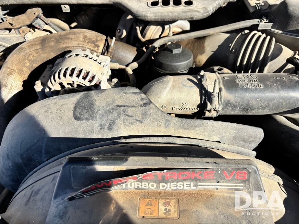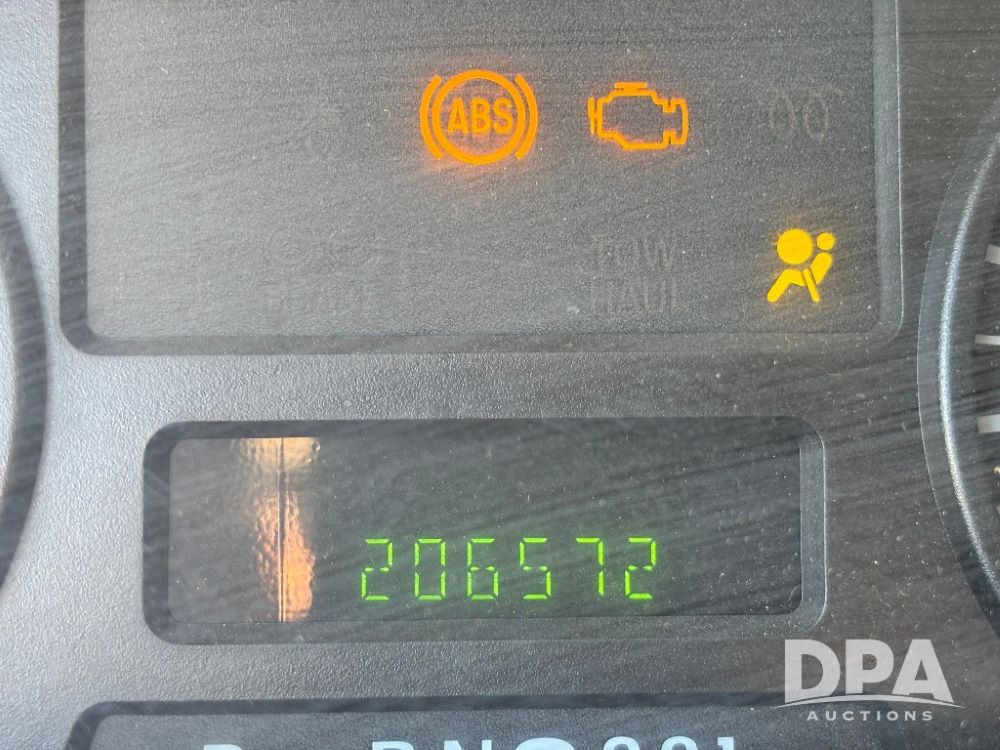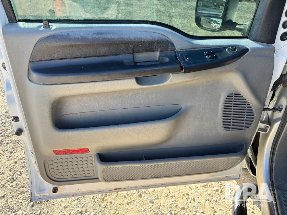 2006 Ford F-350 XLT Super Duty 4x4 Flatbed Pickup (GP11728), regular cab, Power Stroke V8 turbo diesel engine, automatic transmission, heat, Am/Fm radio, cloth interior, power windows, locks and mirrors, cruise control, CM Truck Beds rear flatbed, 5th wheel ball hitch, running boards, driver door keypad, LT275/70R18 tires, shows 206,572 miles.
