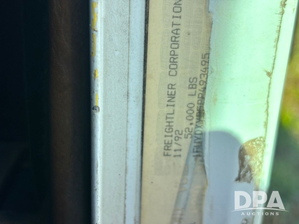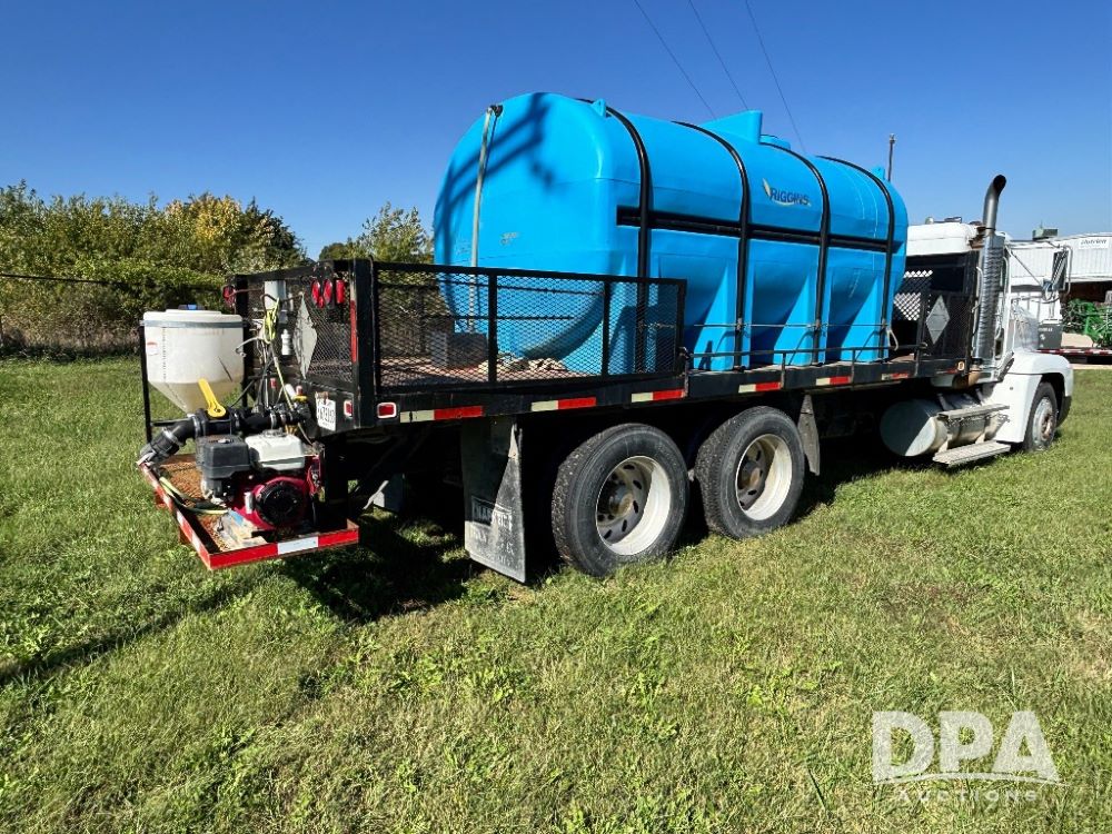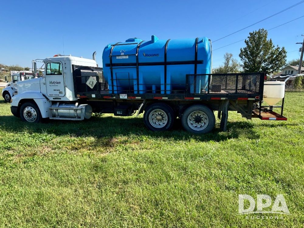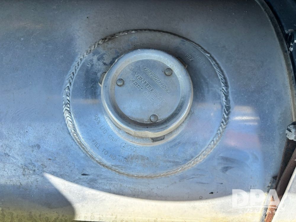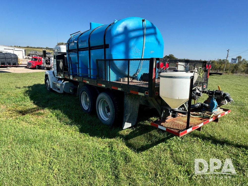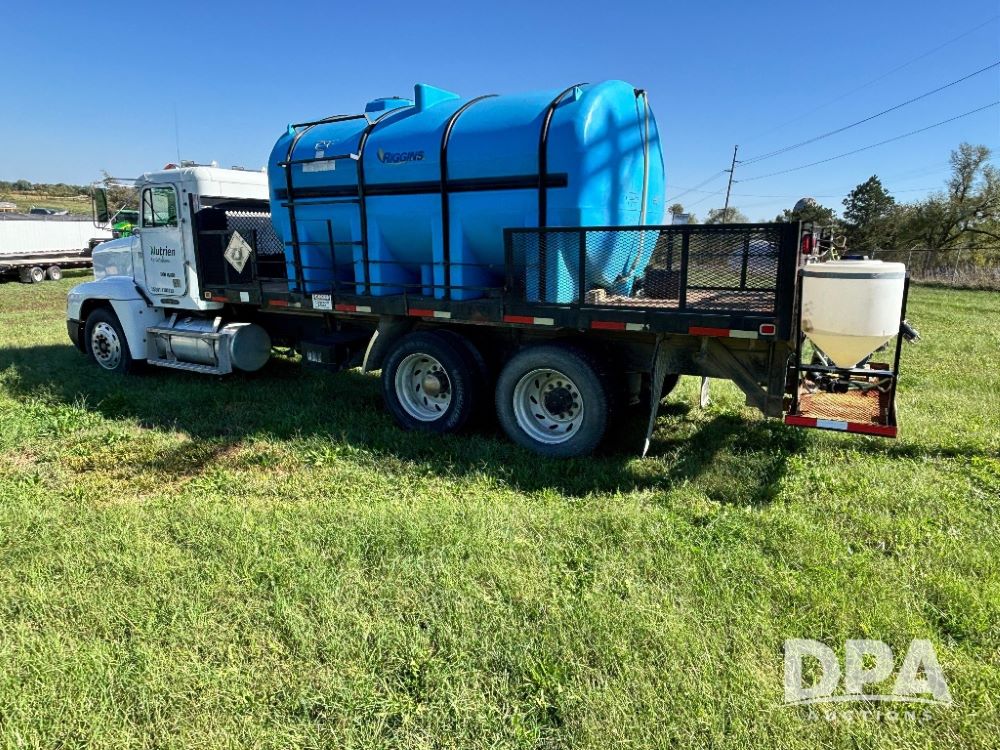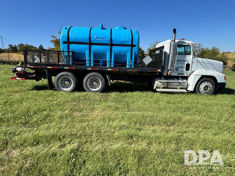 1993 Freightliner FLD120 Liquid Nurse Truck (GP11721, Unit 126178), Cat 3406 diesel engine, Eaton Fuller 9 speed transmission, heat, Am/Fm radio, cruise control, tandem axle, air ride suspension, Ace Roto-Mold 3,200 gallon poly flat bottom liquid tank, poly cone bottom inductor tank/stand, Honda electric start gas motor, pump, 285/75R24.5 front tires, 275/80R24.5 rear tires, GVWR 52,000 pounds, shows 334,050 miles.
