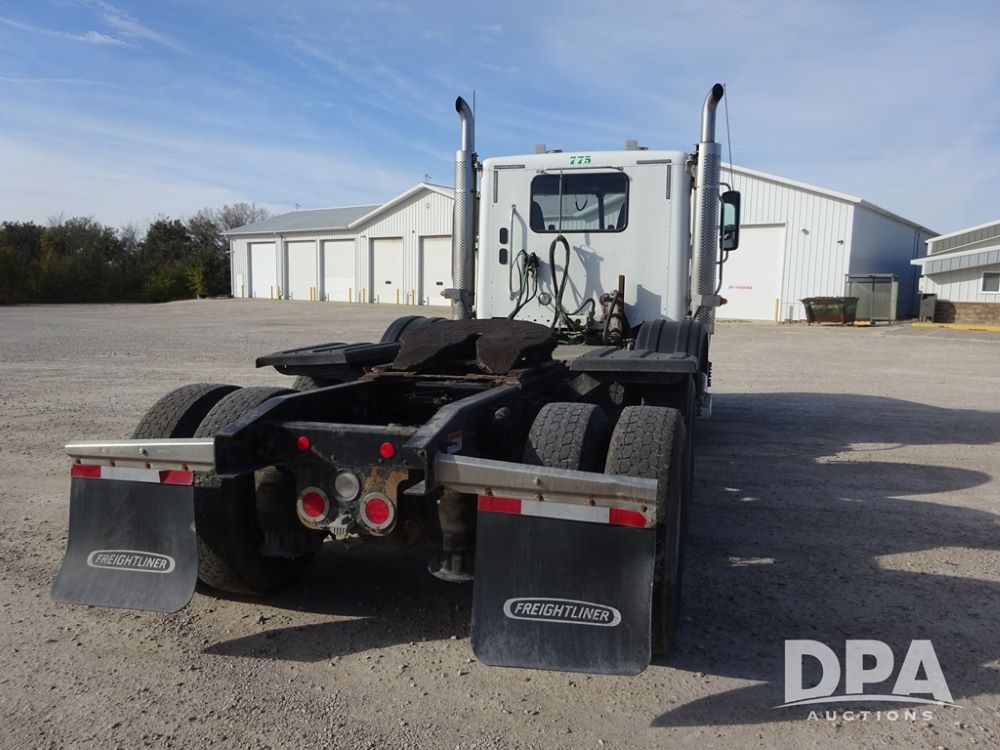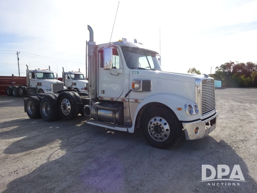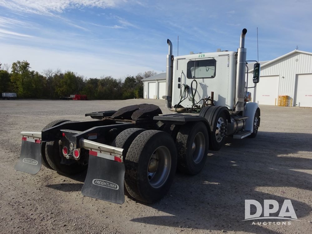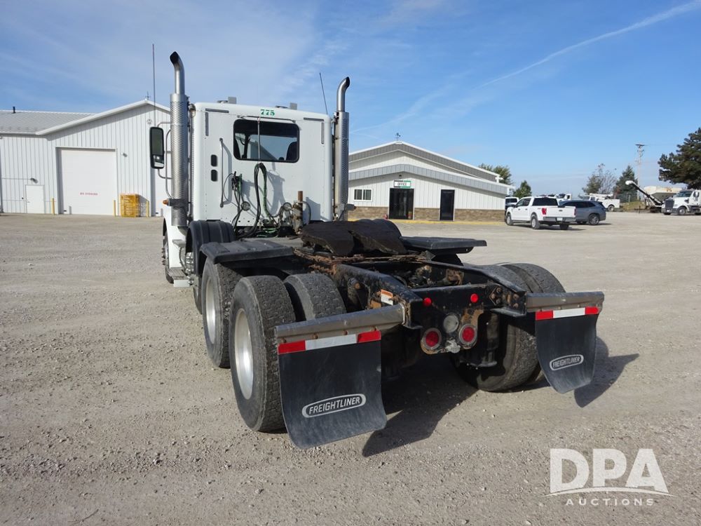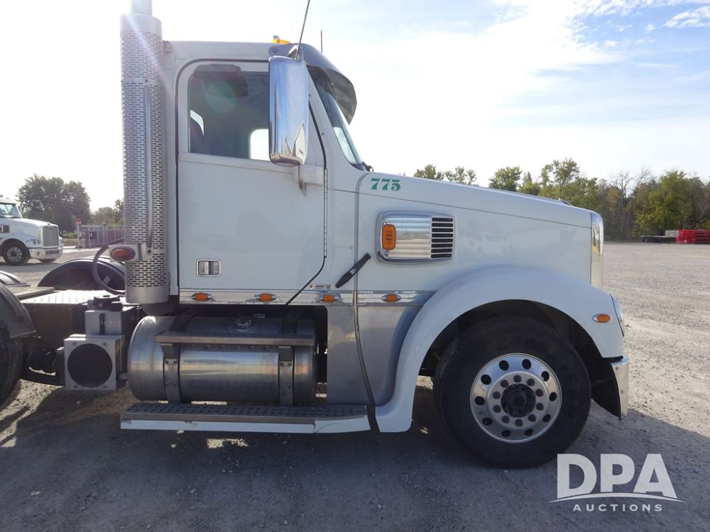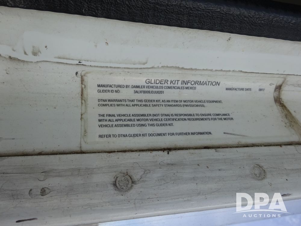 2018 Freightliner Coronado Day Cab Glider Truck (PZ13985, Unit 775), Detroit Series 60 diesel engine, Eaton Fuller 13 speed transmission, air conditioning, heat, Am/Fm CD radio, cruise control, engine brake, power windows & locks, 5th wheel, wet kit, tandem axle, full screw, air ride suspension, quarter fenders, pusher axle, fenders, 295/75R22.5 tires, aluminum rims, 295/75R22.5 pusher tires, aluminum rims, shows 524,728 miles.