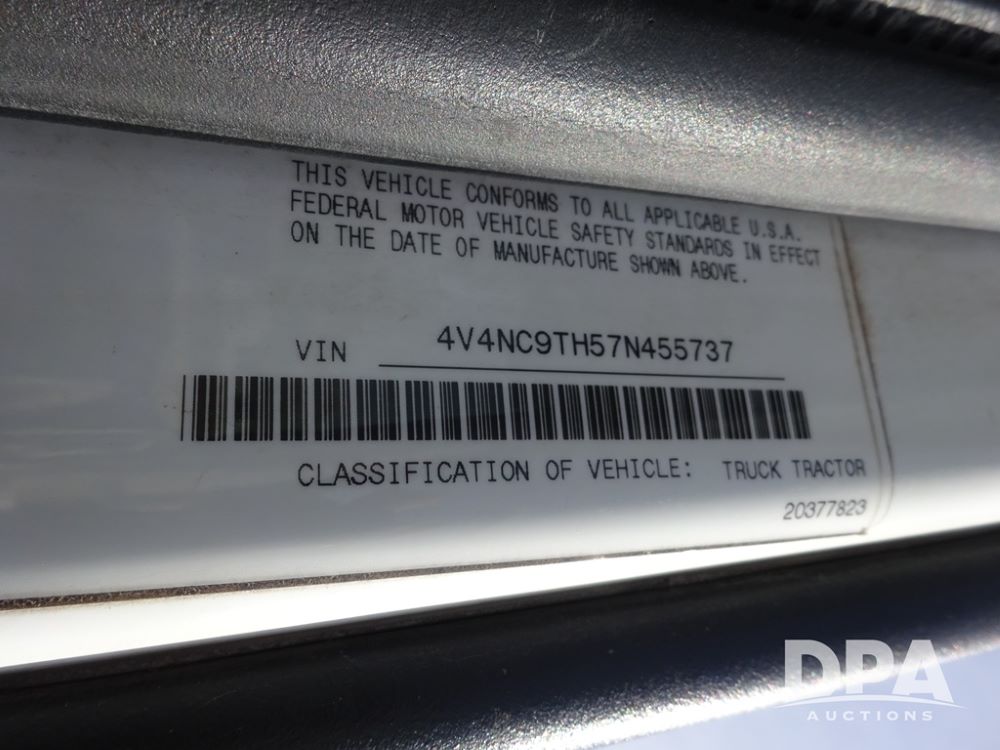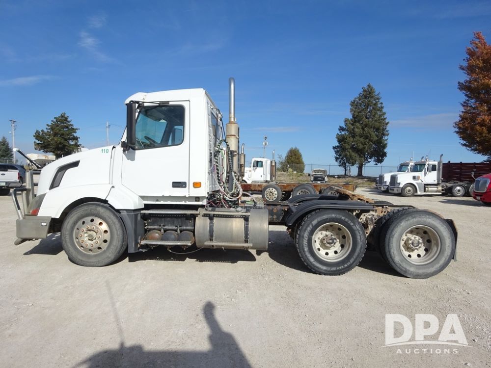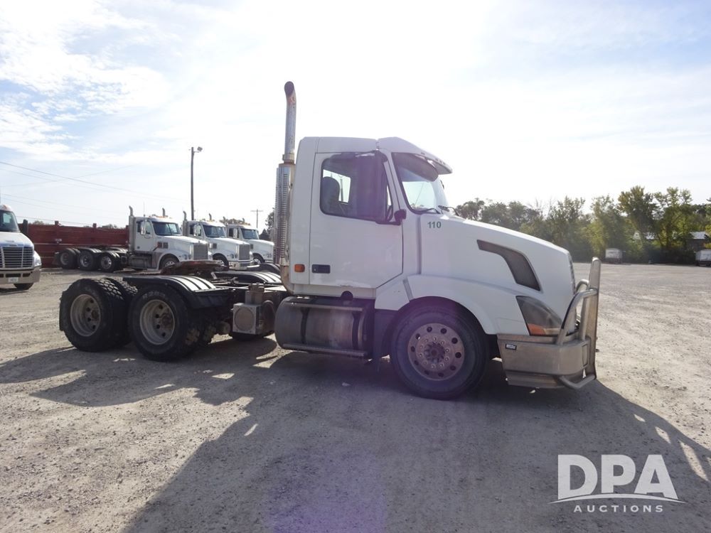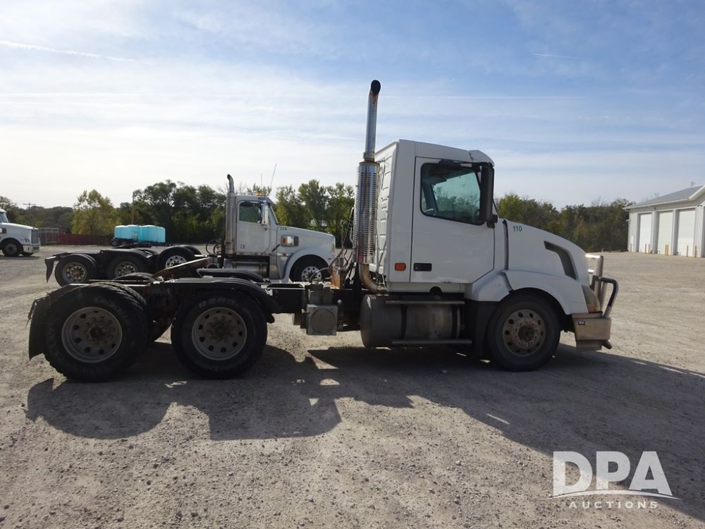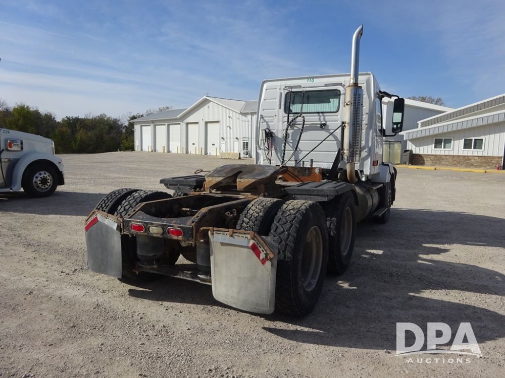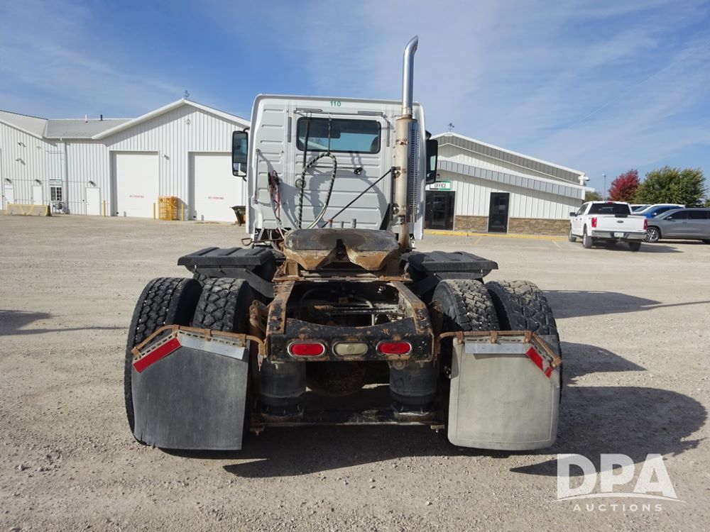 2007 Volvo VNL Day Cab Truck (PZ13987, Unit 110), Cummins ISX 450ST diesel engine, Eaton Fuller 10 speed transmission, air conditioning, heat, Am/Fm CD radio, cruise control, engine brake, power windows & locks, Grill Guard, 5th wheel, wet kit, tandem axle, full screw, air ride suspension, quarter fenders, 11R22.5 tires, aluminum rims, shows 565,542 miles.