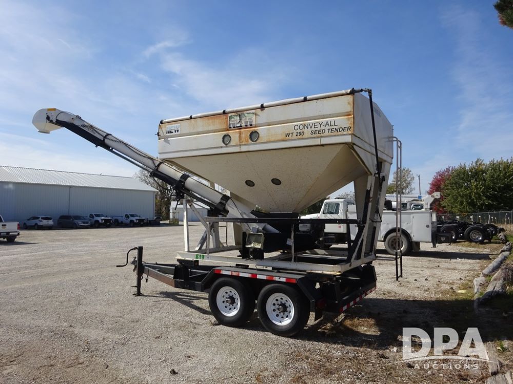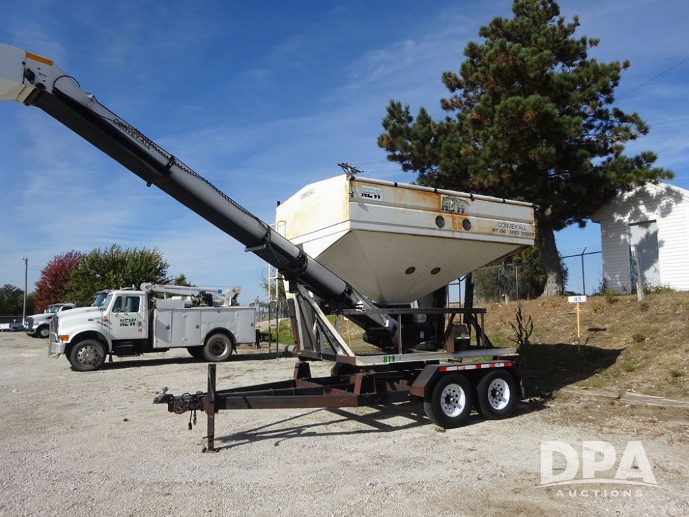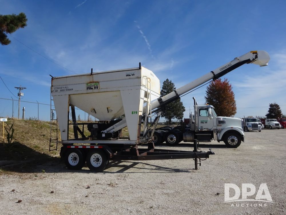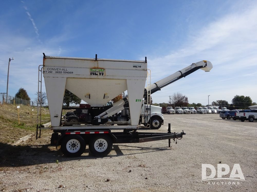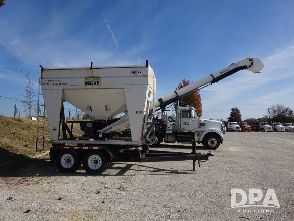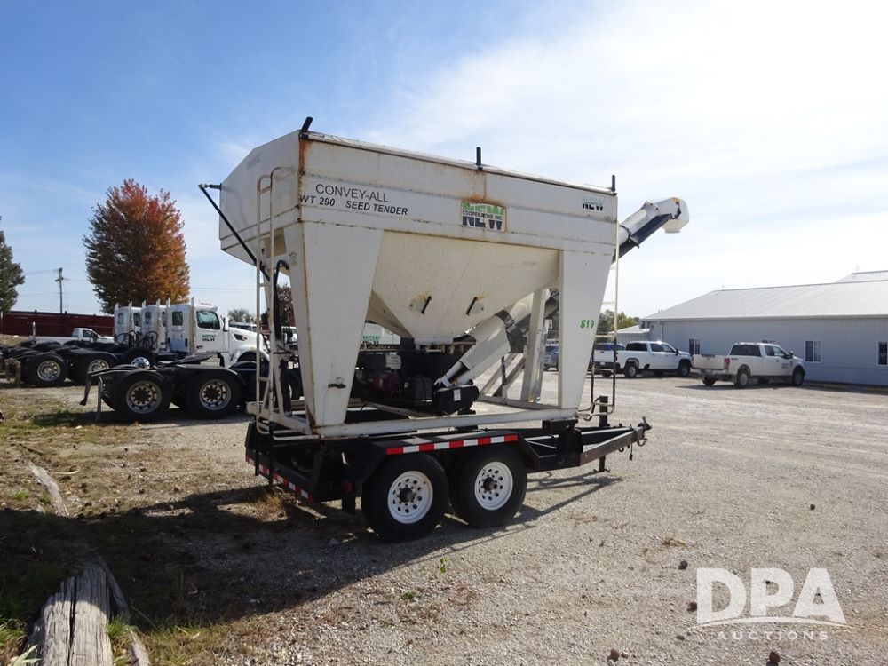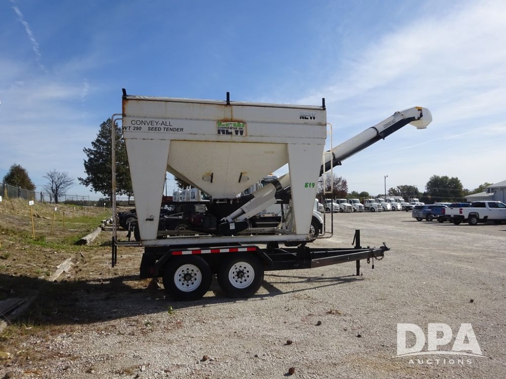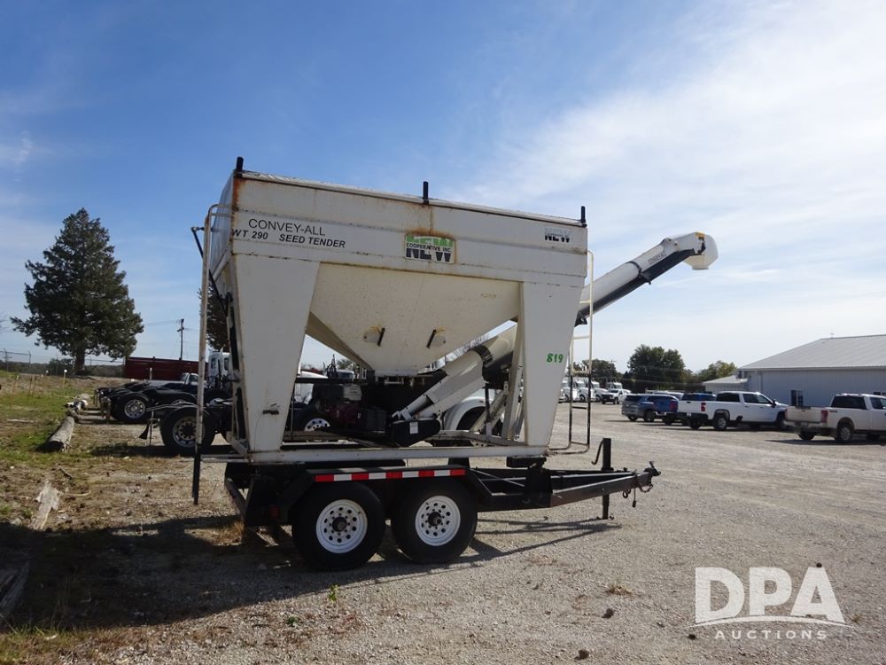 2006 Convey-All Seed Tender (PZ13997, Unit 819), 2006 Convey-All WT290 - SP seed tender (S/N 062691), front pivoting conveyor, 2 compartment, Avery Weigh-Tronix model 640XL scale, Honda GX390 13 hp electric start gas engine, 2006 Convey-All tandem axle trailer, bumper hitch, LT235/85R16 tires.