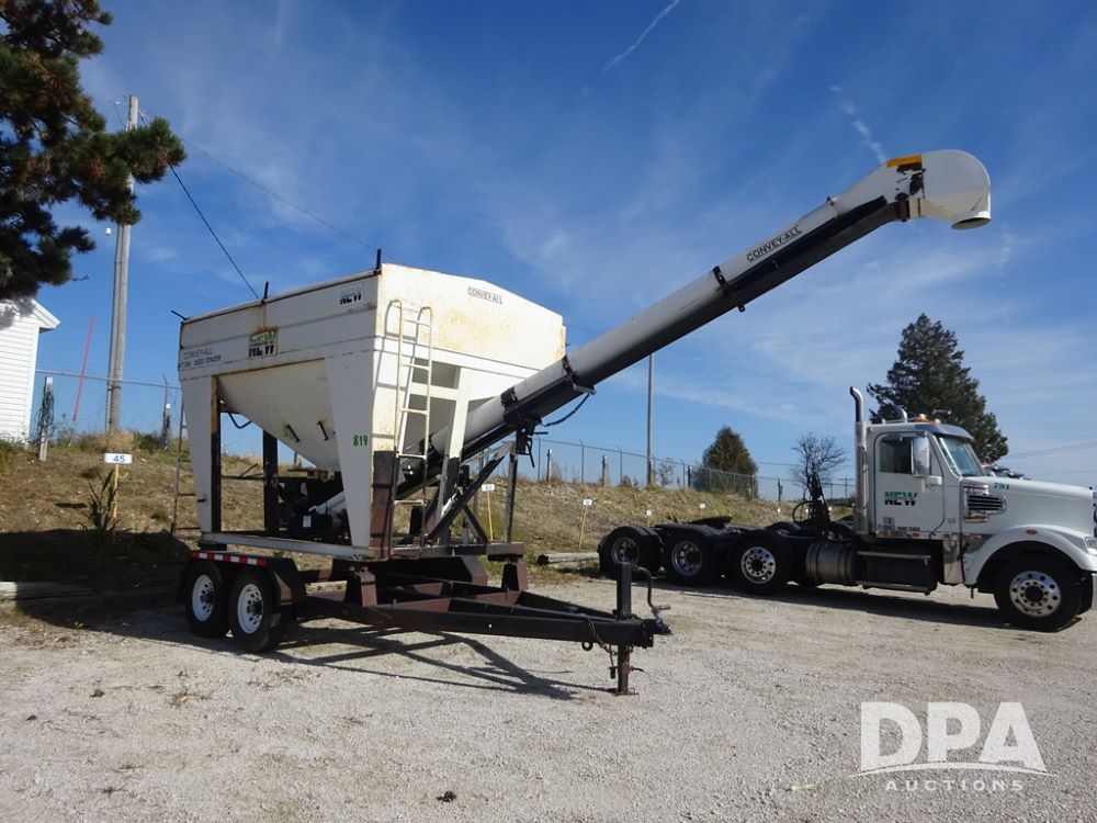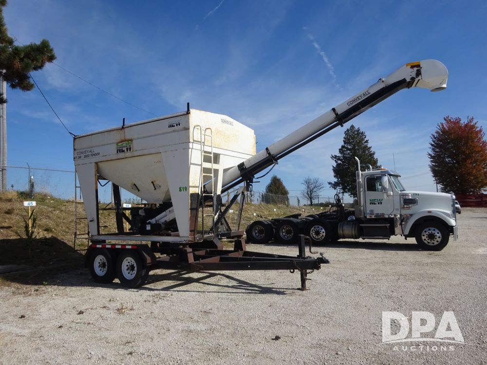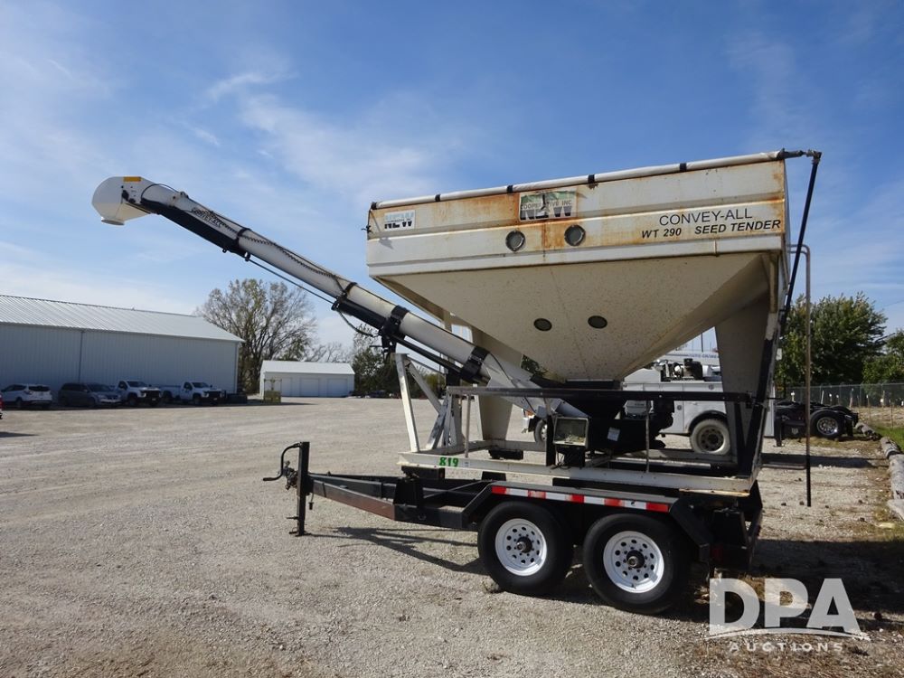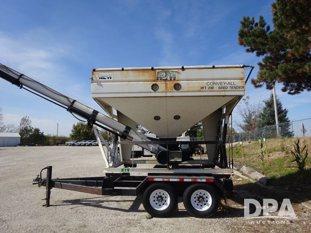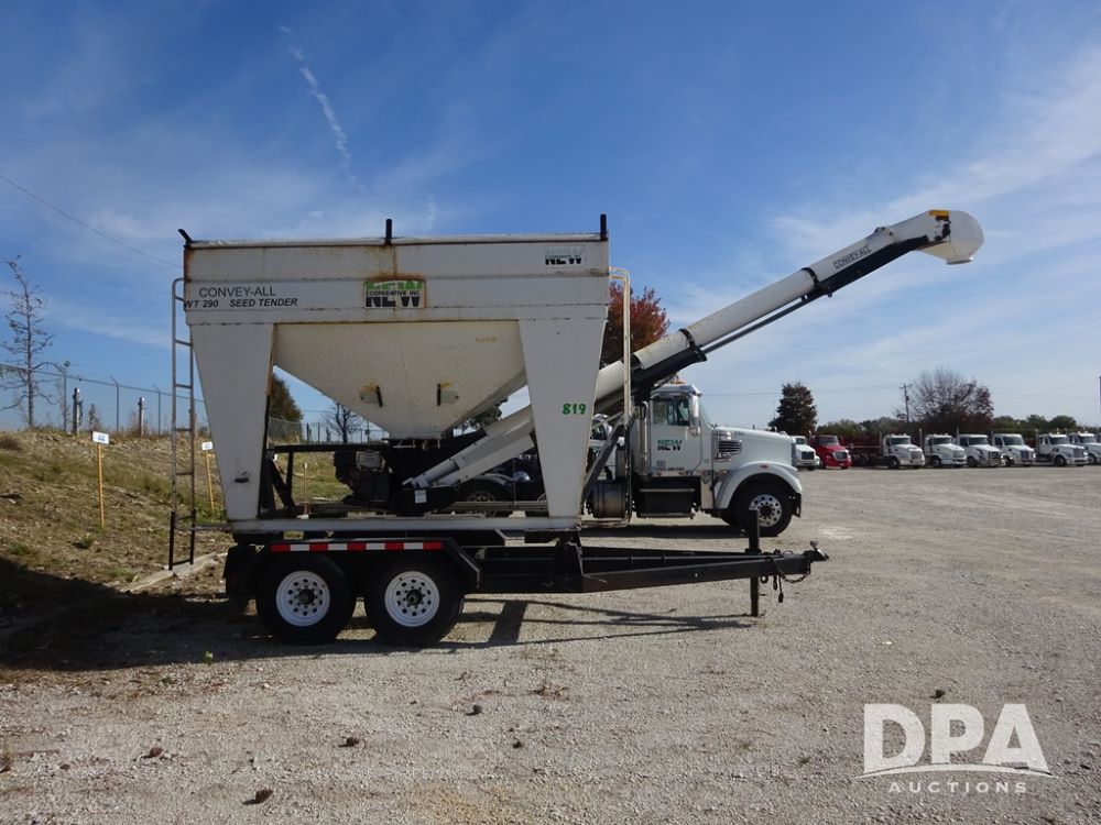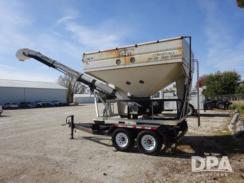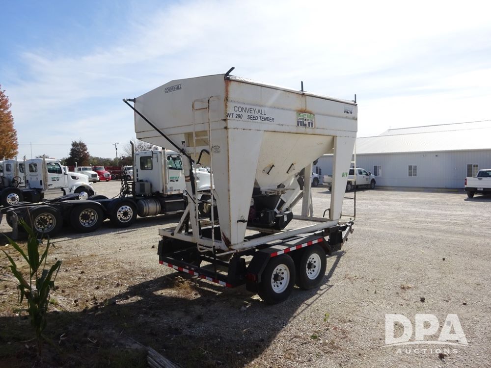 2006 Convey-All Seed Tender (PZ13997, Unit 819), 2006 Convey-All WT290 - SP seed tender (S/N 062691), front pivoting conveyor, 2 compartment, Avery Weigh-Tronix model 640XL scale, Honda GX390 13 hp electric start gas engine, 2006 Convey-All tandem axle trailer, bumper hitch, LT235/85R16 tires.