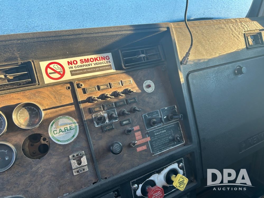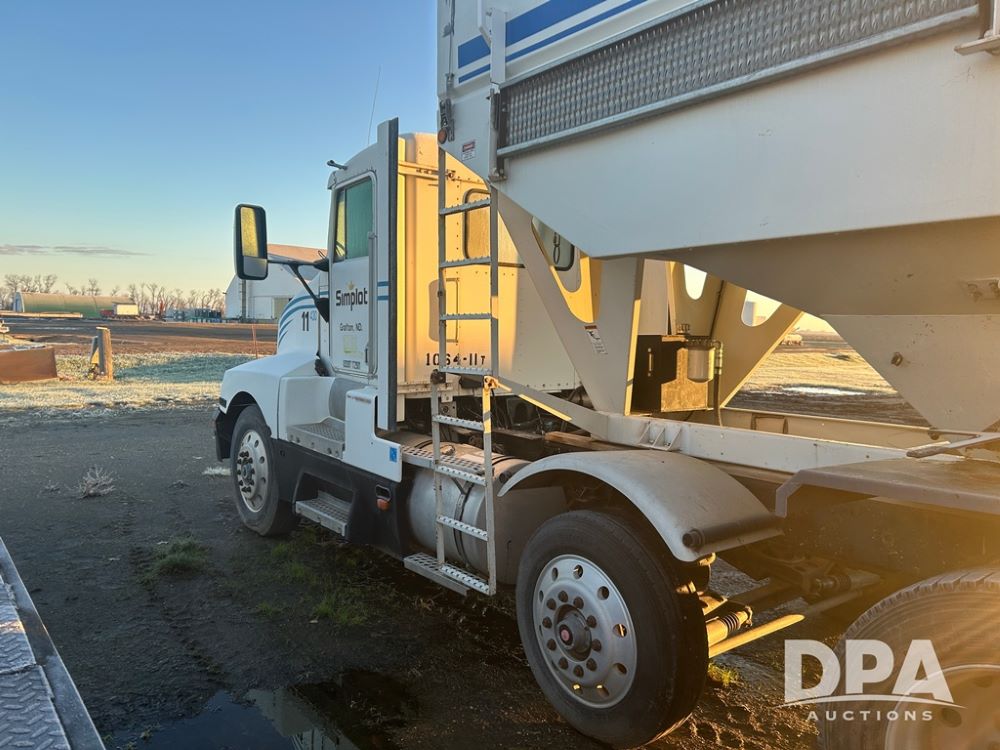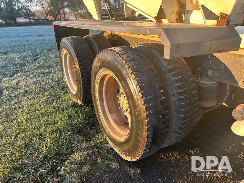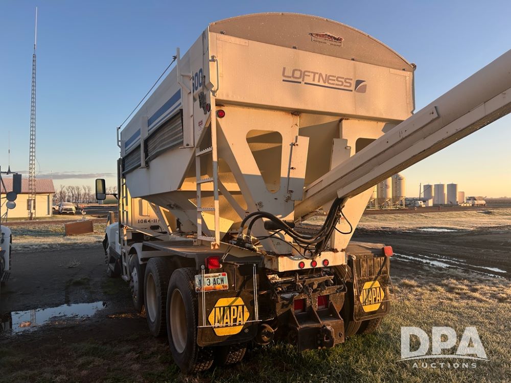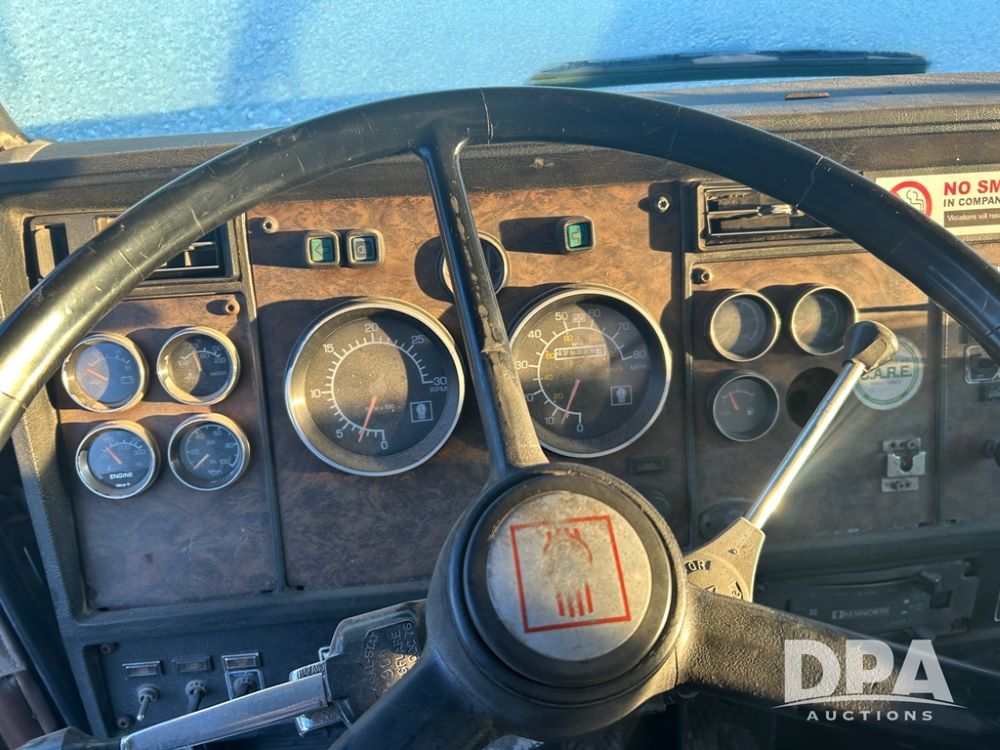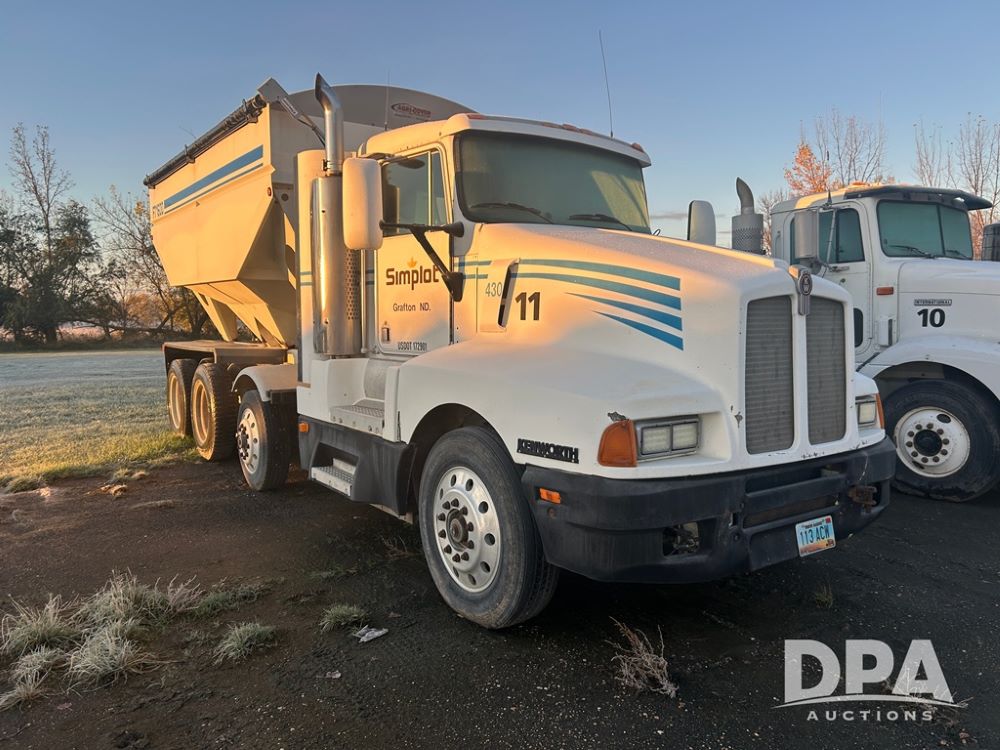 1991 Kenworth Dry Truck (CP1202 Unit 557793), model T600, NON RUNNER, Cat diesel engine, 13 speed transmission, tandem axle full screw, air ride suspension, air lift tag axle, Loftness FT1600 stainless steel hydraulic dry tender box, rear discharge auger, rear pup hookups, electric roll over tarp, engine brake, dual aluminum fuel tanks, 22.5 tires, aluminum wheels.