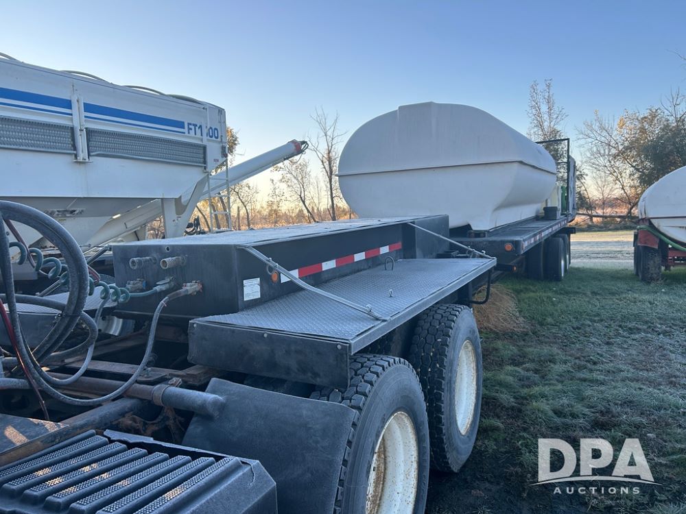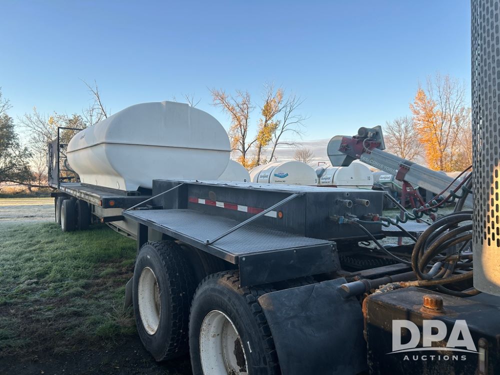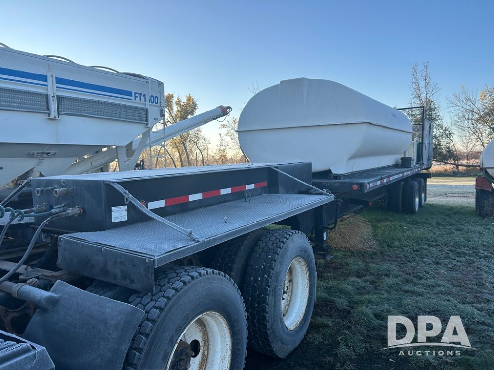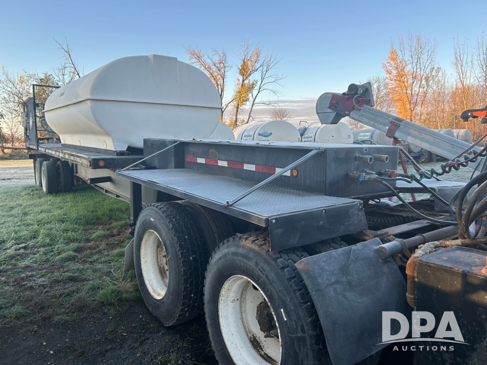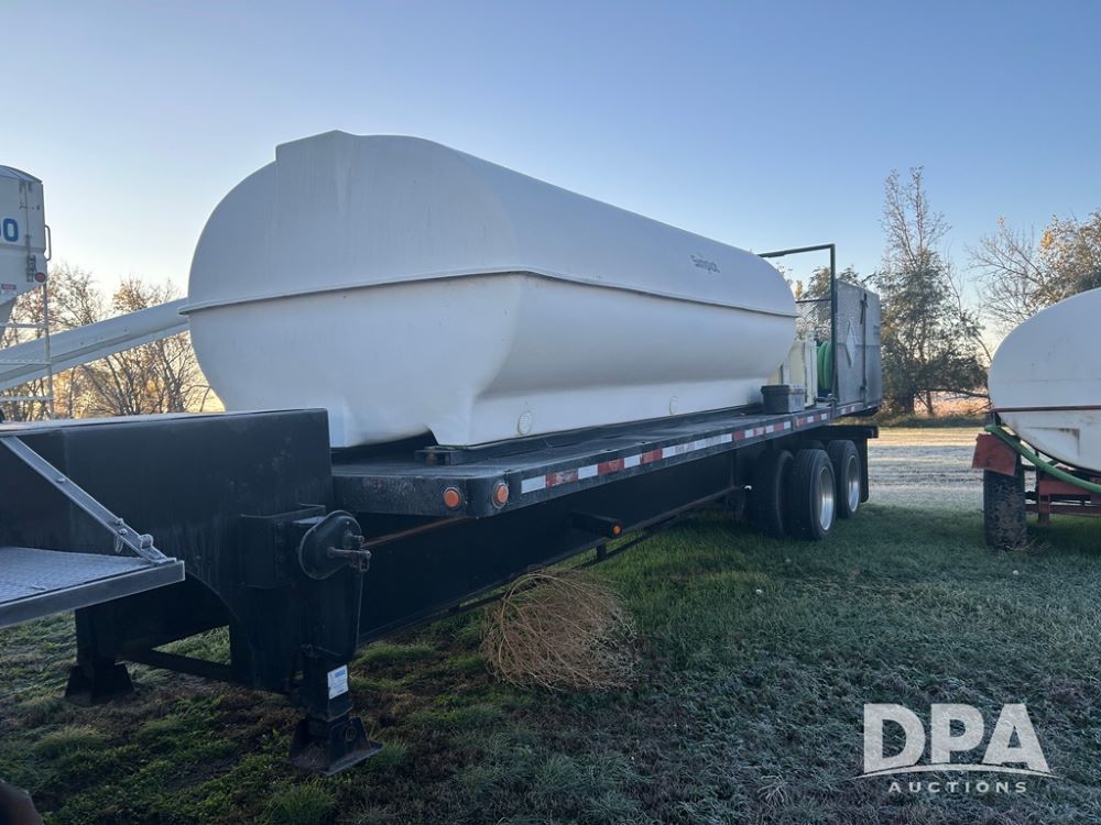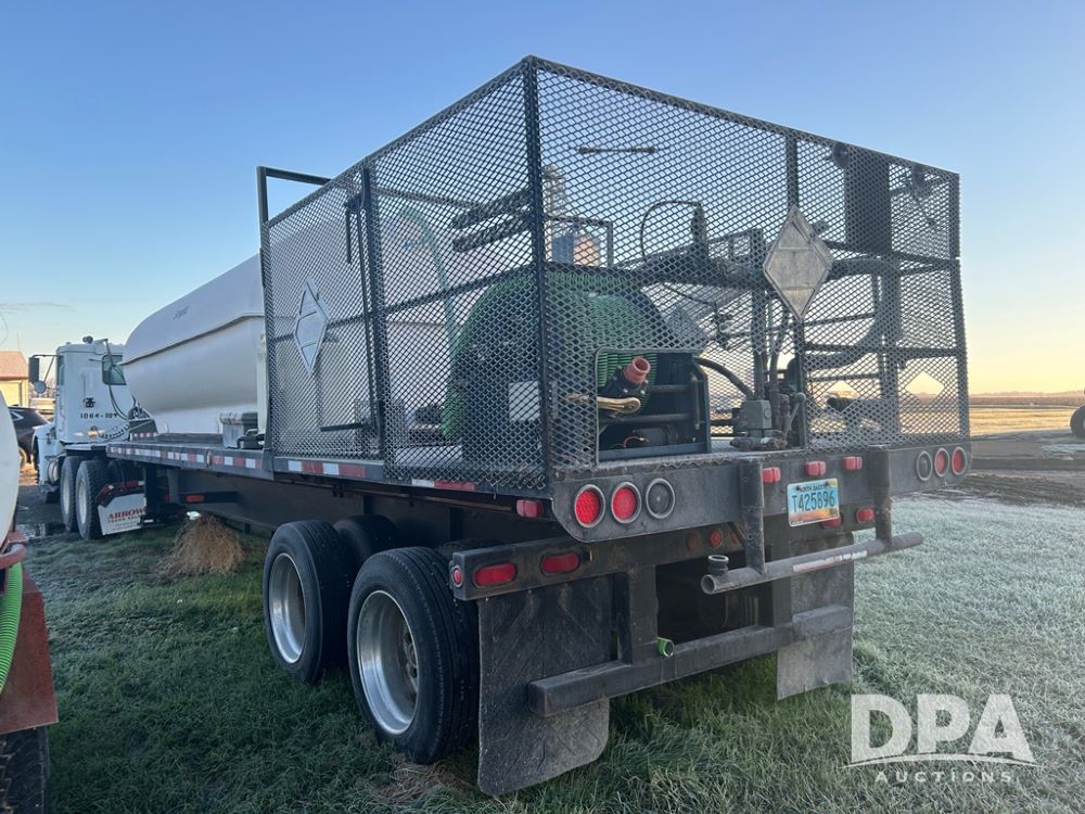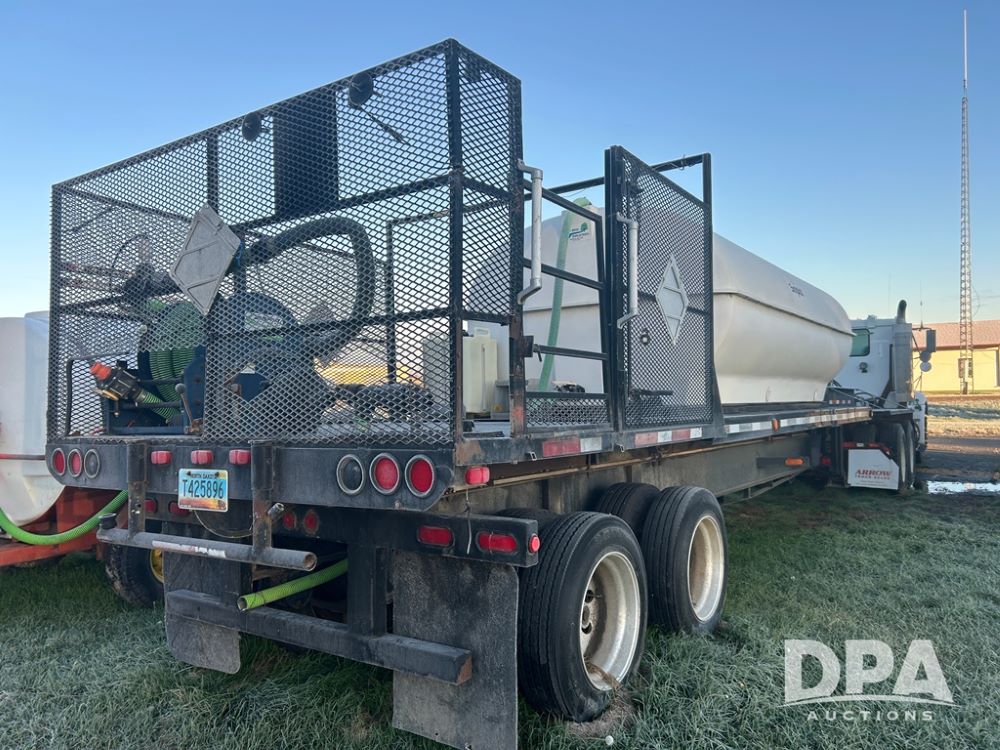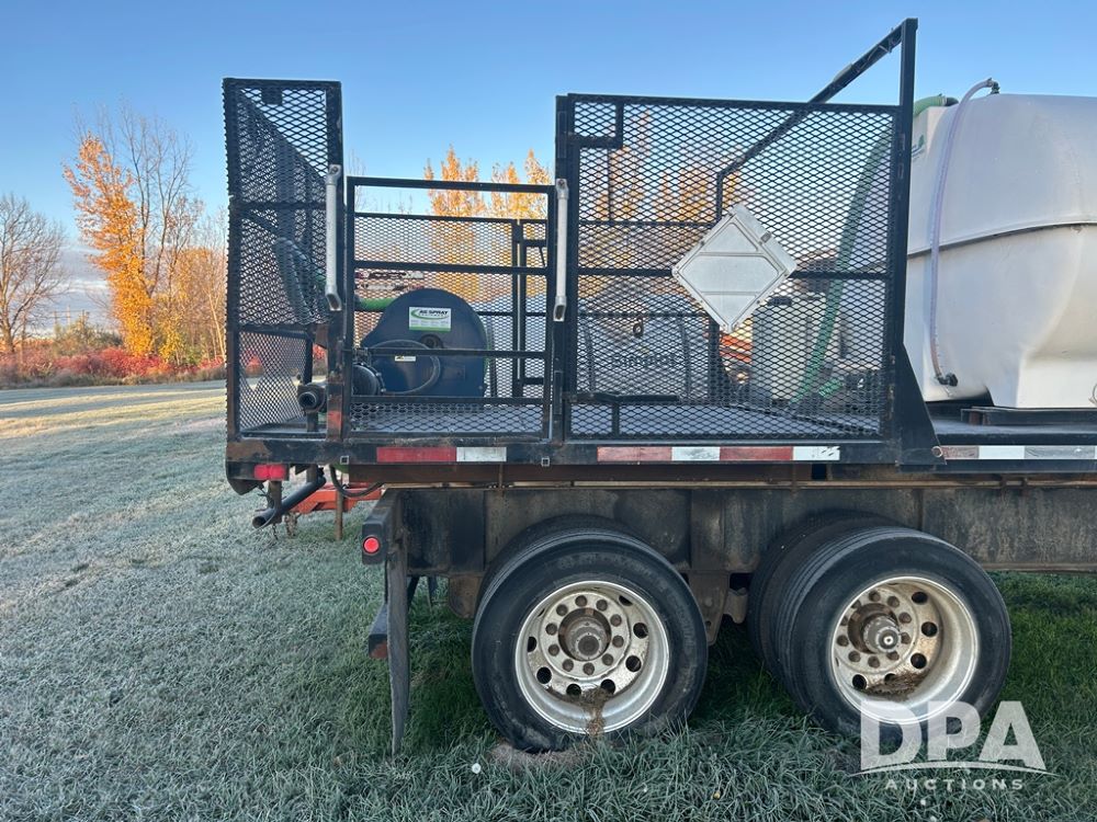 2002 B&B Liquid Trailer (CP1204), steel deck trailer, 3000 gallon fiberglass liquid tank, 3'' hose reel, hydraulic liquid pump, rear shuttle rack, tandem axle spring suspension, 255/70R22.5 tires, aluminum wheels.