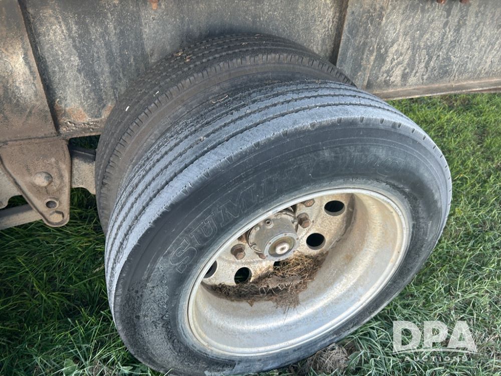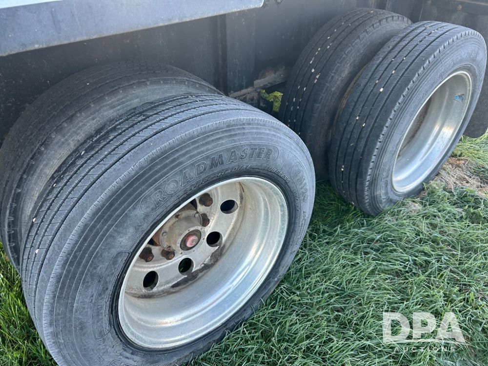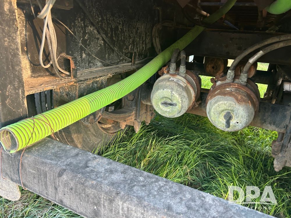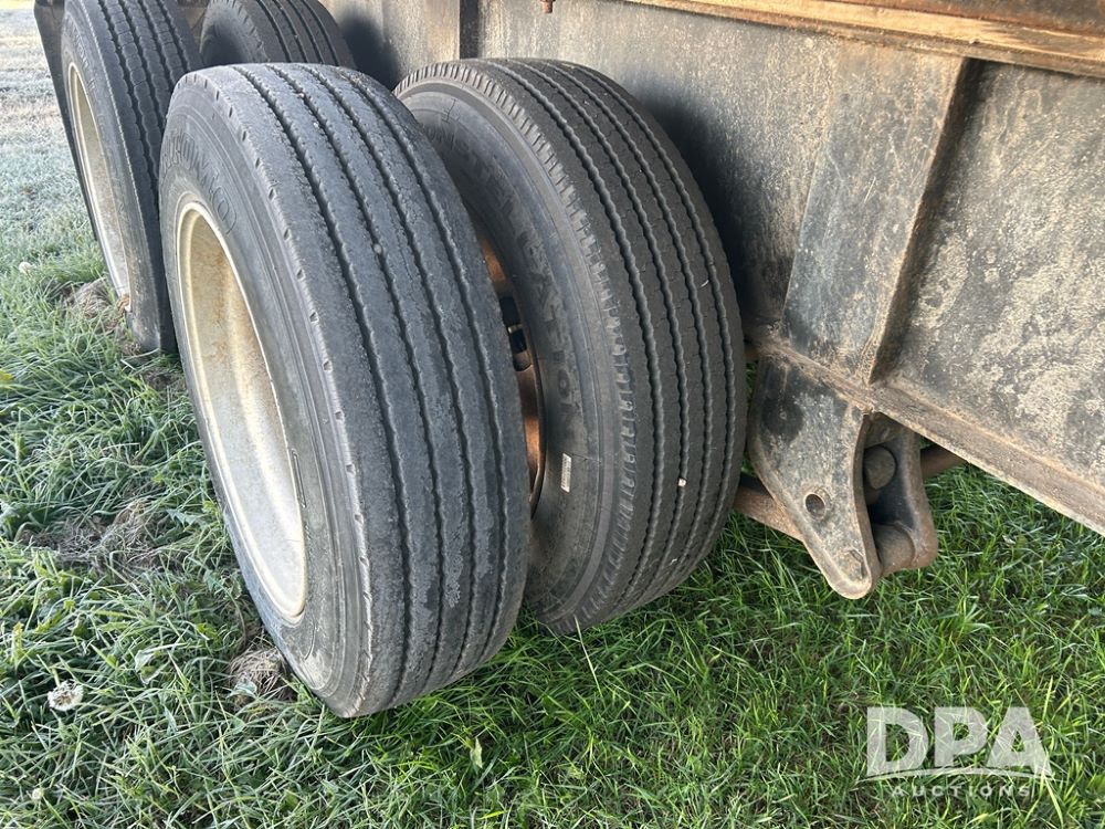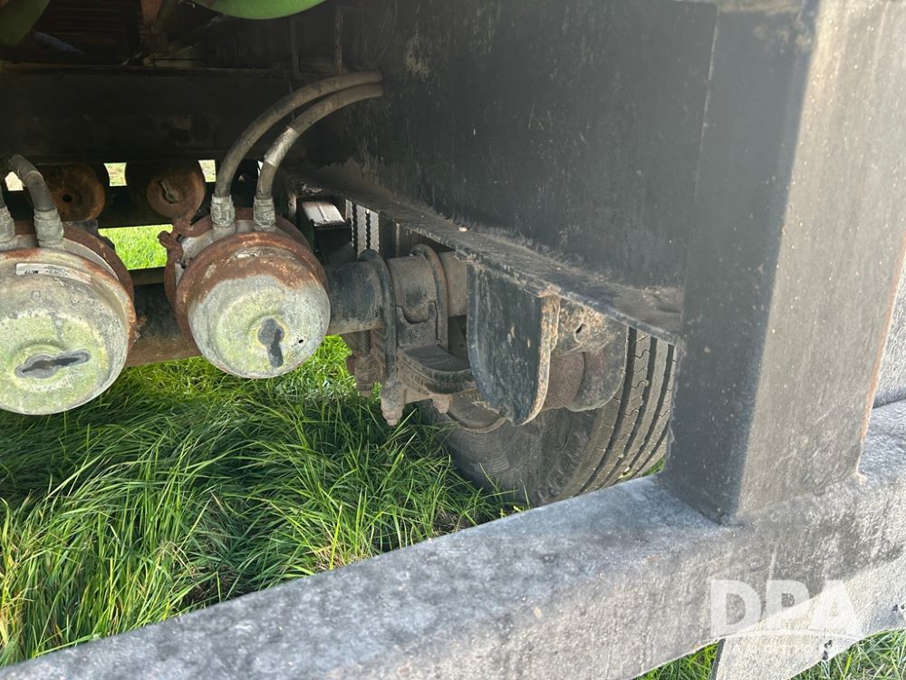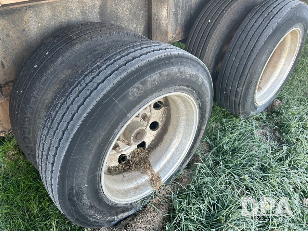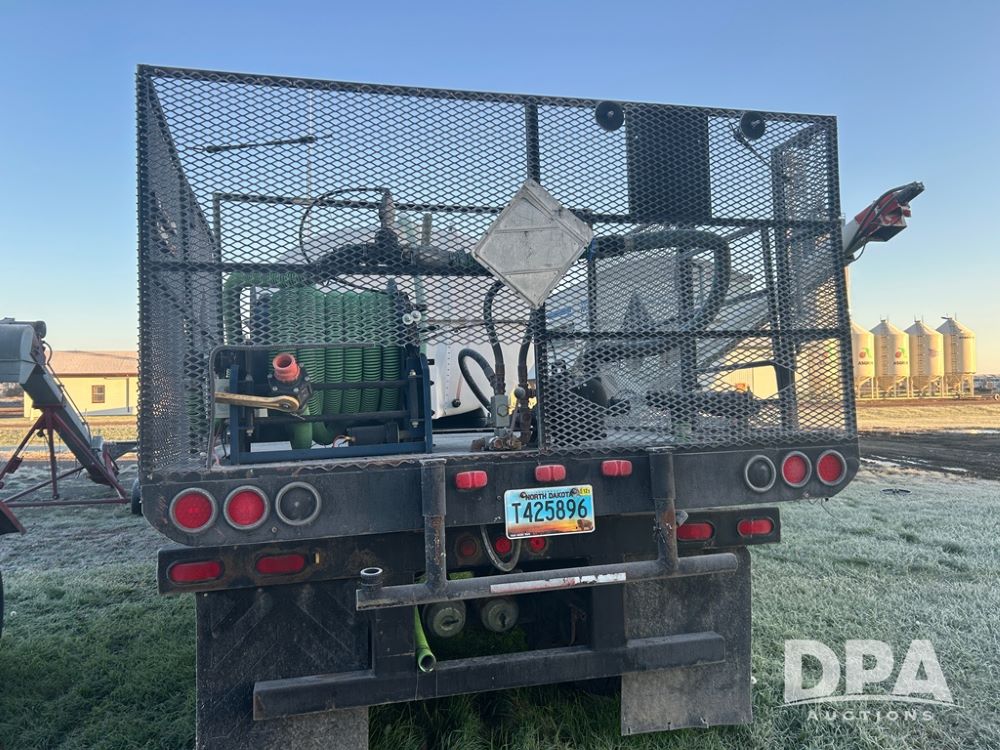 2002 B&B Liquid Trailer (CP1204), steel deck trailer, 3000 gallon fiberglass liquid tank, 3'' hose reel, hydraulic liquid pump, rear shuttle rack, tandem axle spring suspension, 255/70R22.5 tires, aluminum wheels.