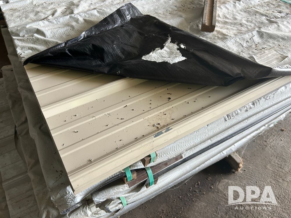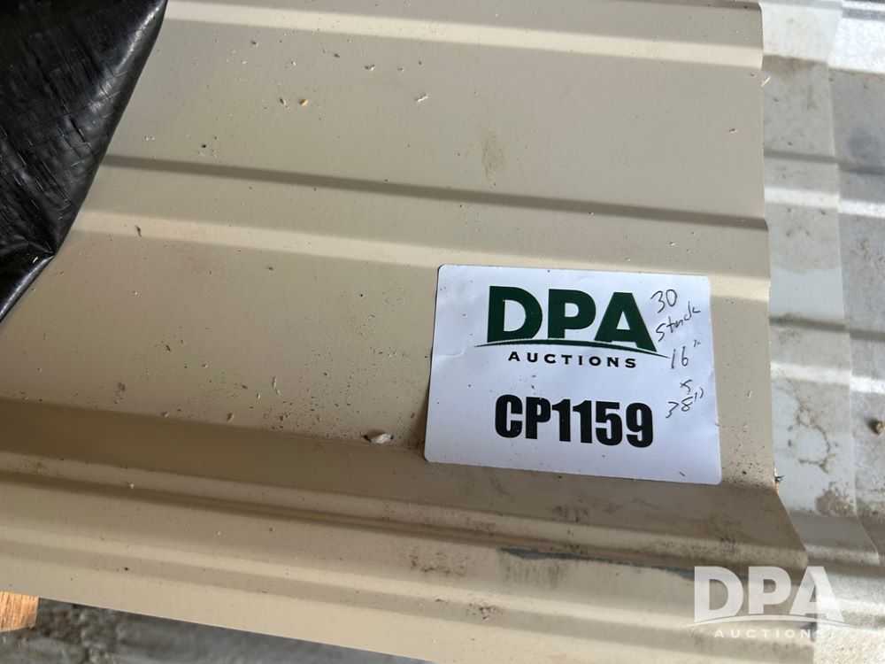 Metal Sheeting (CP1159), thirty (30) sheets, 16ft x 38in overlap coverage, tan in color, Premium Panel Loc Plus Profile style metal sheeting, 29 gauge, always stored inside.