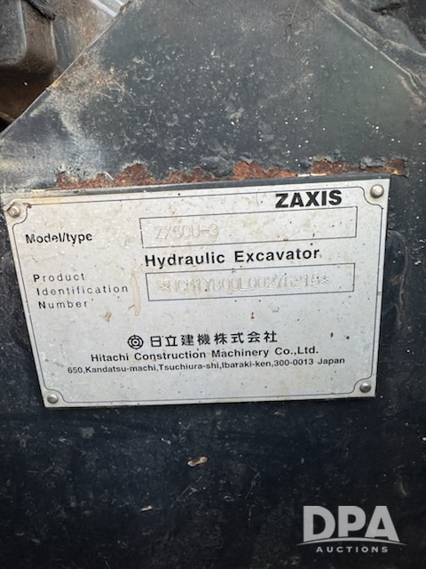 2013 Hitachi ZX50U Excavator (LLD1446), diesel engine, ROPs, has hook ups for hydraulic thumb, bucket, blade, shows 4,000 hours.