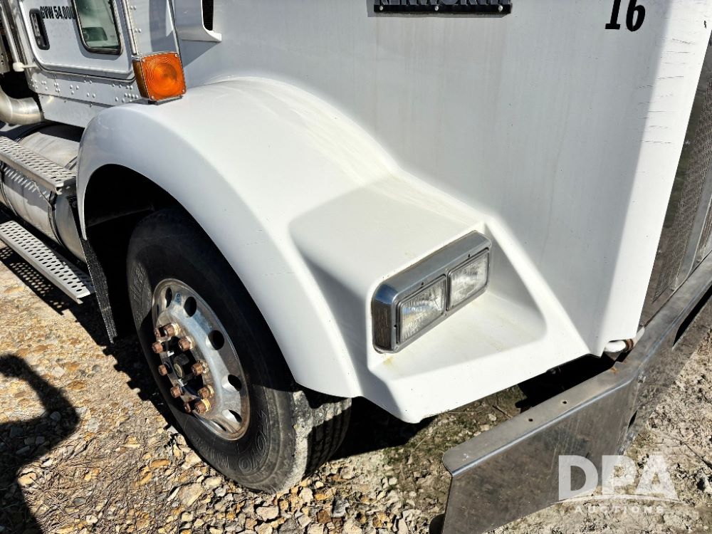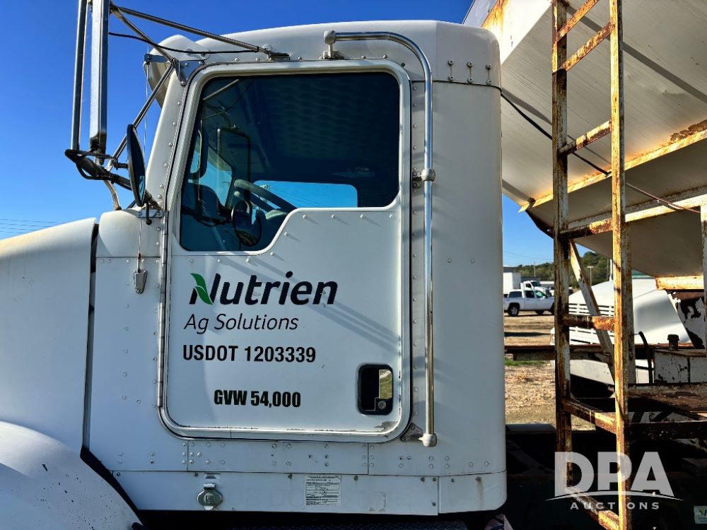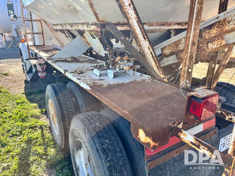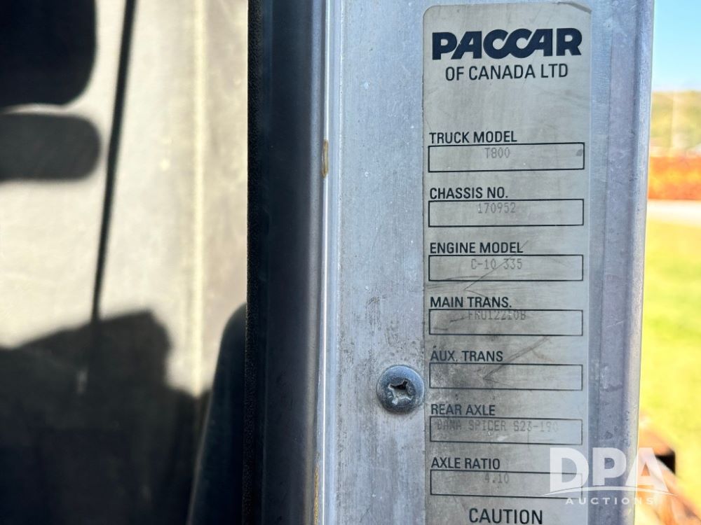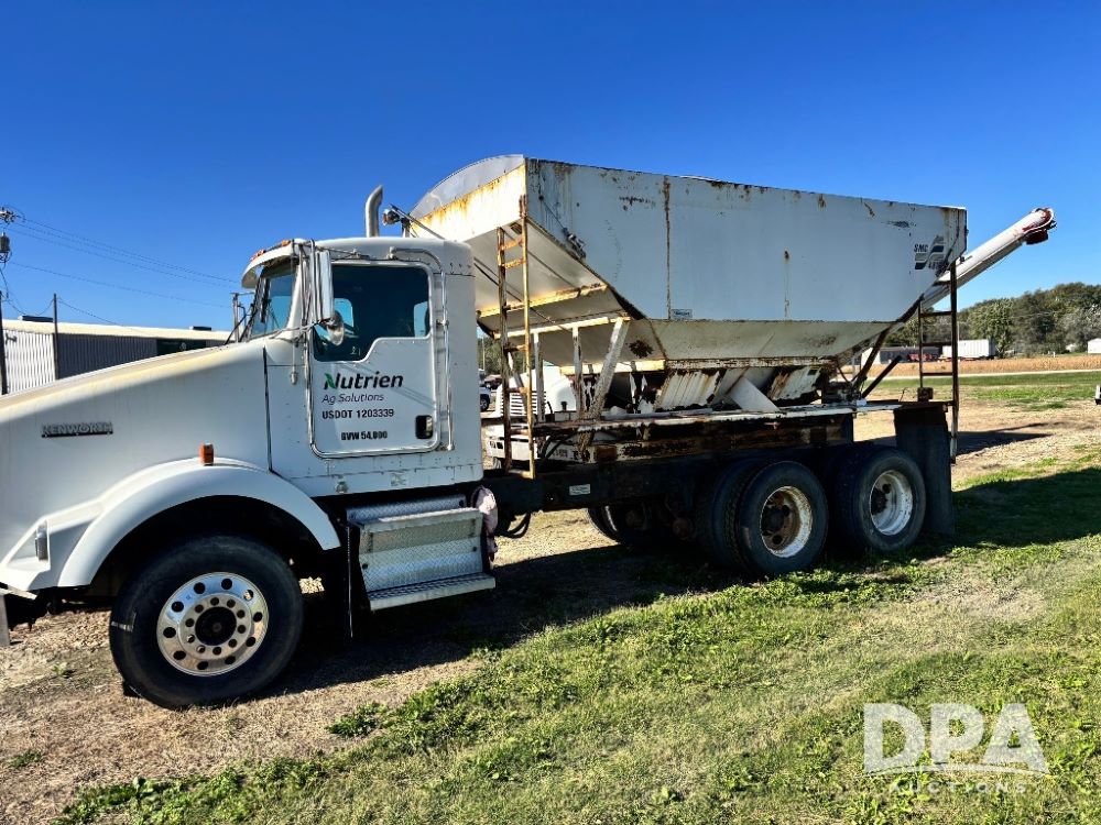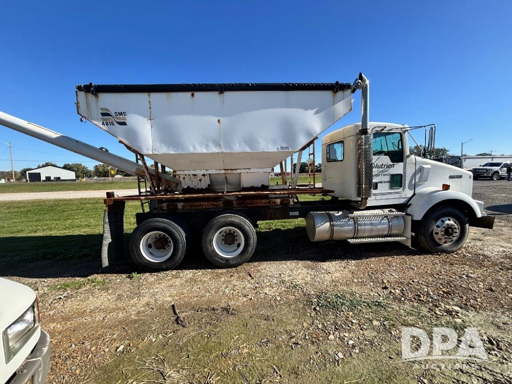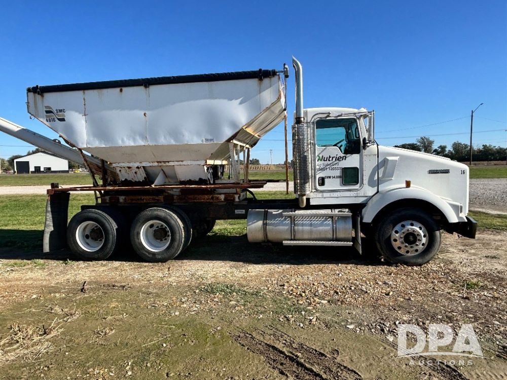 2007 Kenworth T800 Dry Tender Truck (GP11709, Unit 126179), Cat C11 Acert diesel engine, Eaton Fuller 10 speed transmission, heat, Am/Fm radio, cruise control, tandem axle, spring suspension, Simonsen SMC 4816 dry tender box, 16 ton capacity, rear discharge auger, hydraulic, roll tarp, single fuel tank, single exhaust, 11R22.5 tires, axle ratio 4.10, shows 434,974 miles.