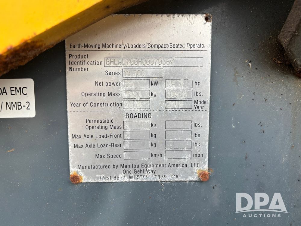 2018 Gehl 750 Wheel Loader (JY0999, Unit 302), 2018 Gehl Model 750 wheel loader, OROPS, Deutz 4 cylinder diesel engine (74HP), hydrostatic transmission, joystick controls, auxiliary hydraulics, MDS approx. 7' quick attach bucket, Mitas 405/70-20 tires, shows 1,263 hours.