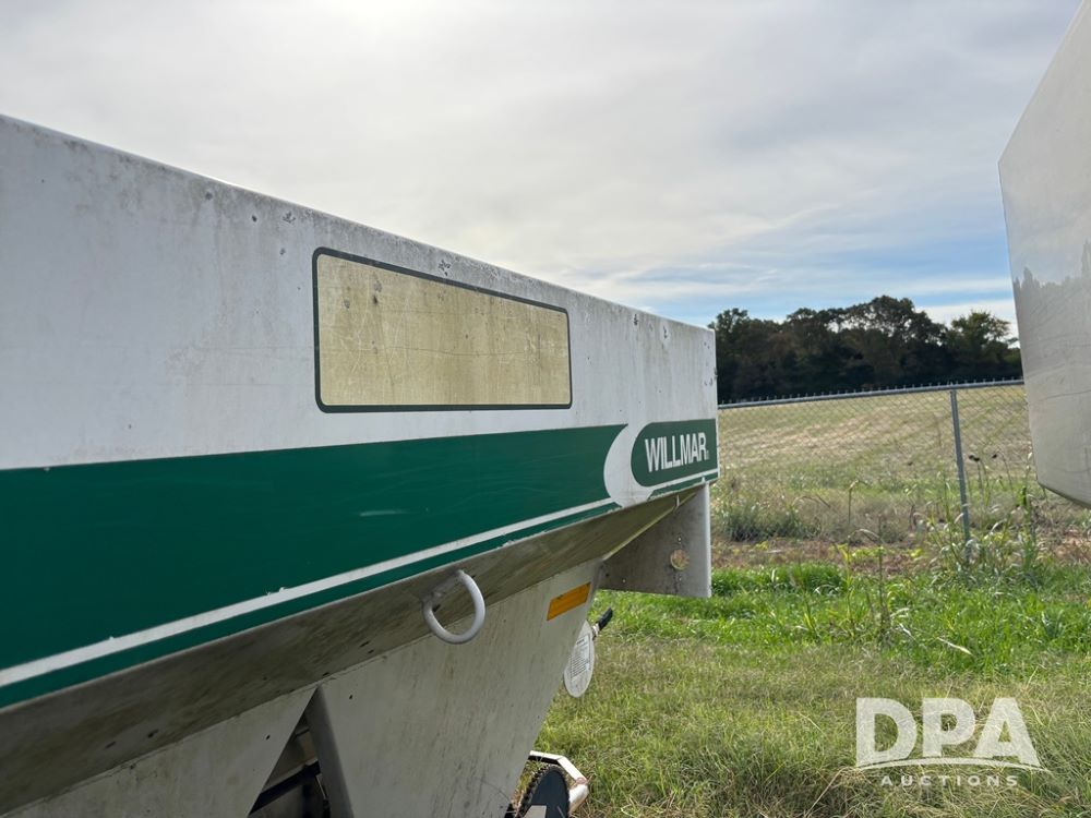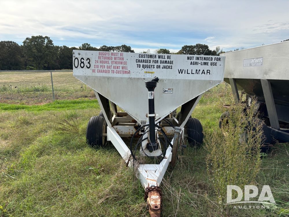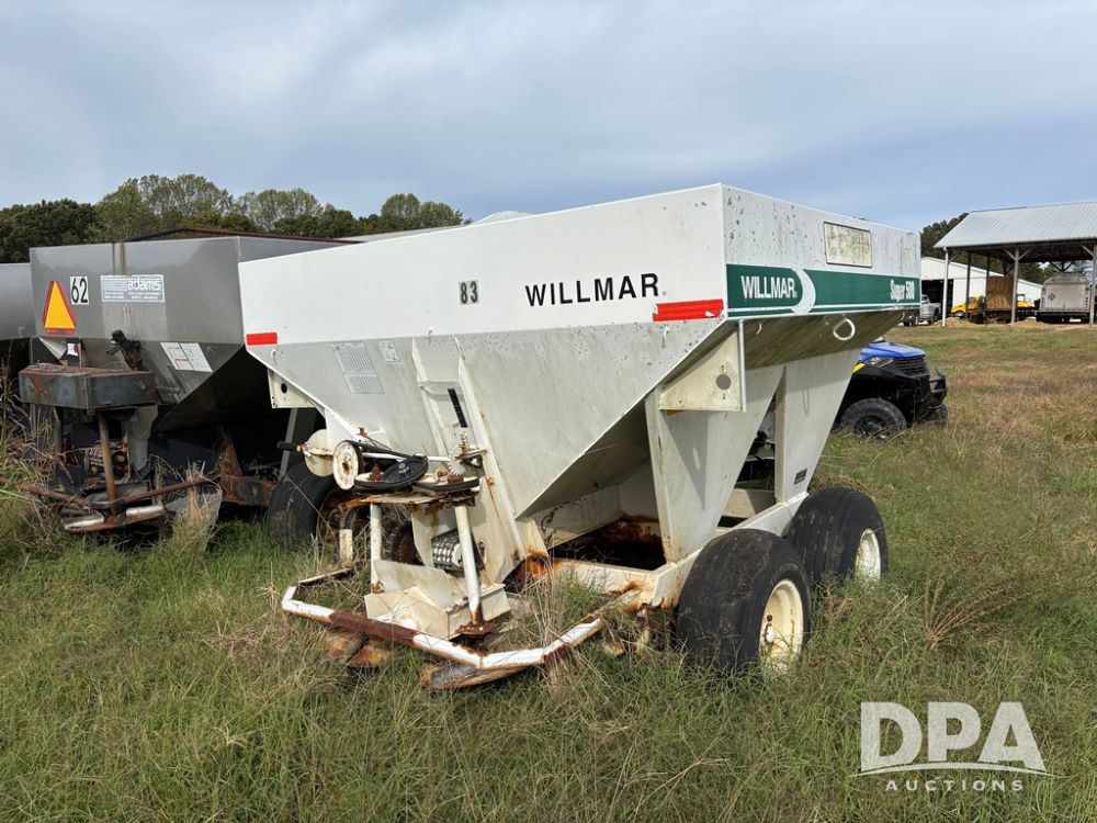 Willmar Super 500 Dry Spreader (JY0987, Unit 83), Willmar Model Super 500 pull type dry spreader, narrow track, 540 PTO drive, hydraulic twin spinners, tandem axle, 11L15 flotation tires.