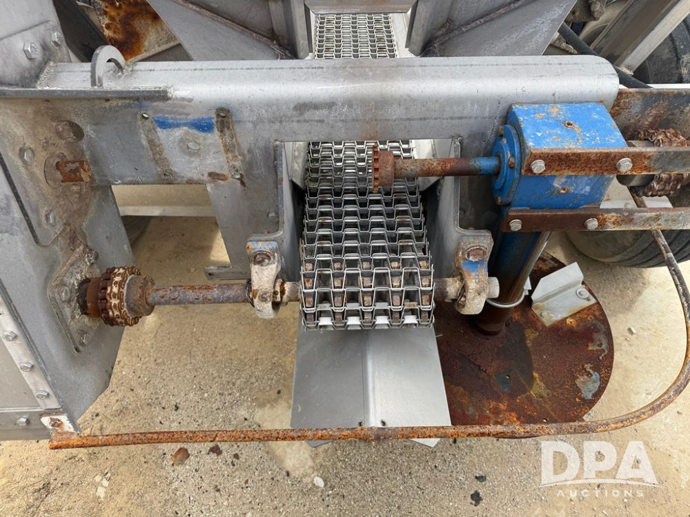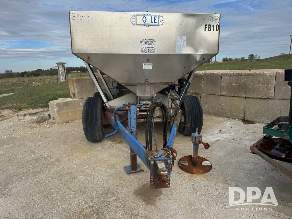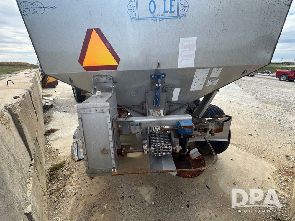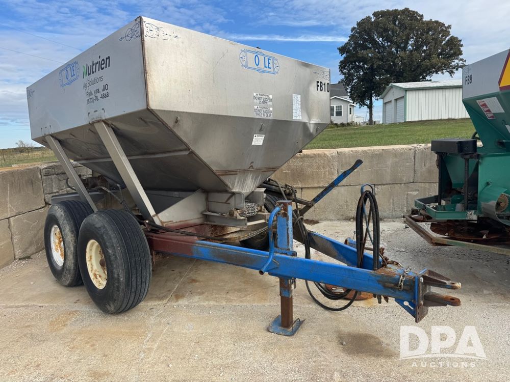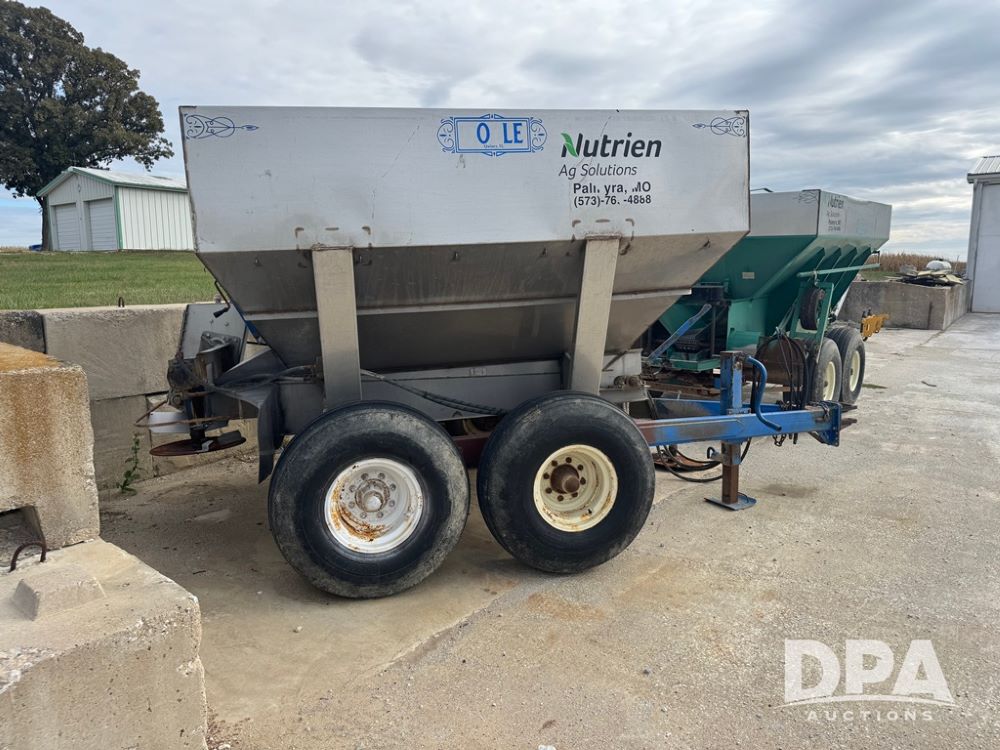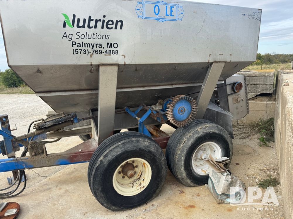 Doyle Stainless Steel Dry Spreader (NP6205), Doyle stainless steel pull type dry spreader, tandem axle, flotation tires, missing a rear spinner.
