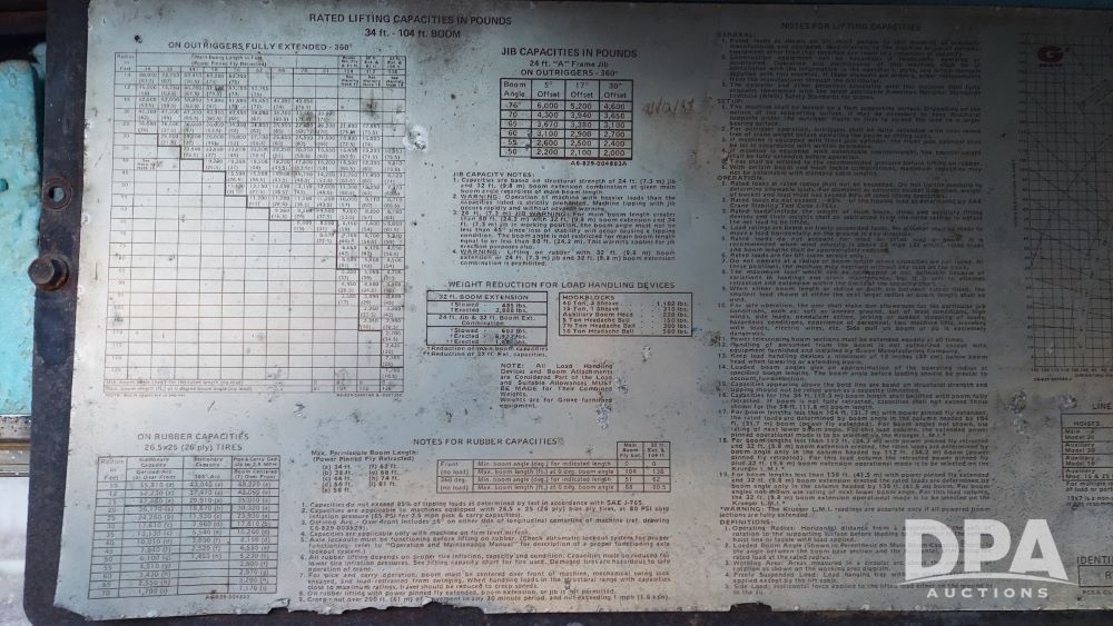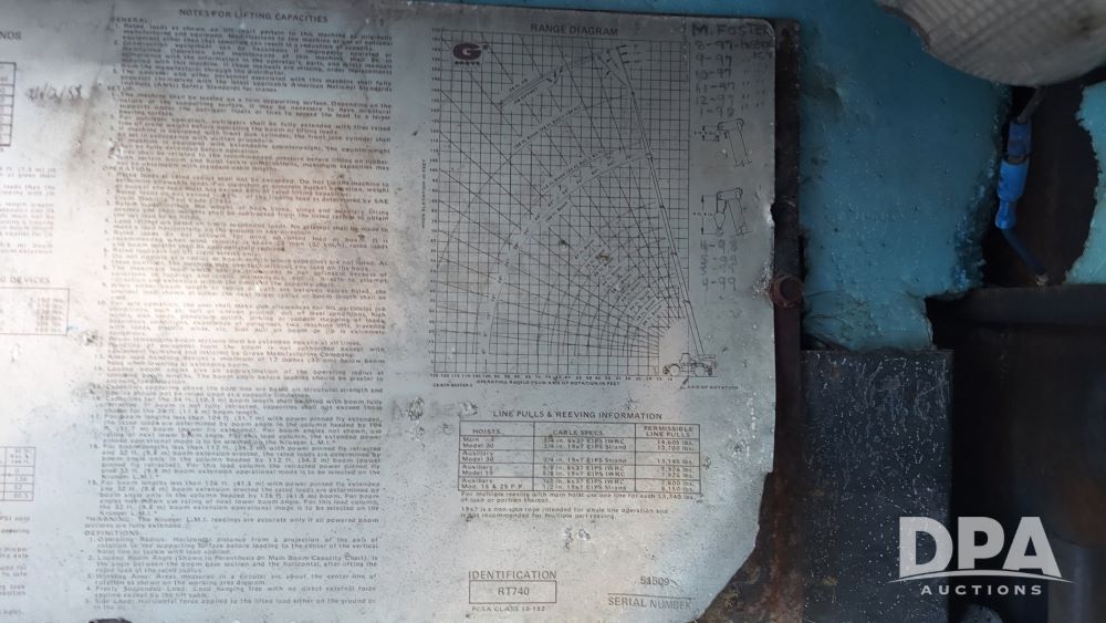 1984 Grove RT740 Crane (PD5256), 1984 Grove RT740 crane, Cummins engine (P/N 3802748-PX), 45 ton, 34-104' boom, 26.5-25 tires, hours unknown.