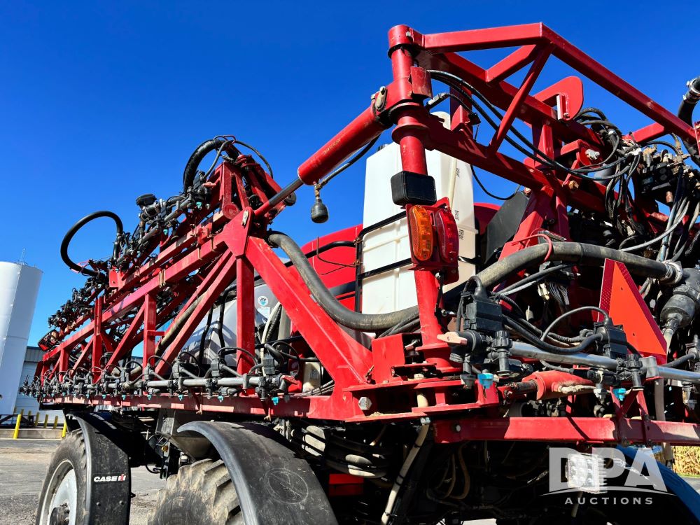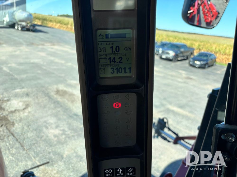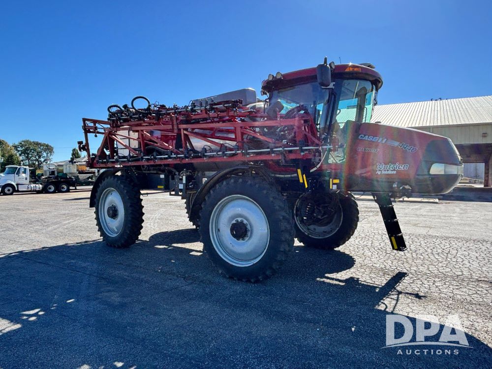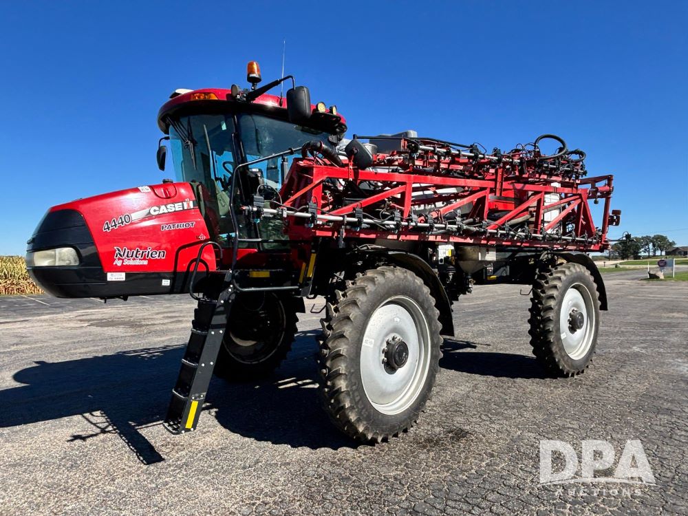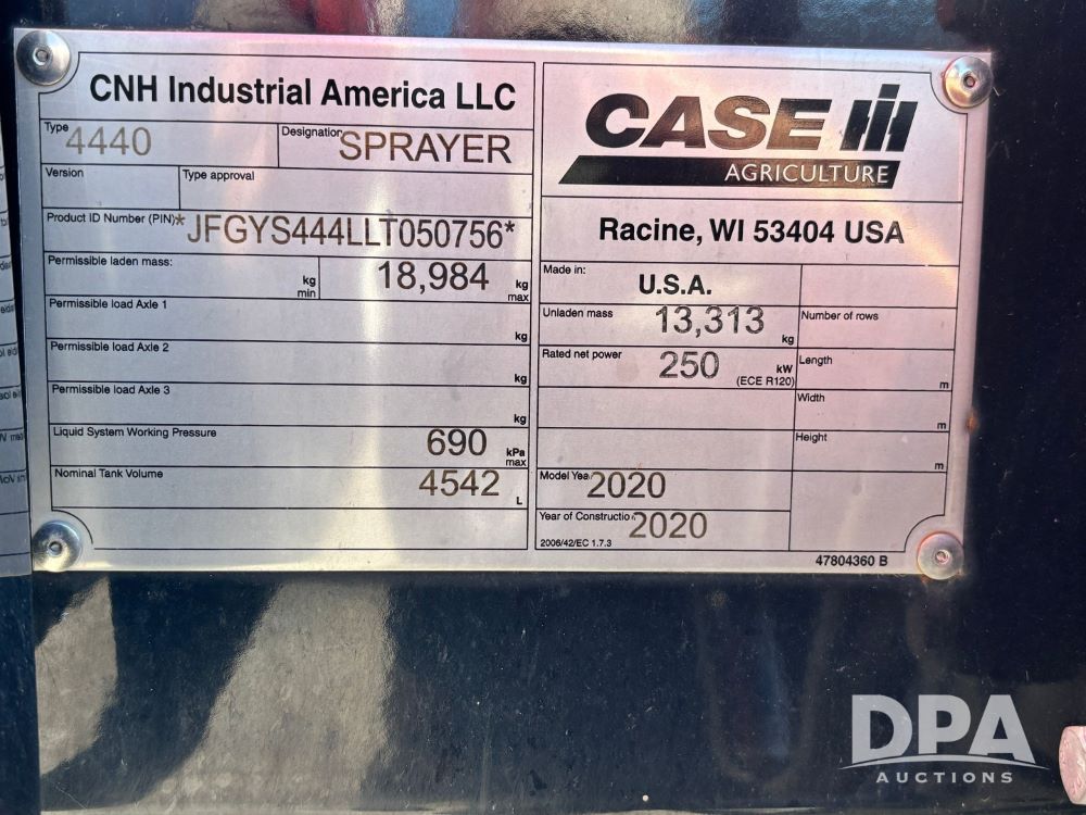 2020 CaseIH Patriot 4440 Sprayer (GP11649, Unit 127807), diesel engine, hydrostatic transmission, air conditioning, heat, Am/Fm CD radio, buddy seat, beacon light, 1200 gallon stainless steel liquid system, 120' boom, top poly rinse tank, stainless steel chemical inductor, 2 - 40 gallon poly direct injection tanks, Raven Sidekick pro pump, front fill, Firestone 380/90R46 tires, fenders, Cab camera, Raven Viper 4 monitor, shows 3,101 hours.