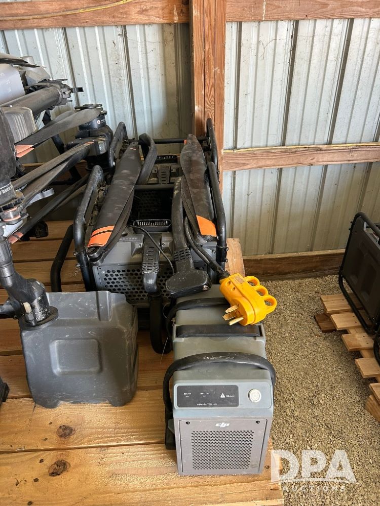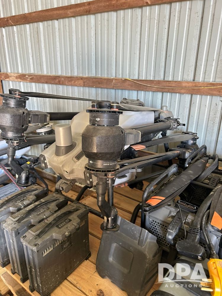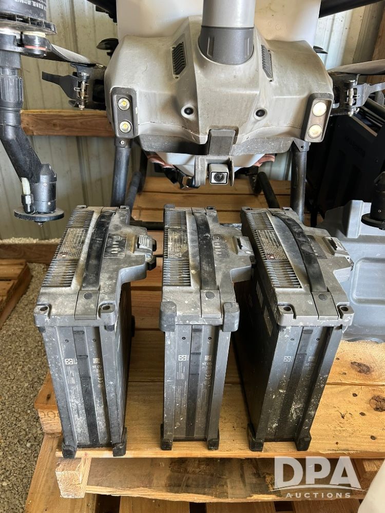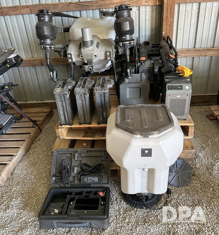 T40 Drone With Remote (LLD1463), 1 T40 Drone with remote, 1 remote charger, 1 C8000 battery charger, 3 db1560 batteries, 2 cooling stations with cables, 110 v ac adapter, 1 set of spare propellers with spacers, 1 spreader tank with extra spreader disc, drone has 159 hours 44 mins flight time.