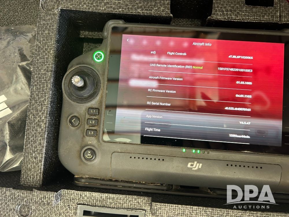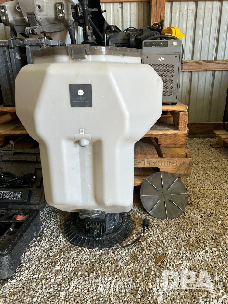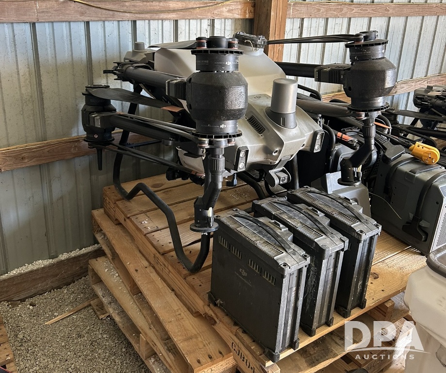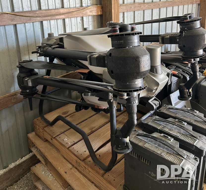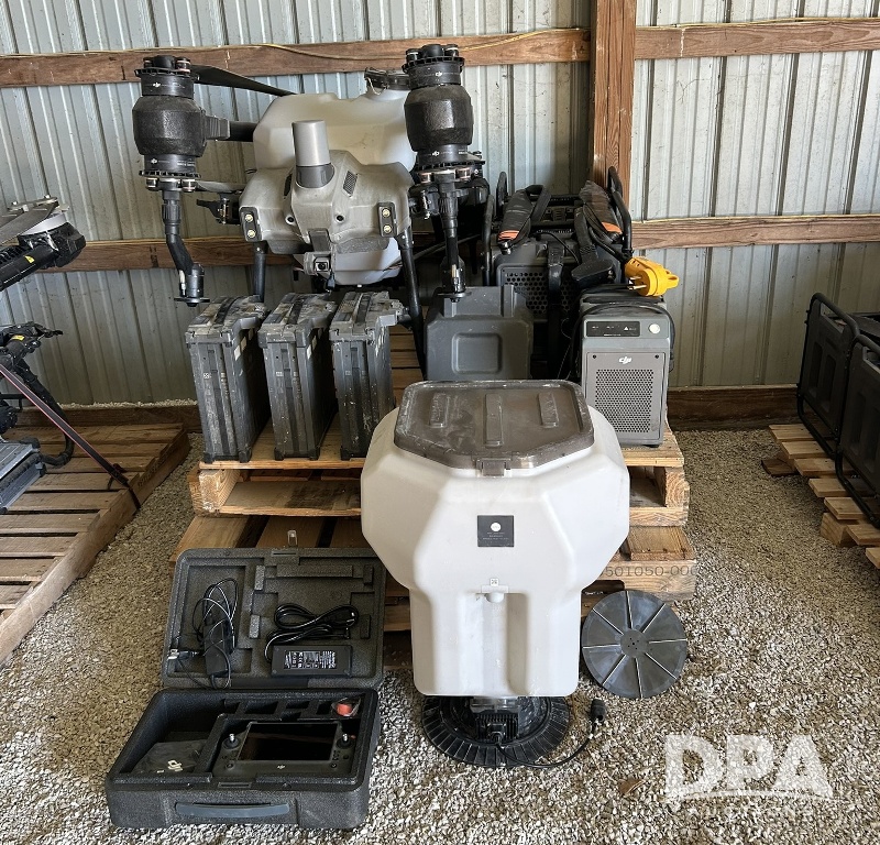 T40 Drone With Remote (LLD1463), 1 T40 Drone with remote, 1 remote charger, 1 C8000 battery charger, 3 db1560 batteries, 2 cooling stations with cables, 110 v ac adapter, 1 set of spare propellers with spacers, 1 spreader tank with extra spreader disc, drone has 159 hours 44 mins flight time.